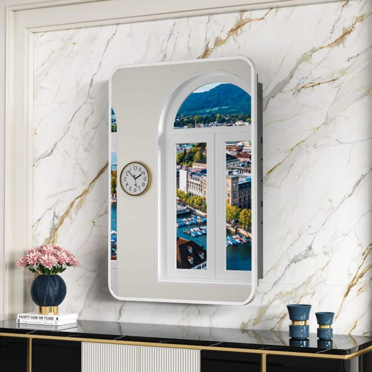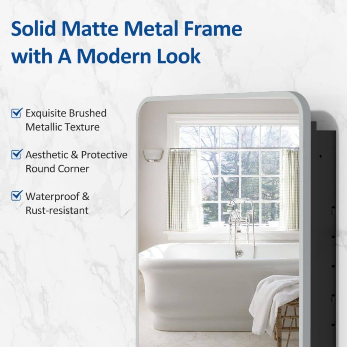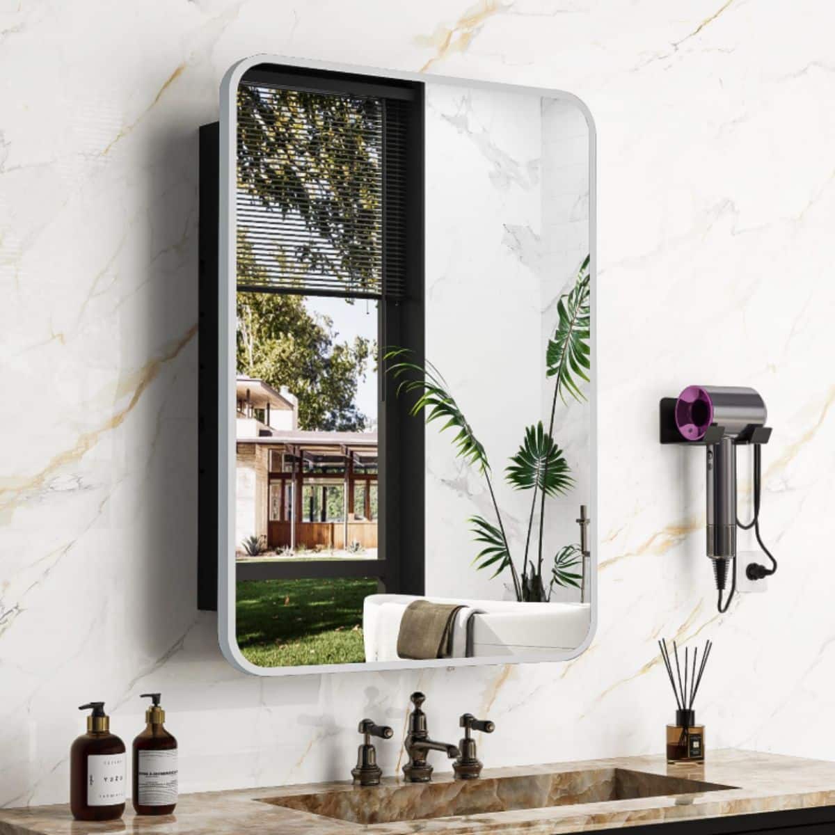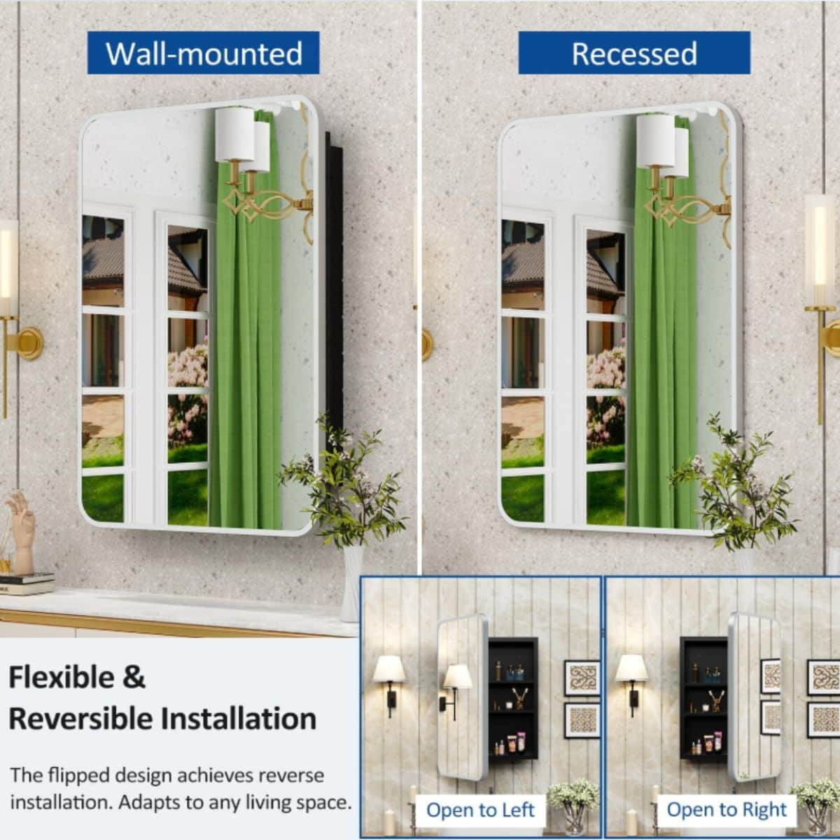 This 20×28 inch brushed silver recessed medicine cabinet offers stylish and practical storage for your bathroom. Its metal frame and mirror add a modern touch.