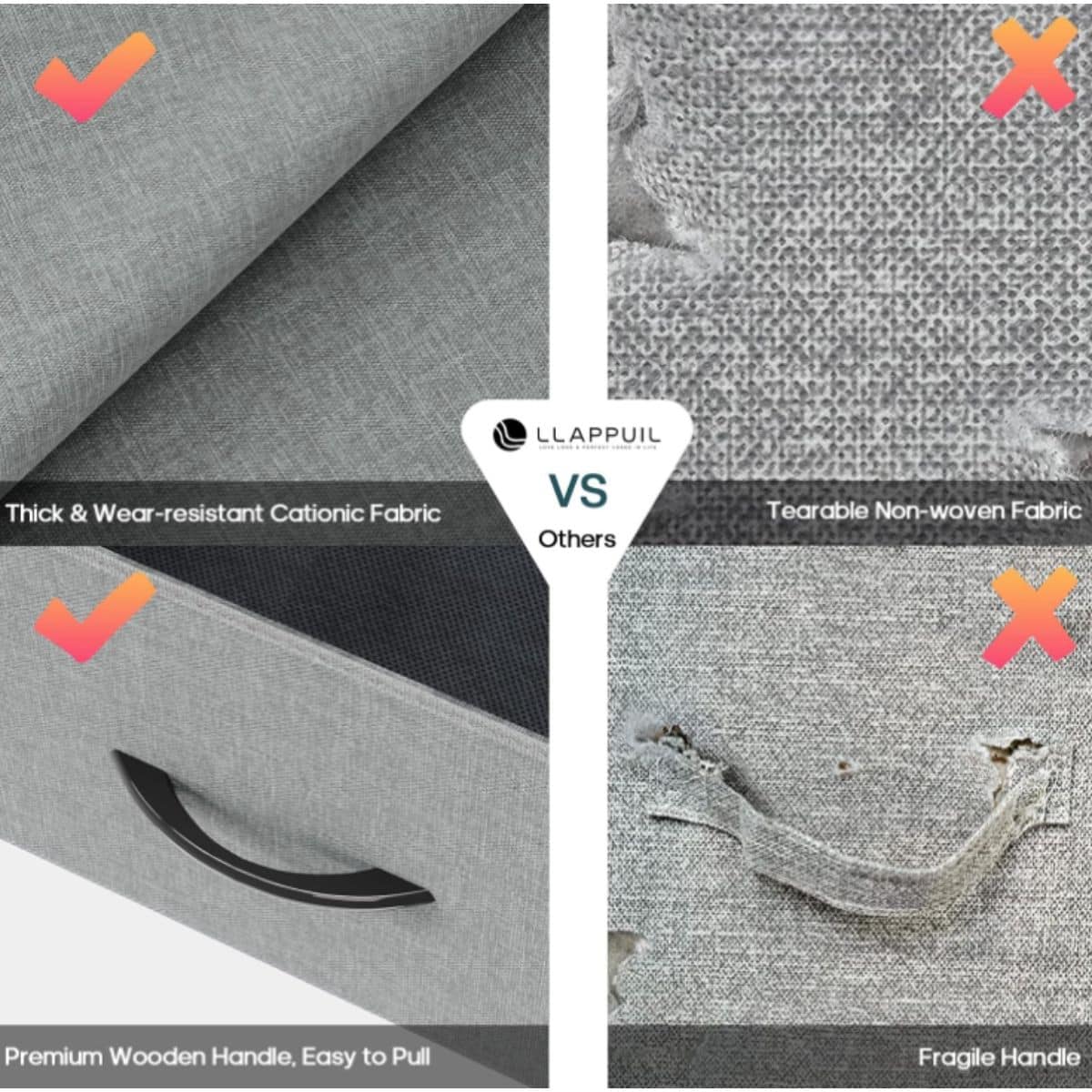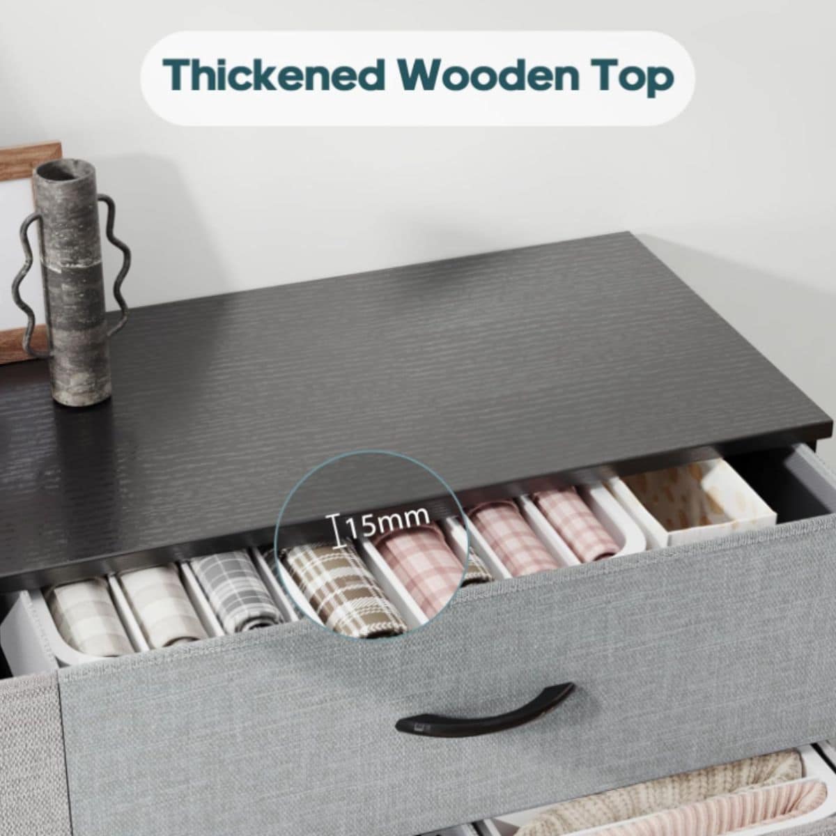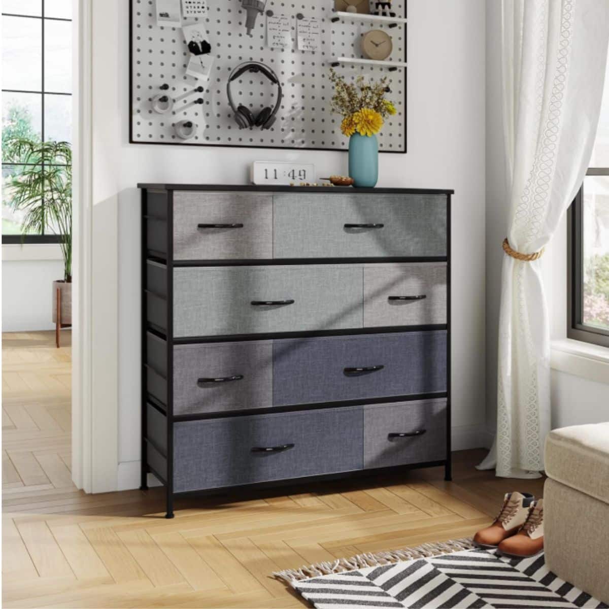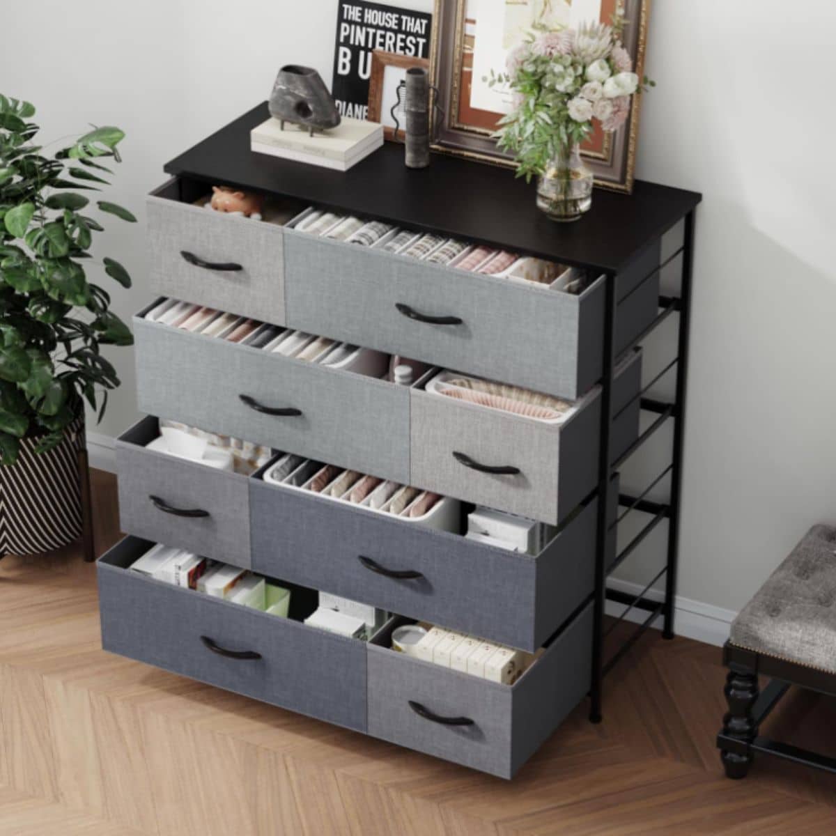 This 8 drawer dresser offers tall, spacious fabric storage with a sturdy metal frame and wood plate. Its easy-pull handles make it simple to use in any bedroom.