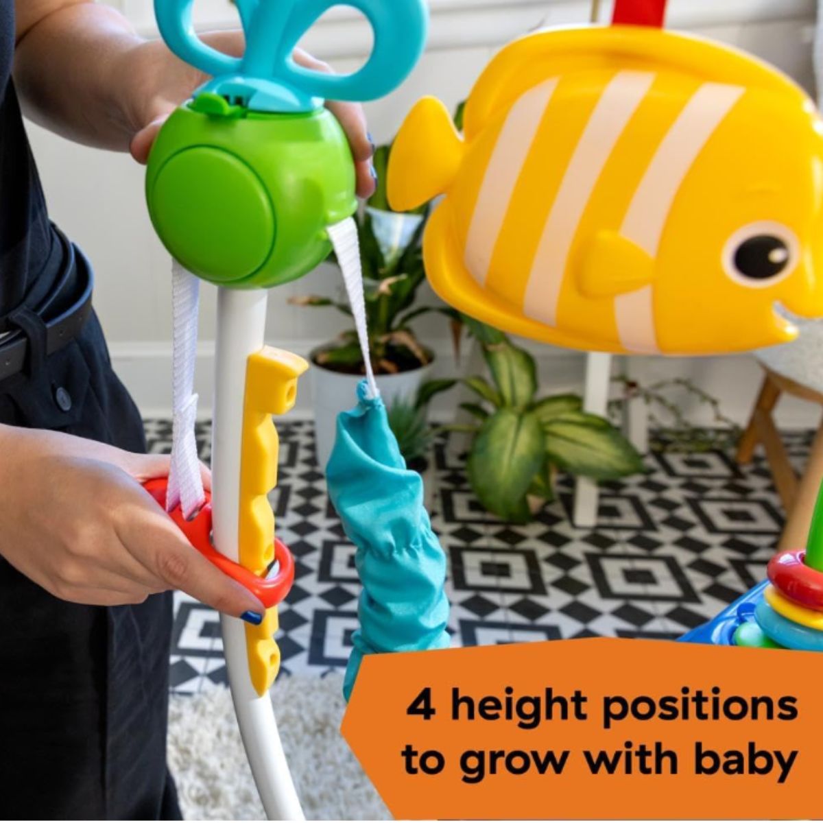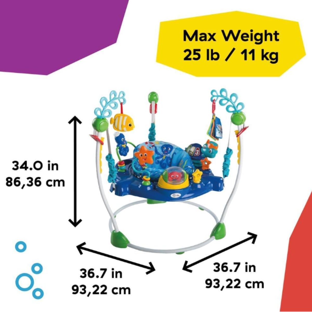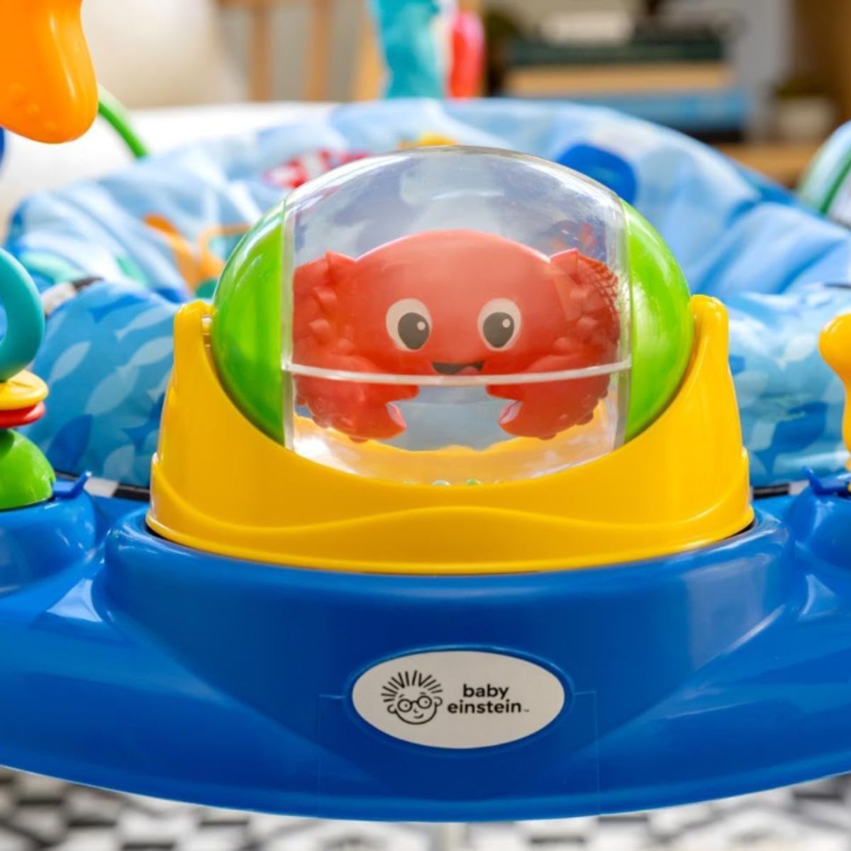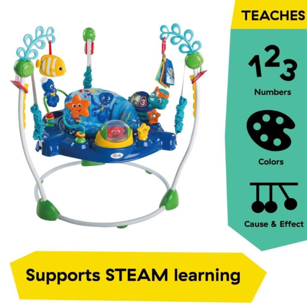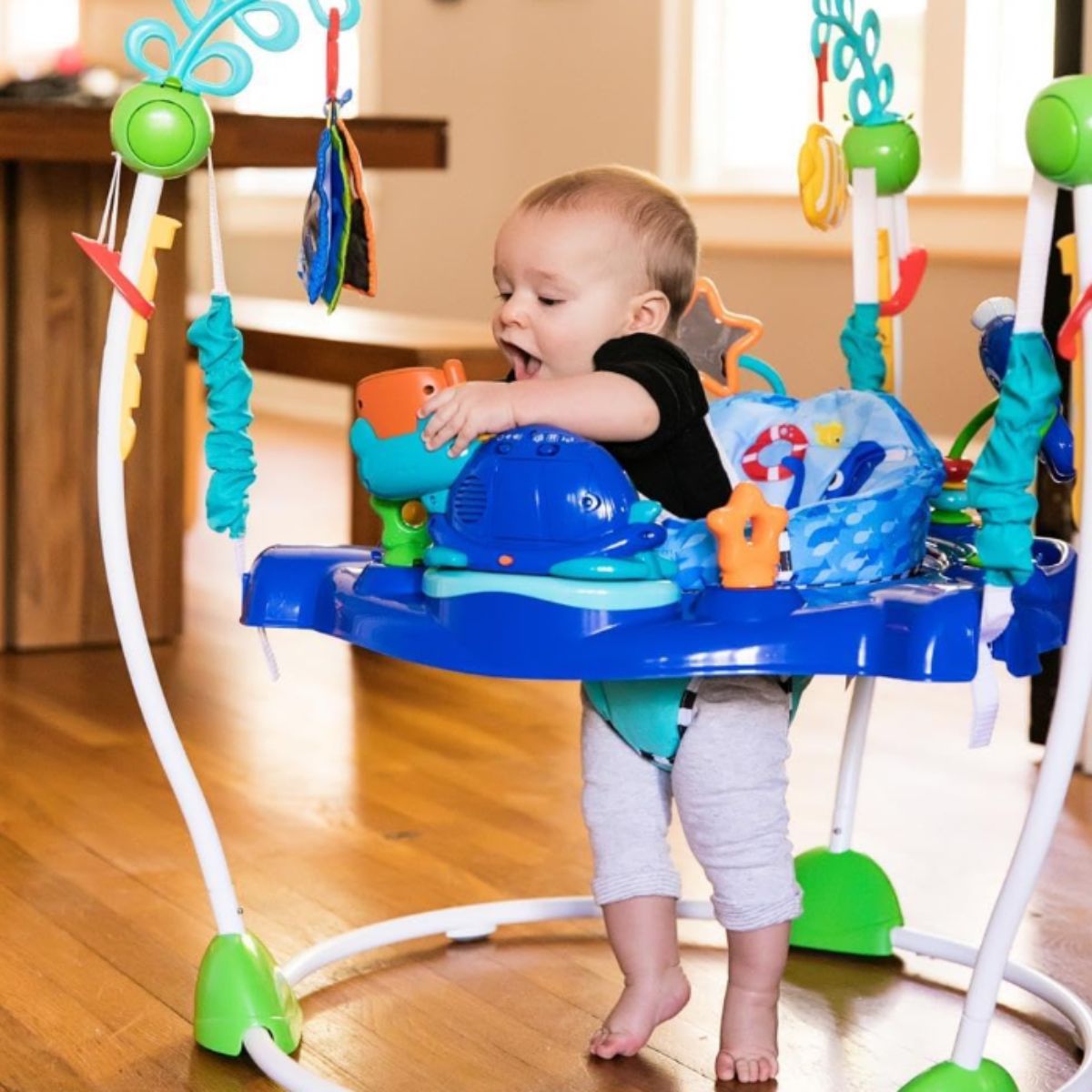 The activity jumper by Baby provides sensory exploration with lights and sounds for babies 6 months and up. It features interactive ocean-themed toys for endless fun.