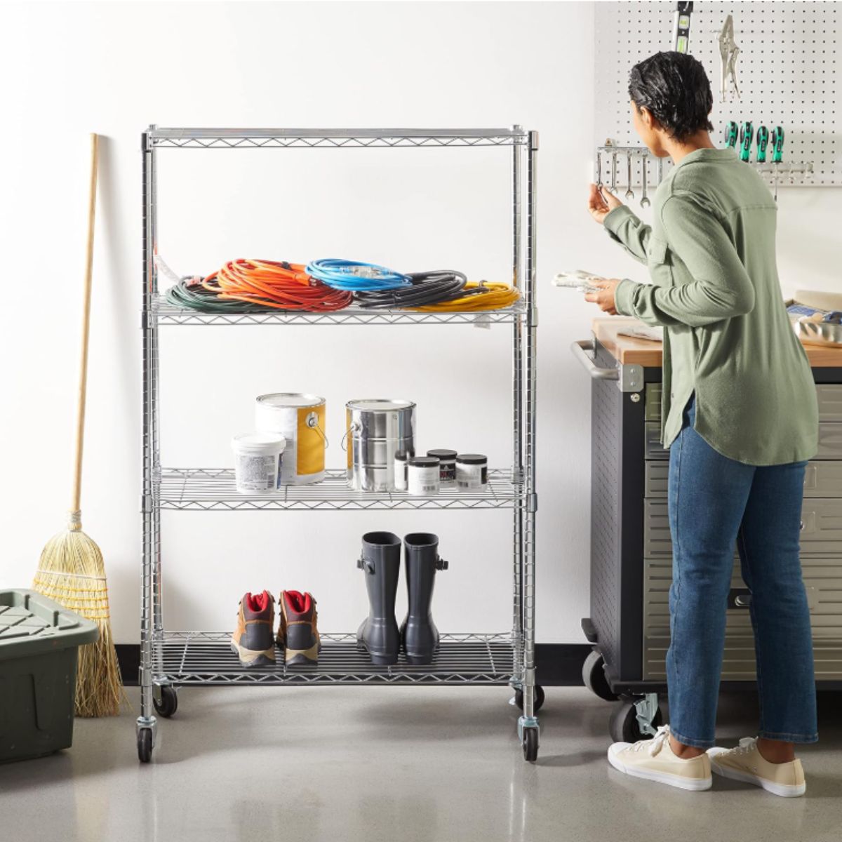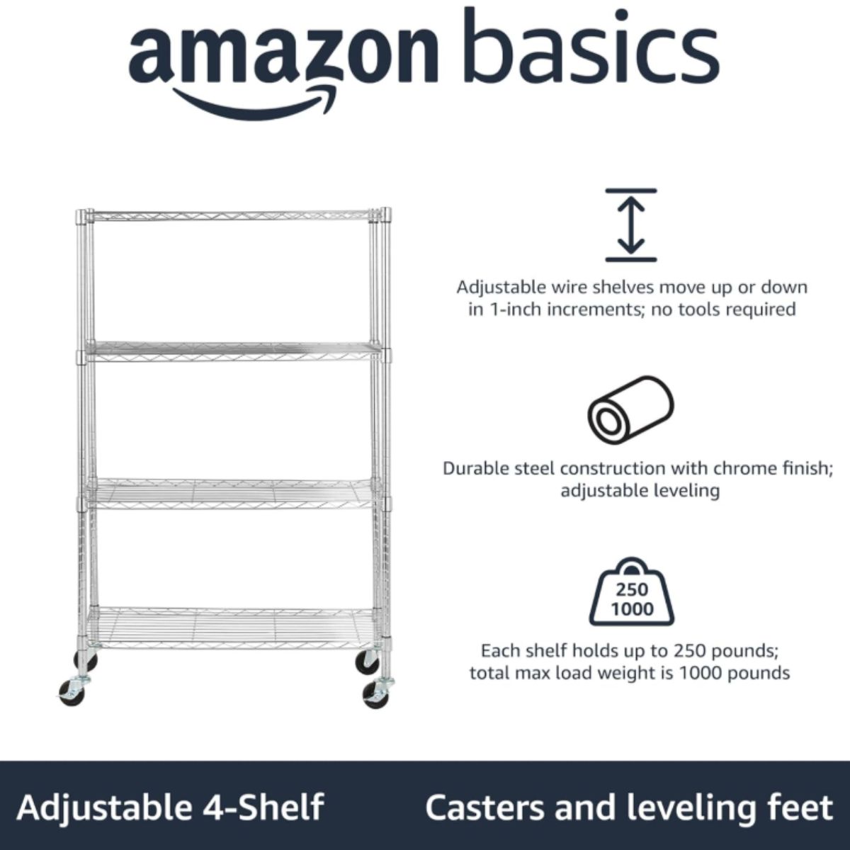 The adjustable shelving unit by Amazon Basics offers durable, heavy duty storage with wheels for easy mobility. Perfect for garage or kitchen use.