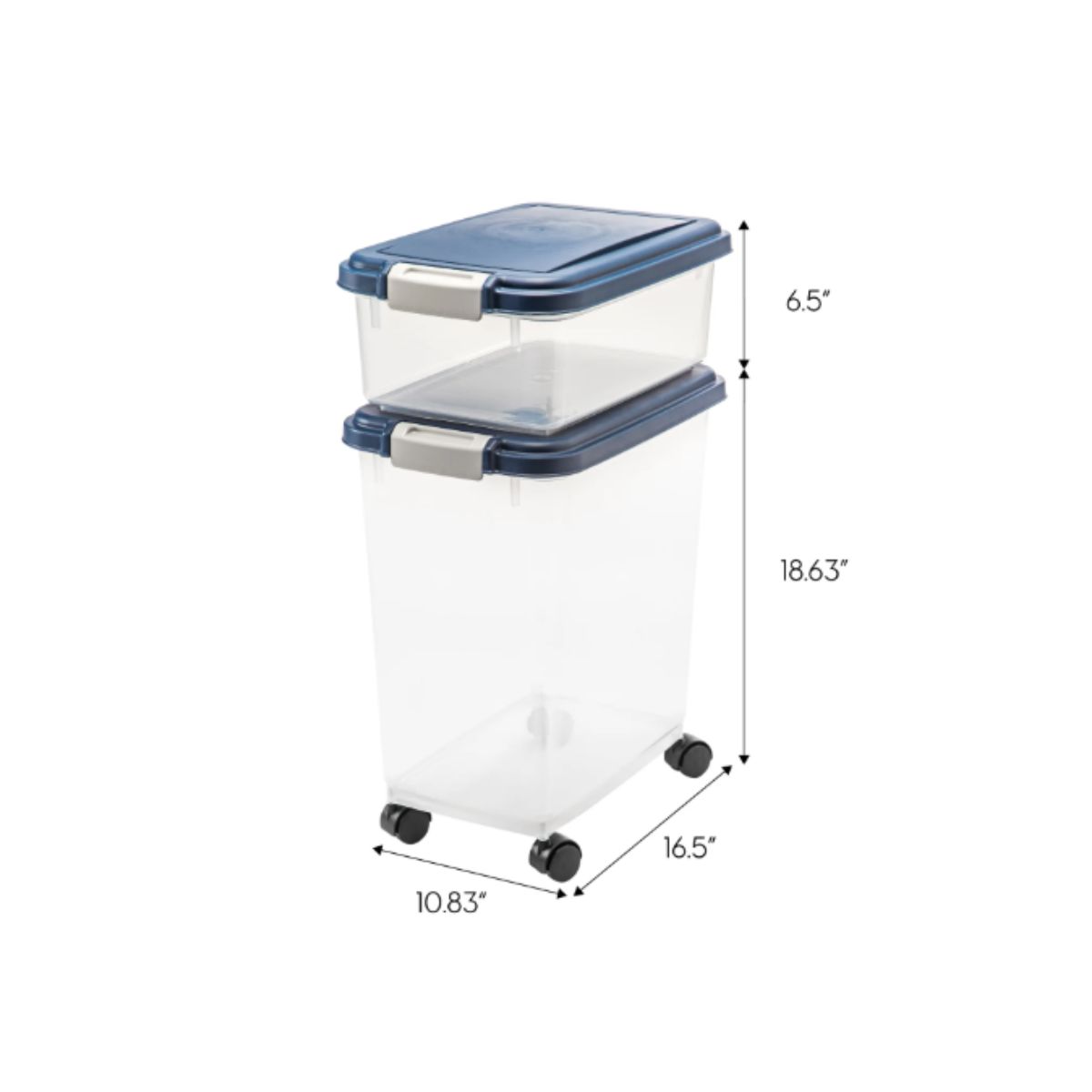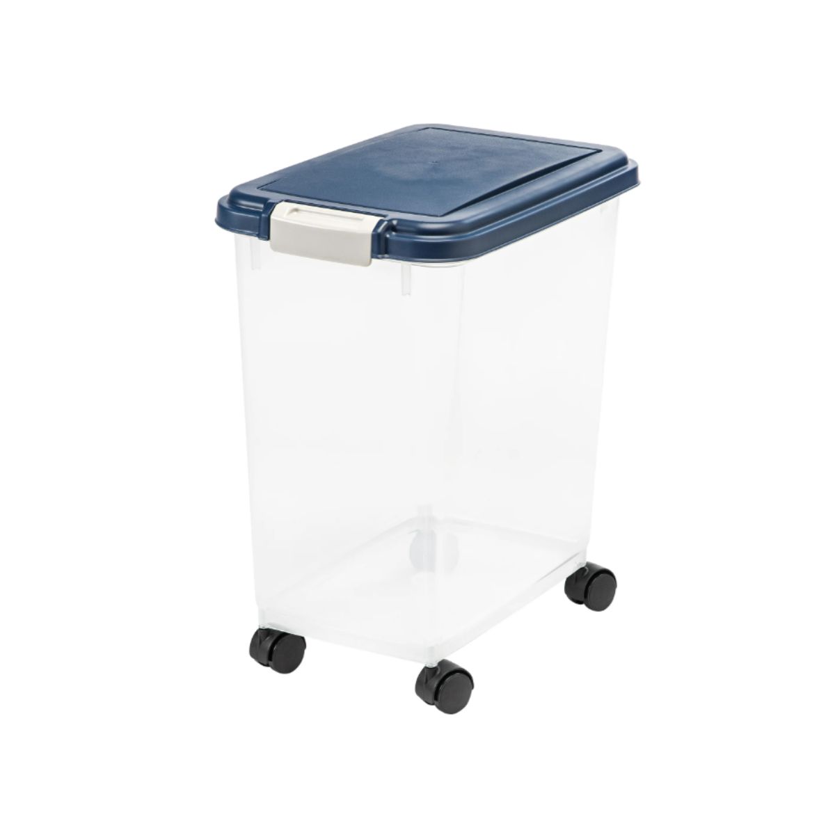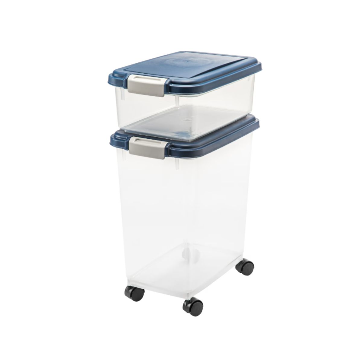 The airtight dog food container by Iris keeps your pet’s food fresh and organized. This navy combo set includes stackable containers with casters for easy mobility.