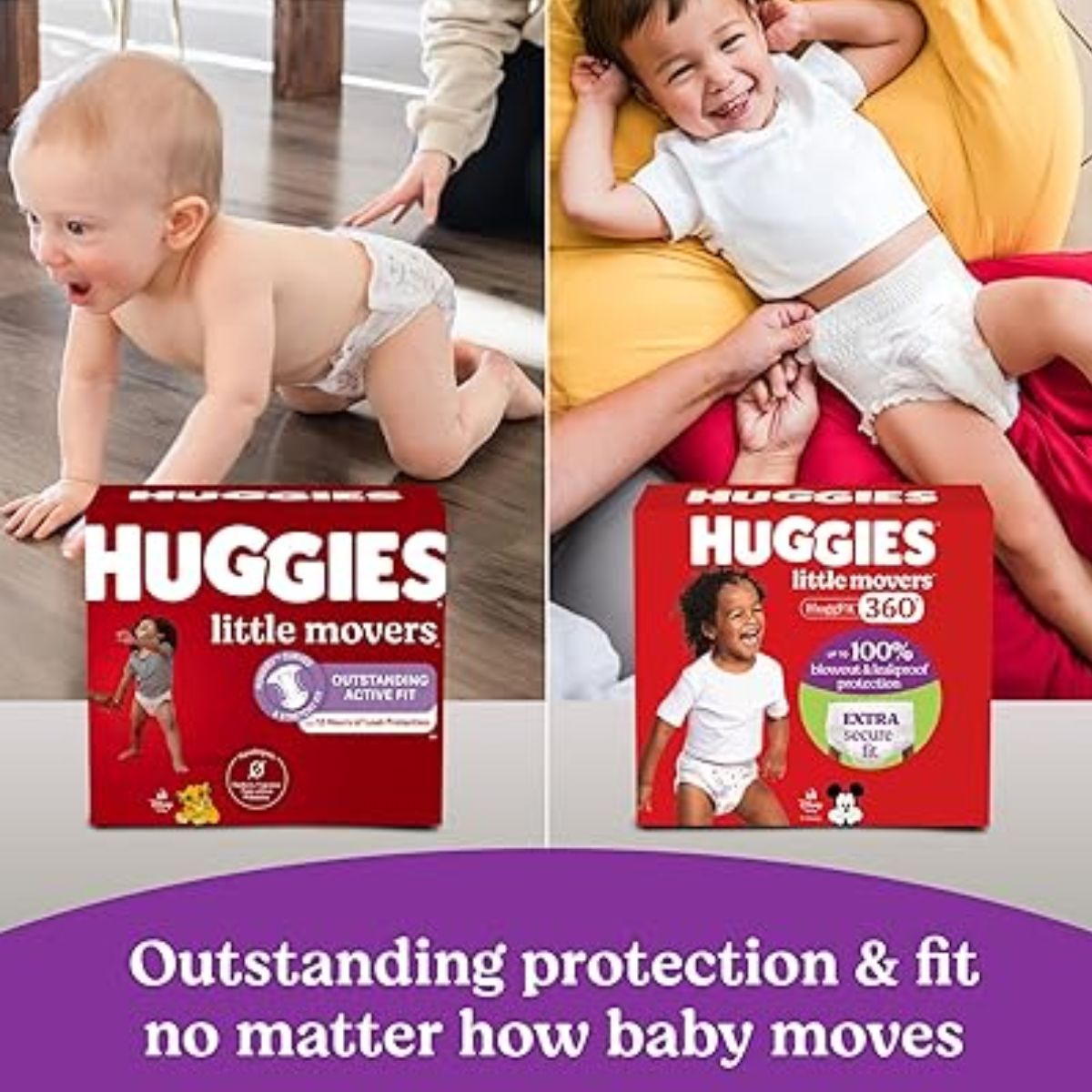 Baby diapers size 4 from Huggies offer 360° protection and a secure waistband, ideal for active babies between 22-37 lbs.