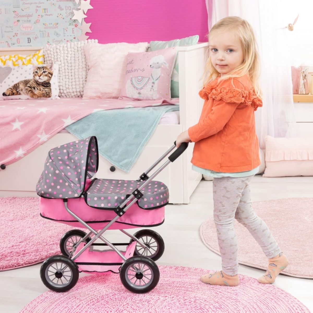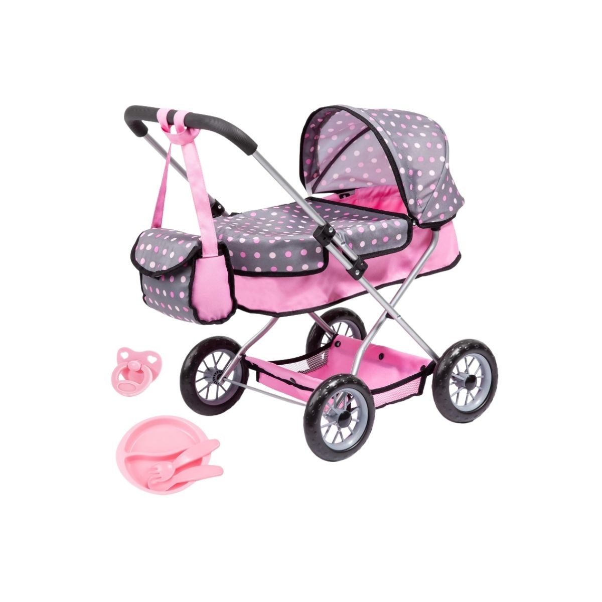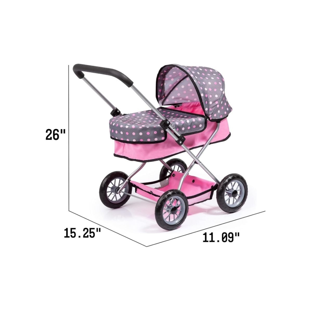The baby stroller for dolls by Bayer is perfect for dolls up to 18 inches. It includes plastic accessories and a spacious basket for imaginative play.