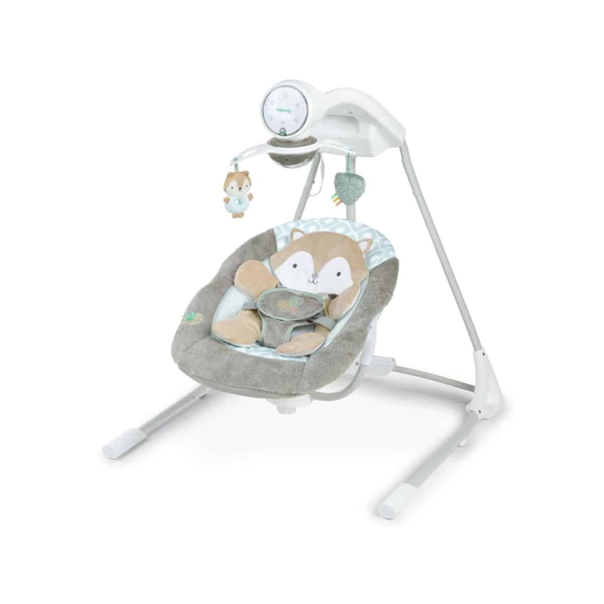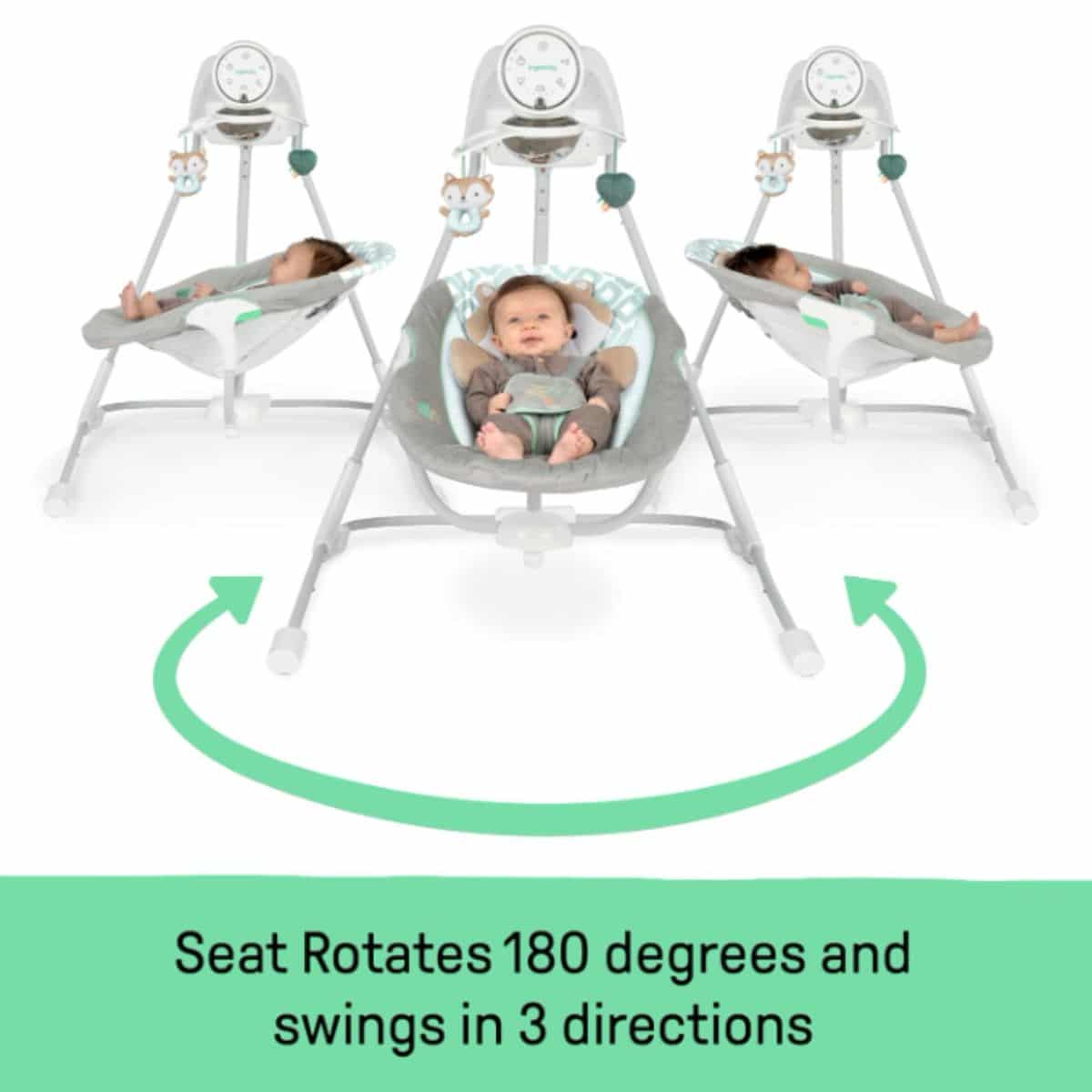 This baby swing by Ingenuity offers 5 speeds and a swivel infant seat for maximum comfort. Enjoy soothing nature sounds and a secure 5-point harness.