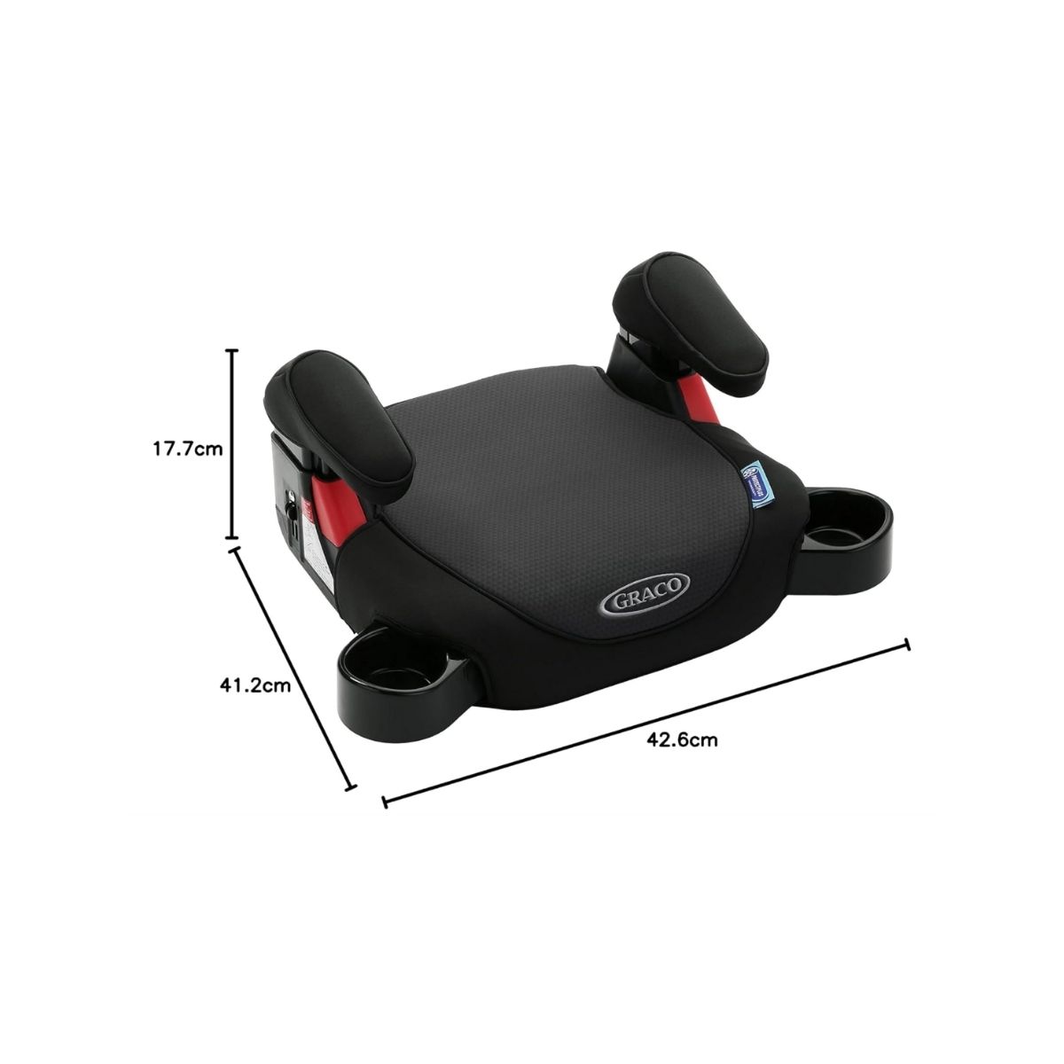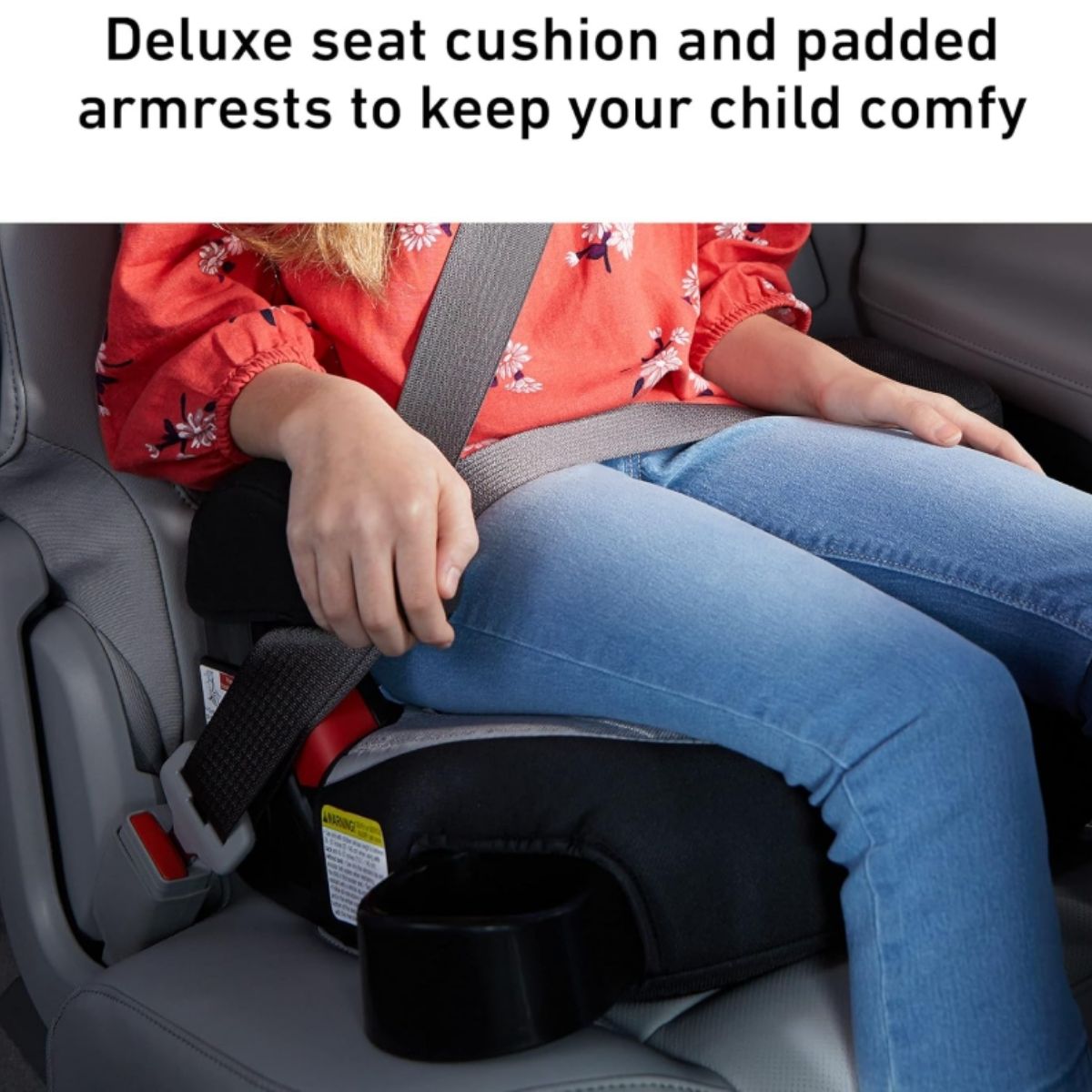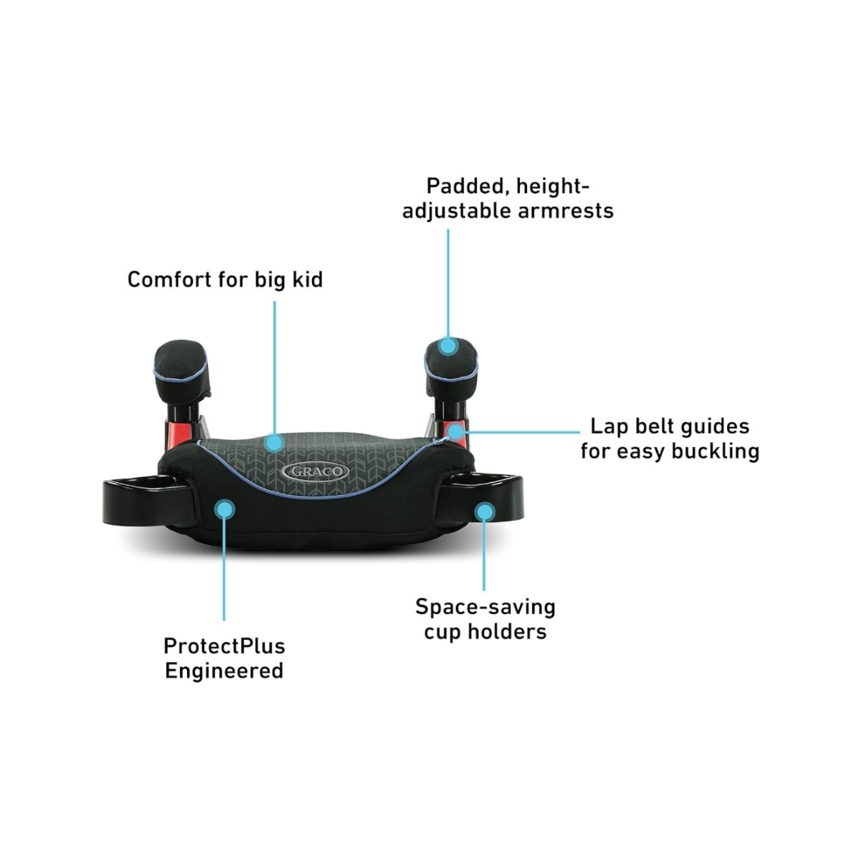 The backless booster seat by Graco offers safe and comfortable travel for big kids from 40 to 100 lb. It features adjustable armrests and a washable cover.