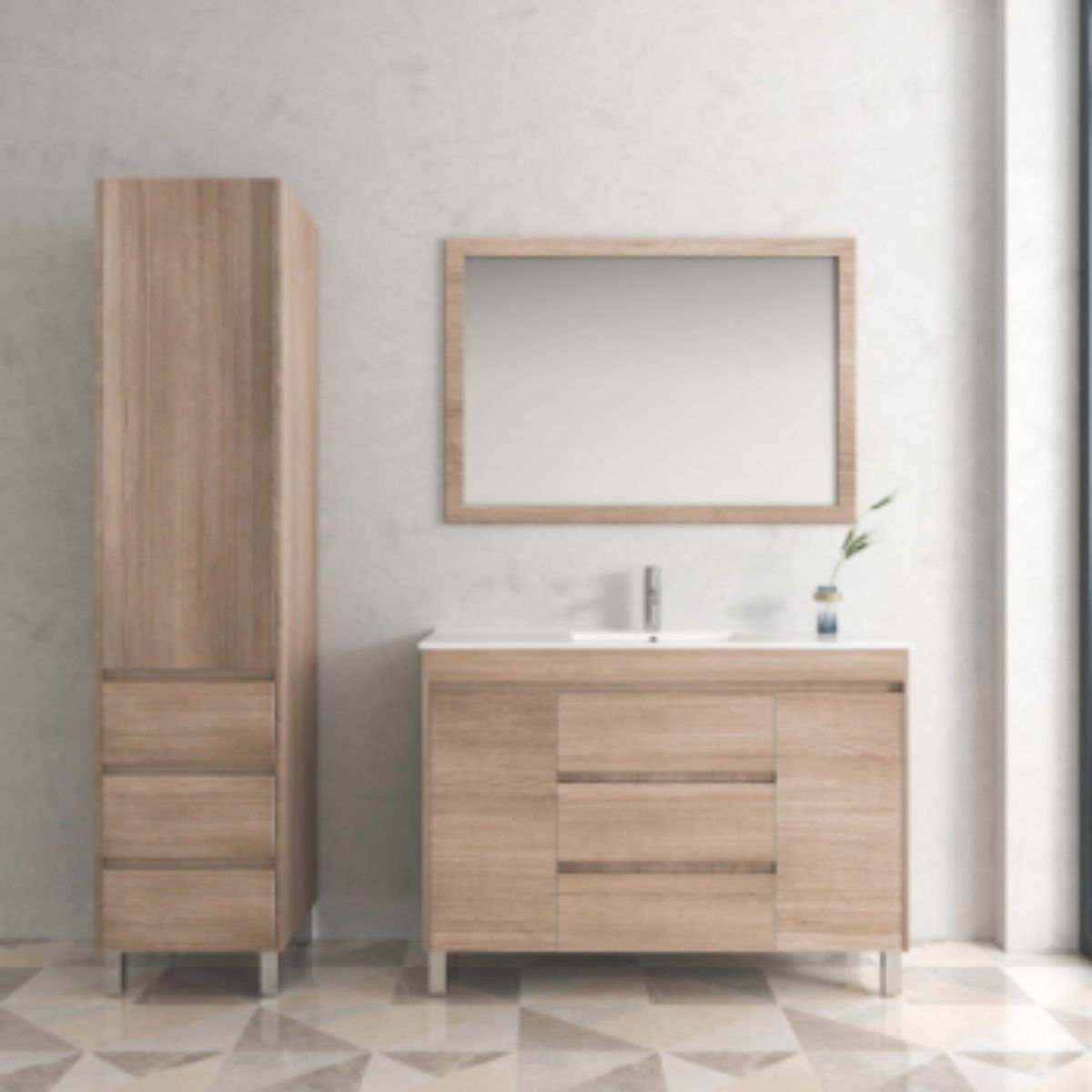 The bathroom vanity by JADE features a stylish light oak finish and offers ample storage with drawers. Perfect for organizing bathroom essentials.