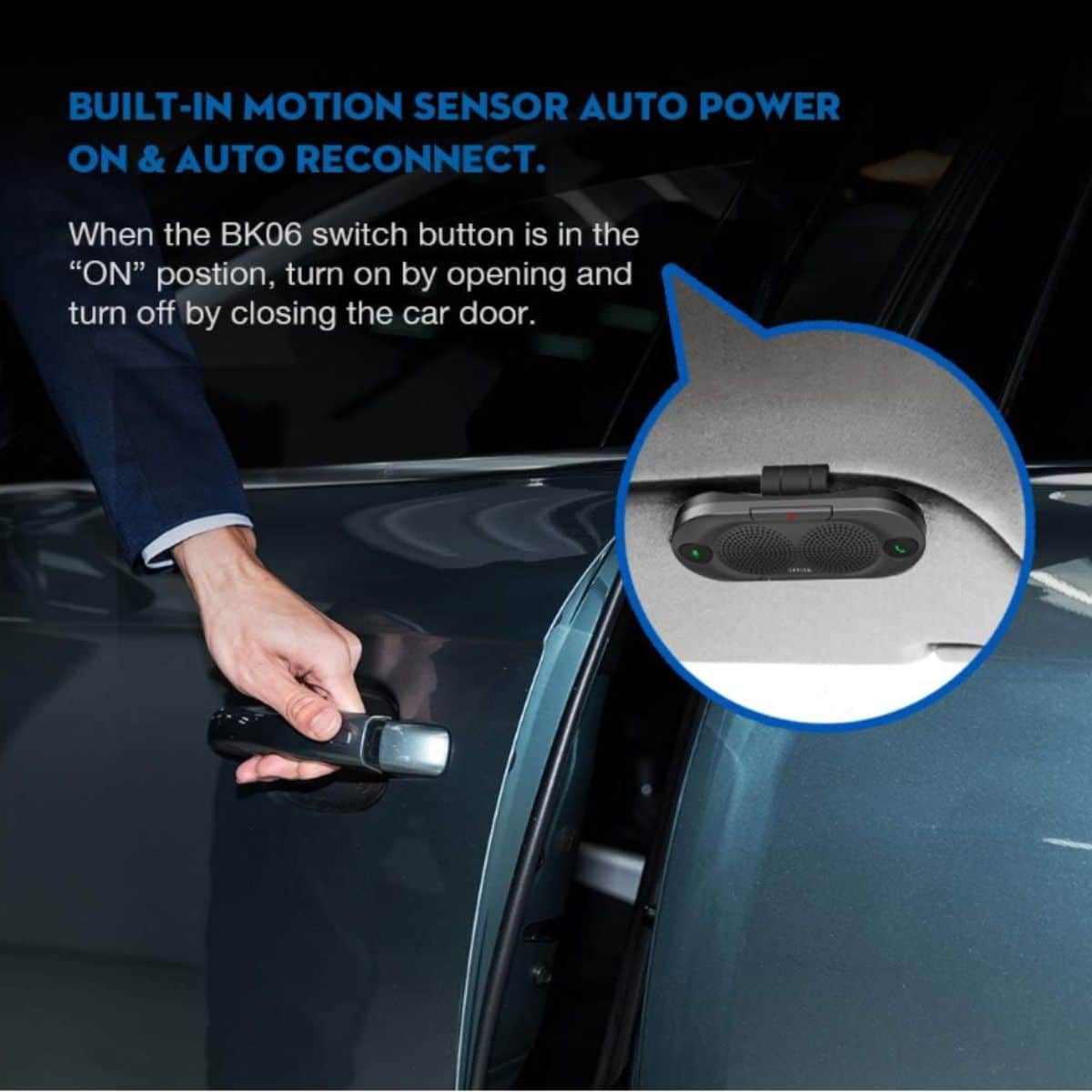 Besign BK06 Bluetooth 5.0 in Car Speakerphone with Visor Clip, Wireless Car Kit for Handsfree Talking, Motion Auto On, Siri Google Assistant Support, Dual 2W Speakers