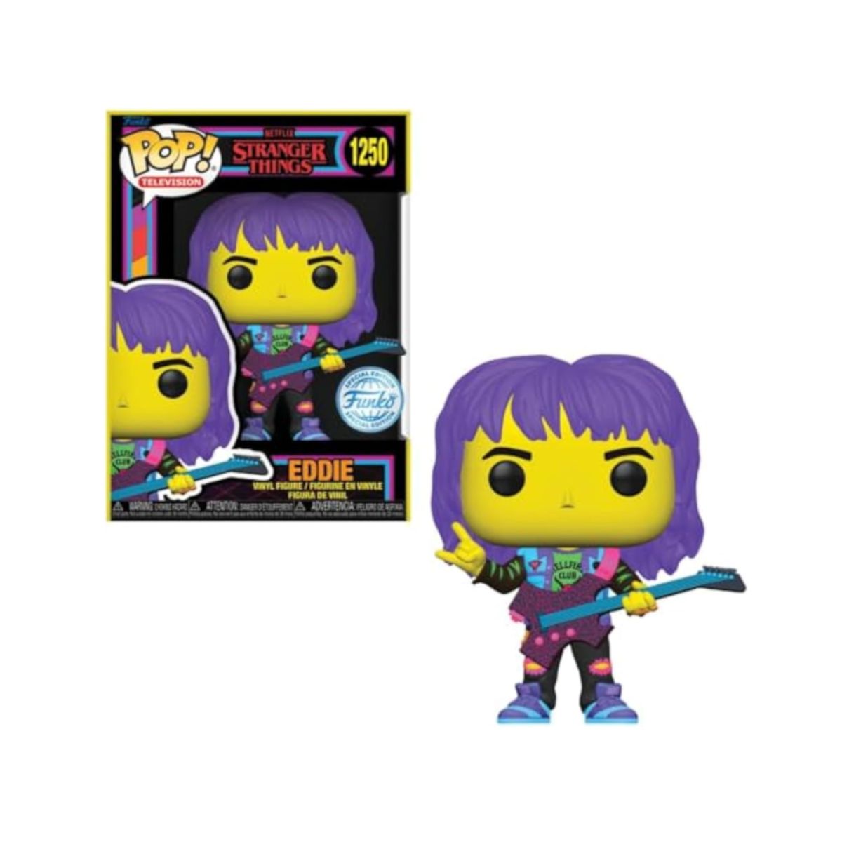 The blacklight pop figure by Funko features Eddie Hellfire Club from Stranger Things rocking his guitar. A perfect collectible for fans and collectors alike.