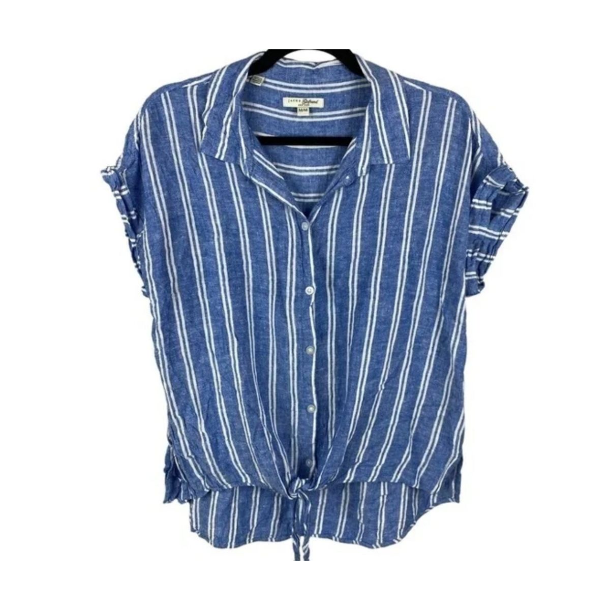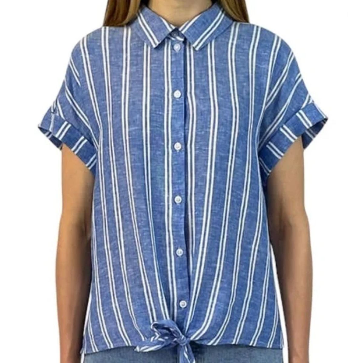 This blue white striped shirt by Jachs features a breathable linen blend and stylish tie front. Perfect for a relaxed summer look.