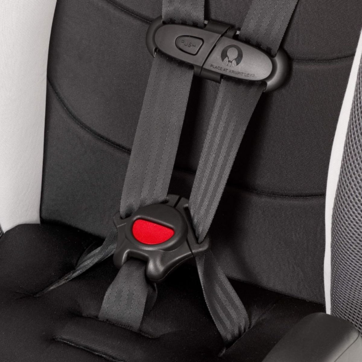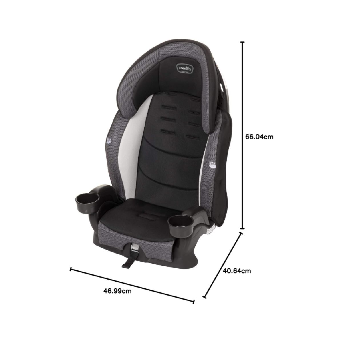 The booster car seat by Evenflo offers a 2-in-1 design for safety and comfort. It features machine washable padding and integrated cup holders.