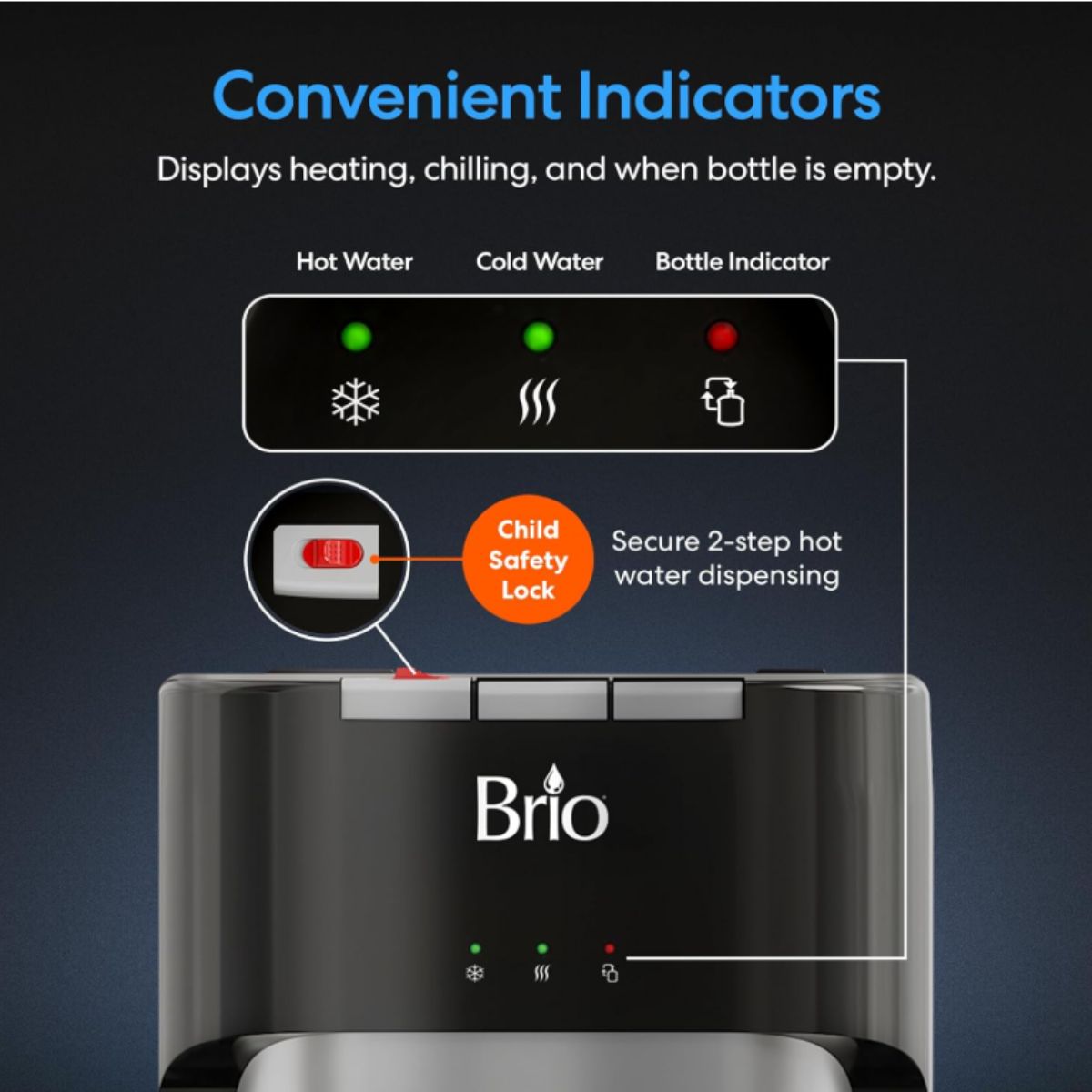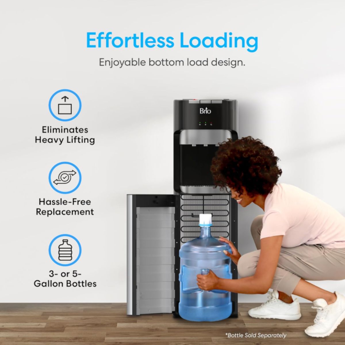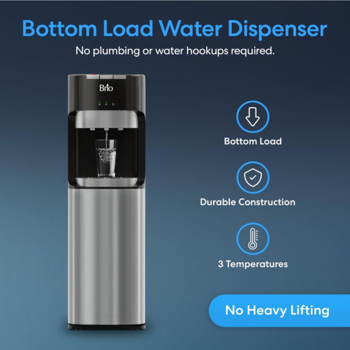 Bottom loading water cooler by Brio offers hot, cold and room temperature water settings. Perfect for convenient hydration without heavy lifting.