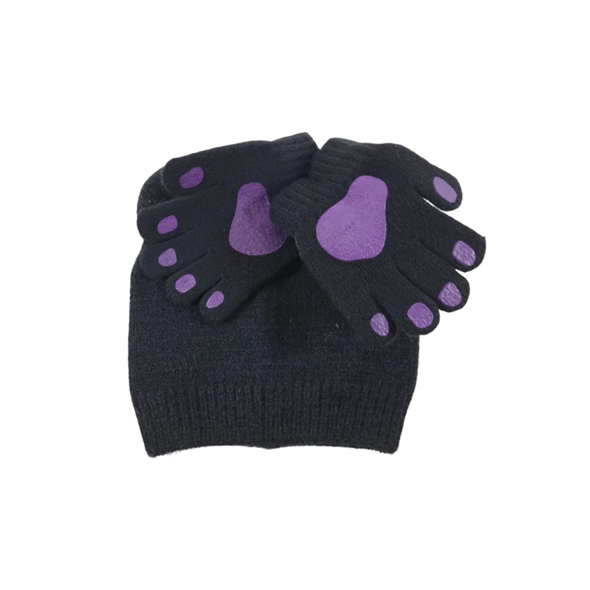 Cat costume beanie by Beanie and Gloves is perfect for kids. This black and purple set includes cozy beanie and matching gloves for fun.