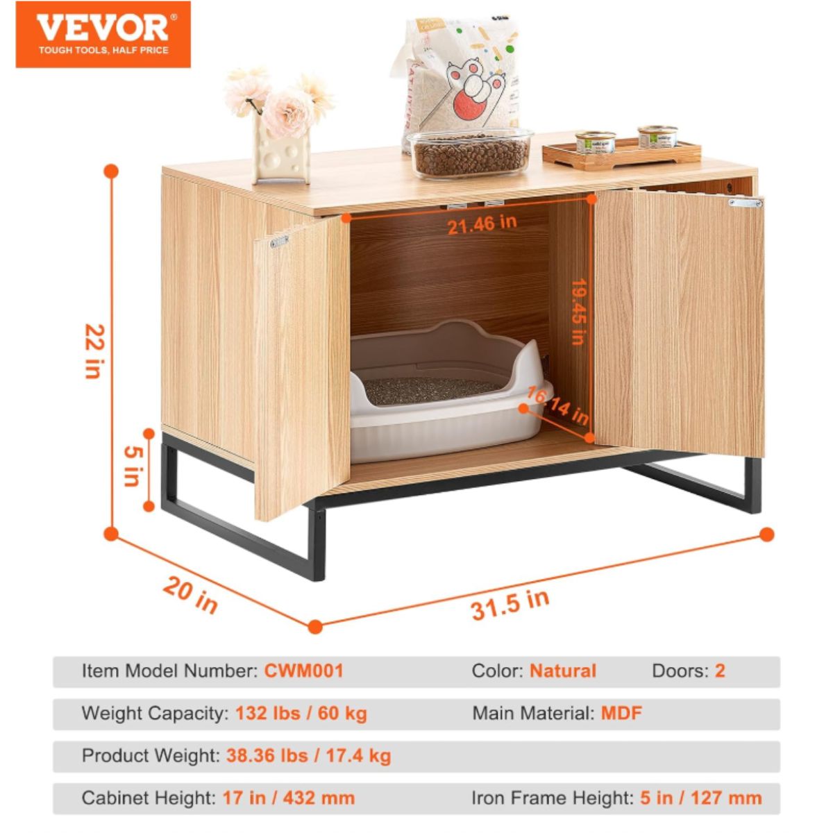 The cat litter box enclosure by VEVOR offers a stylish and practical solution to hide your cat’s litter box. Its roomy wooden cabinet and sturdy metal legs blend perfectly in your home.