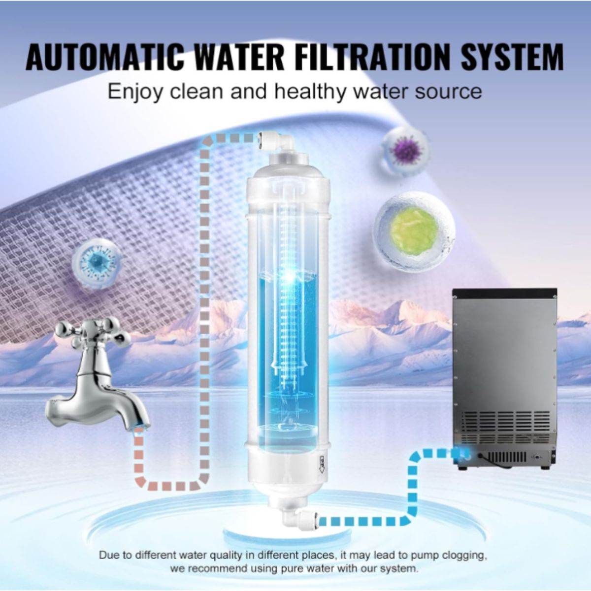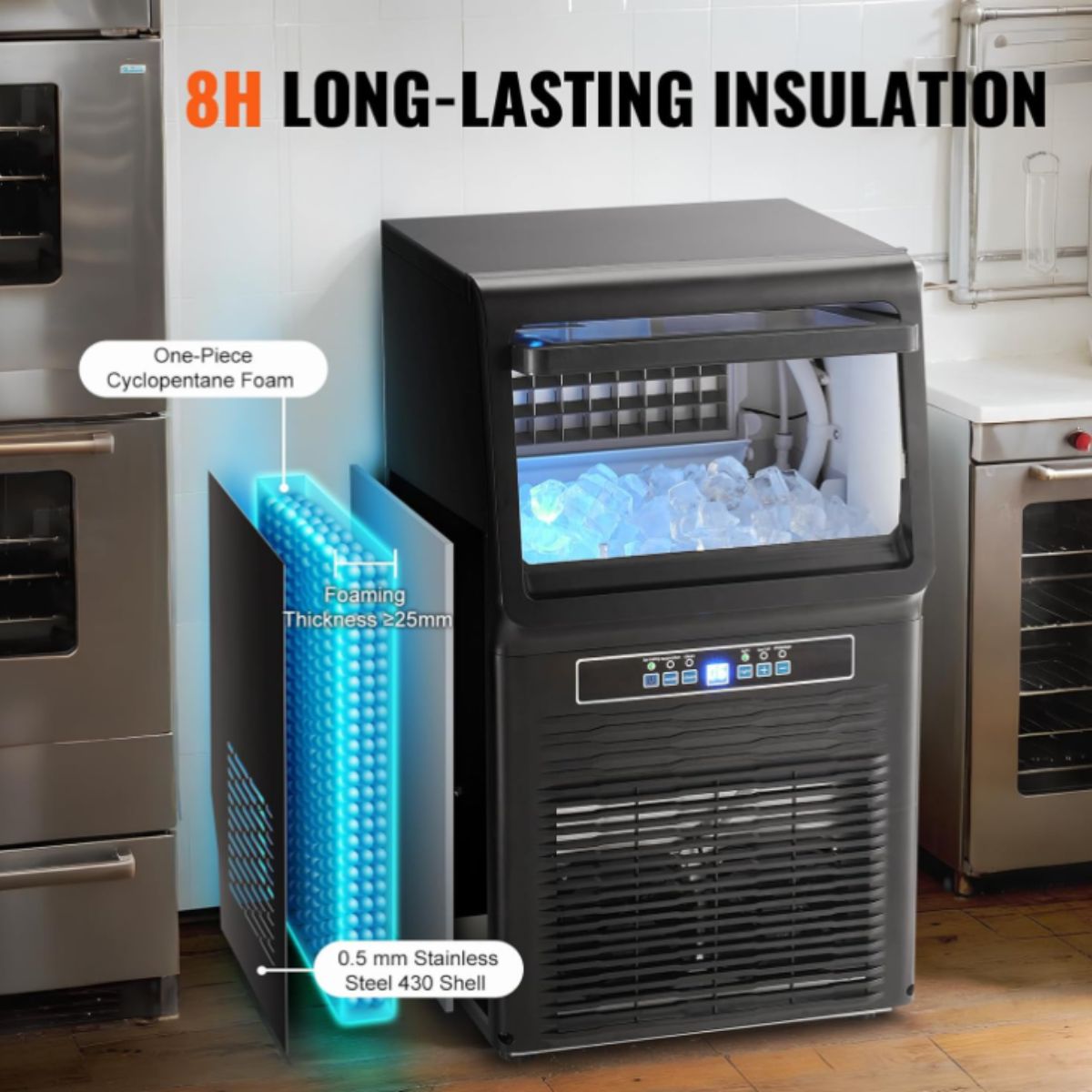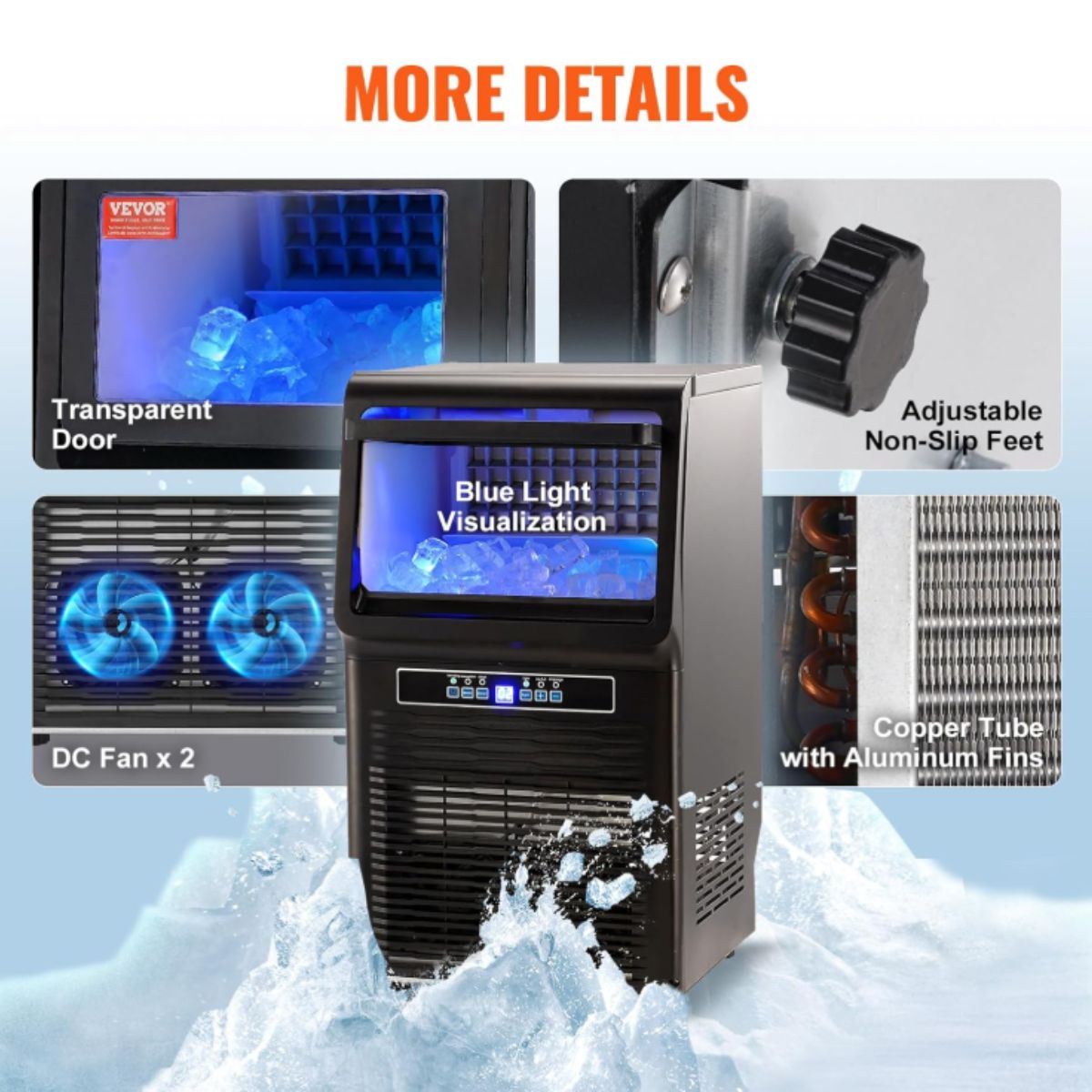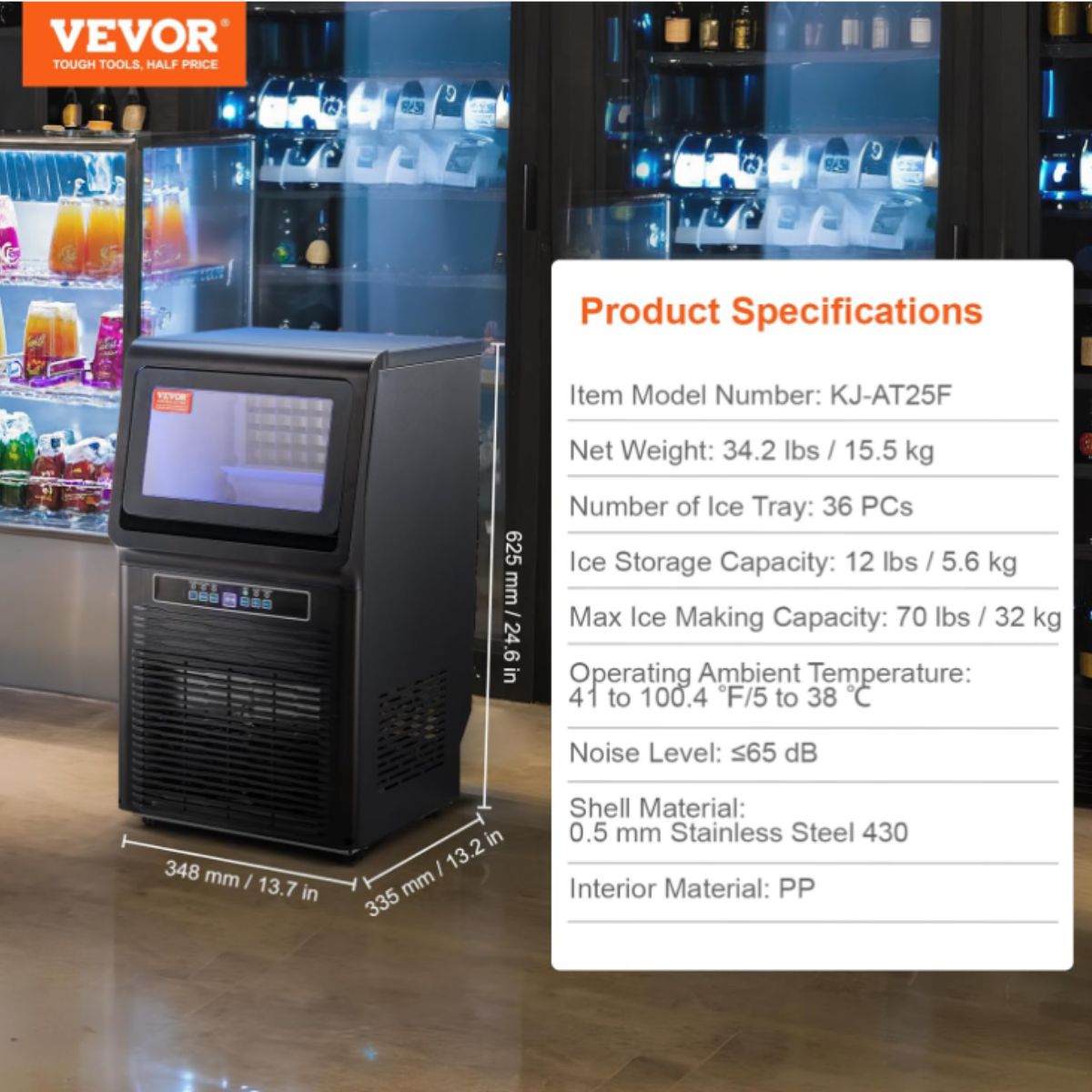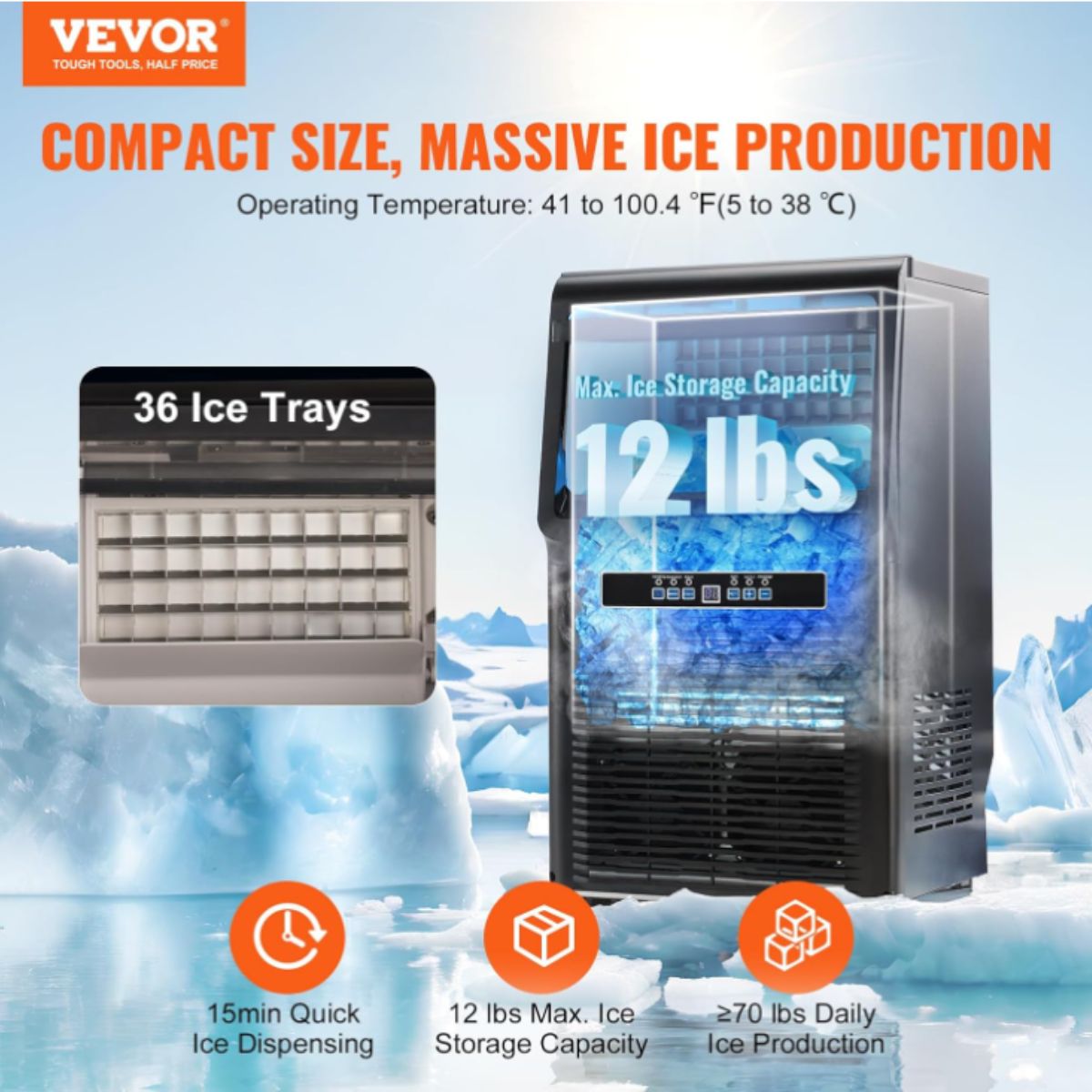 The commercial ice maker by Vevor produces up to 70lbs of ice per day with a 12lbs storage capacity. Ideal for bars, restaurants, and home use.
