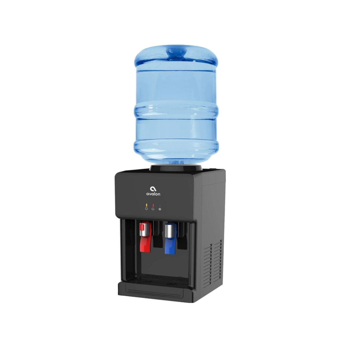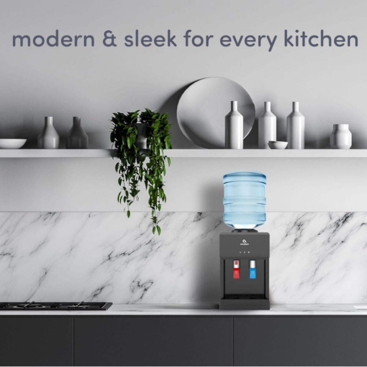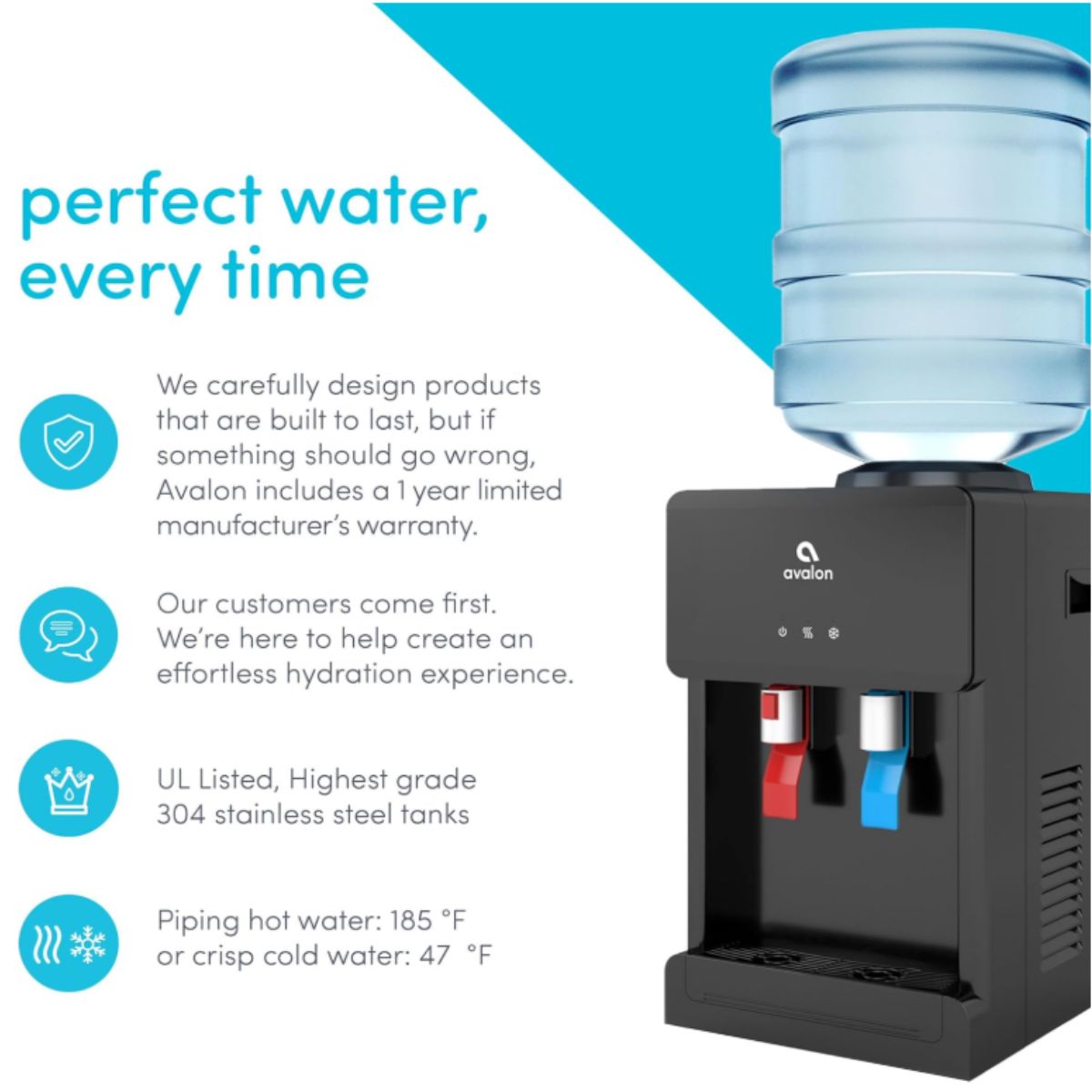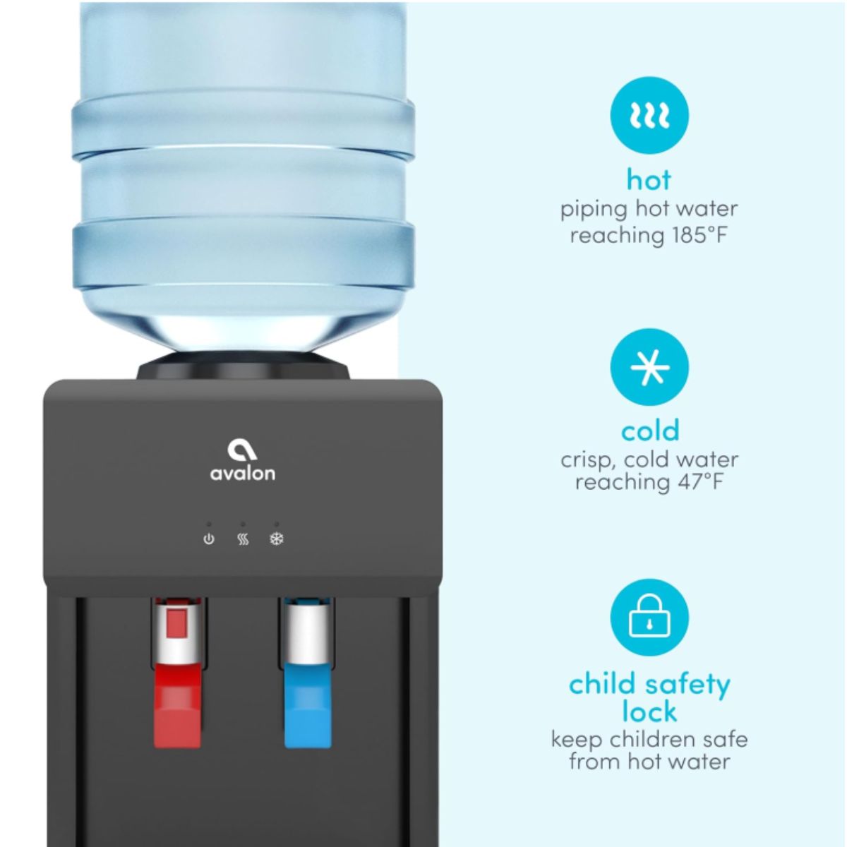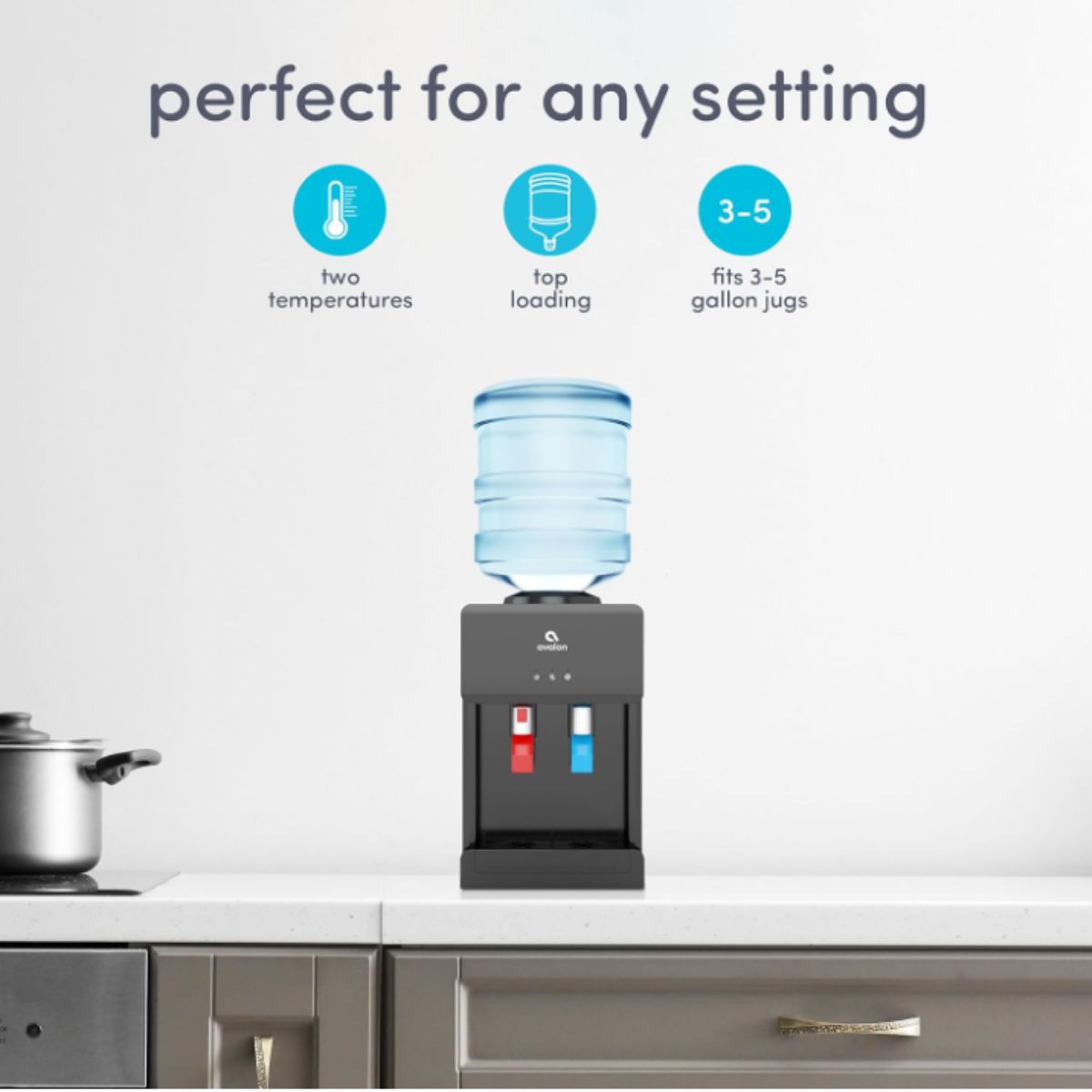 Countertop water cooler dispenser by Avalon delivers hot and cold water with safety lock. Perfect for home or office use with reliable performance.