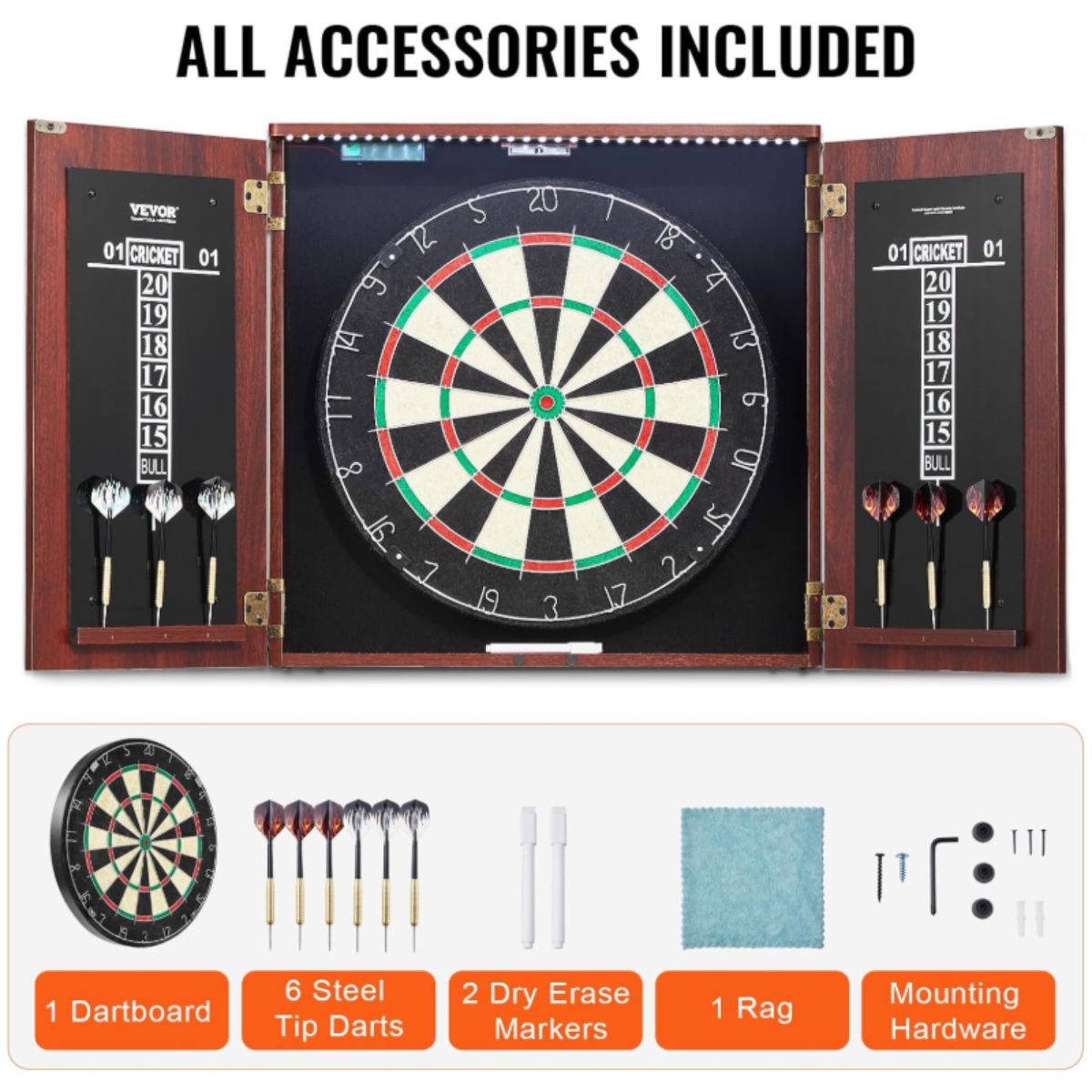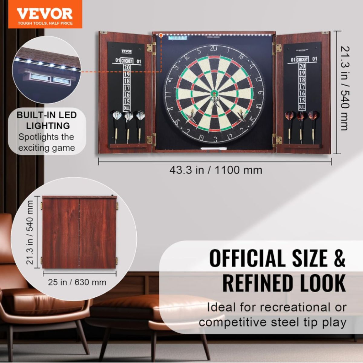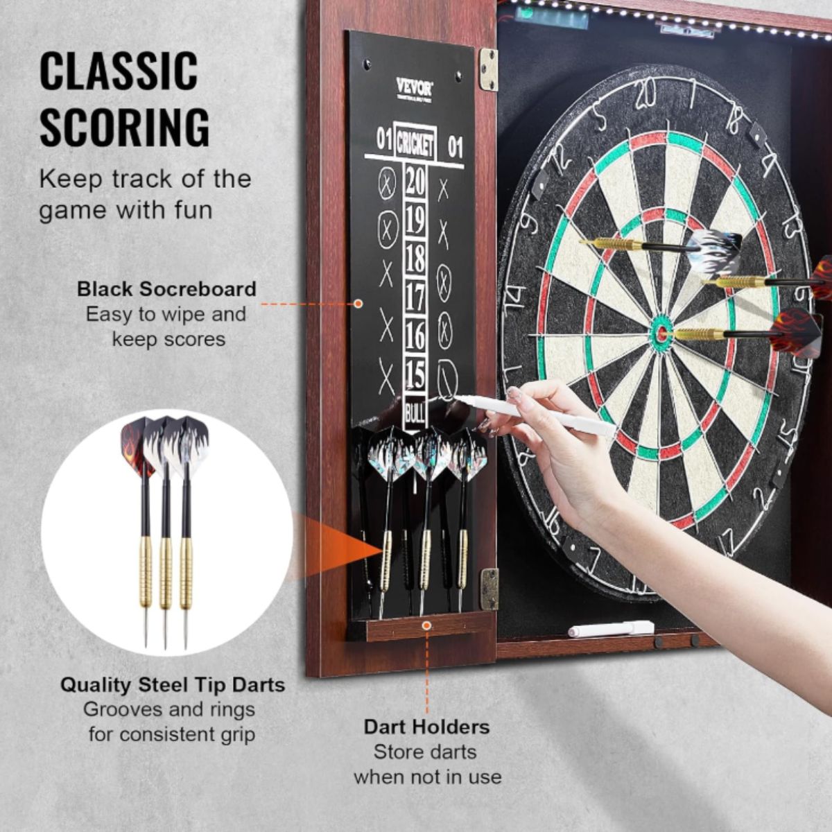 The dartboard cabinet set from VEVOR features an official size dartboard with LED light and steel tip darts. Perfect for cricket game enthusiasts and easy to assemble.