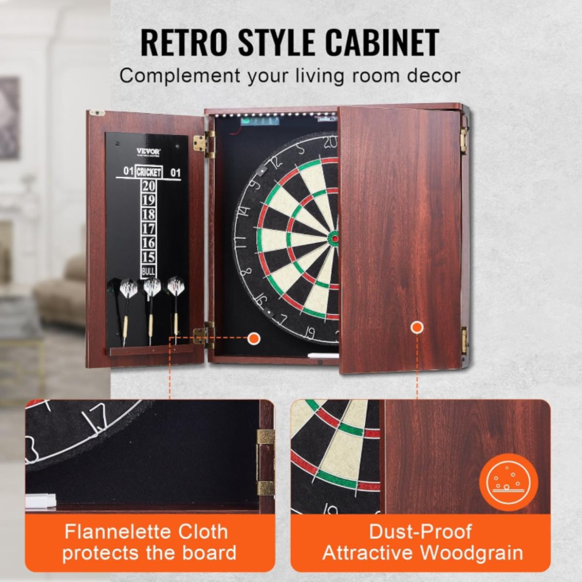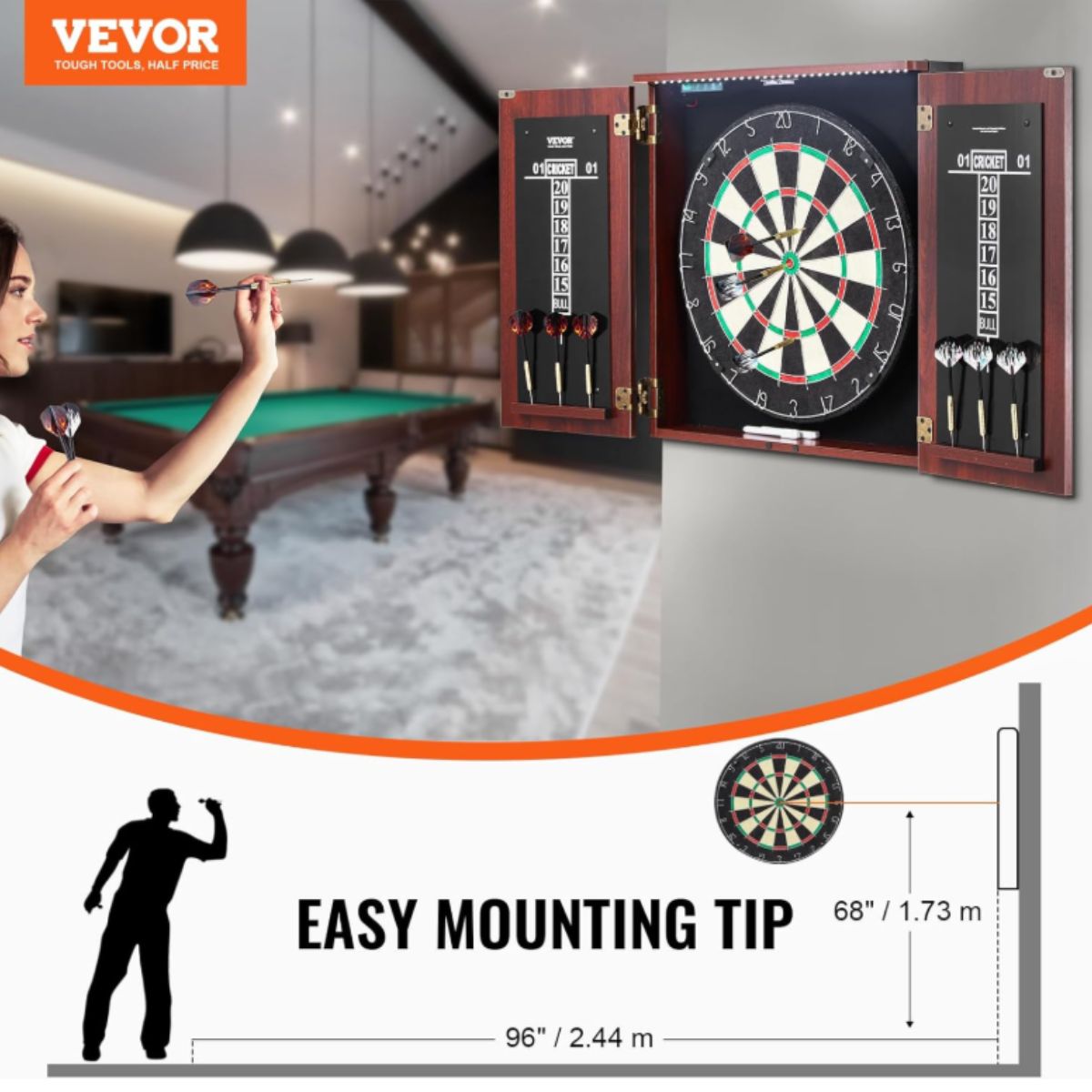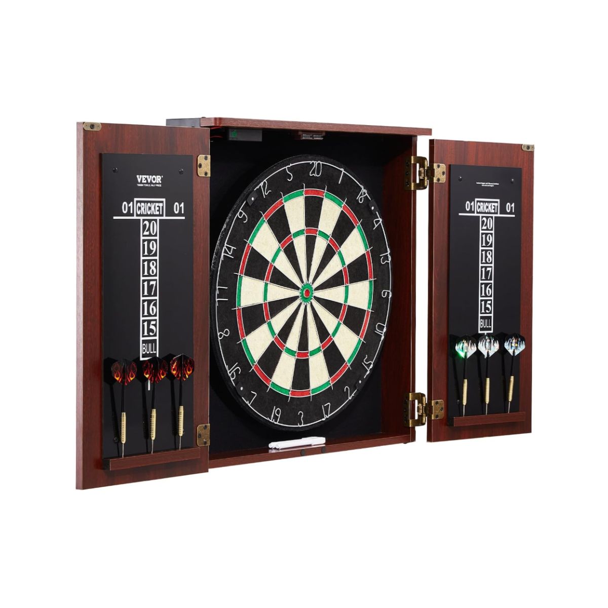 The dartboard cabinet set from VEVOR features an official size dartboard with LED light and steel tip darts. Perfect for cricket game enthusiasts and easy to assemble.
