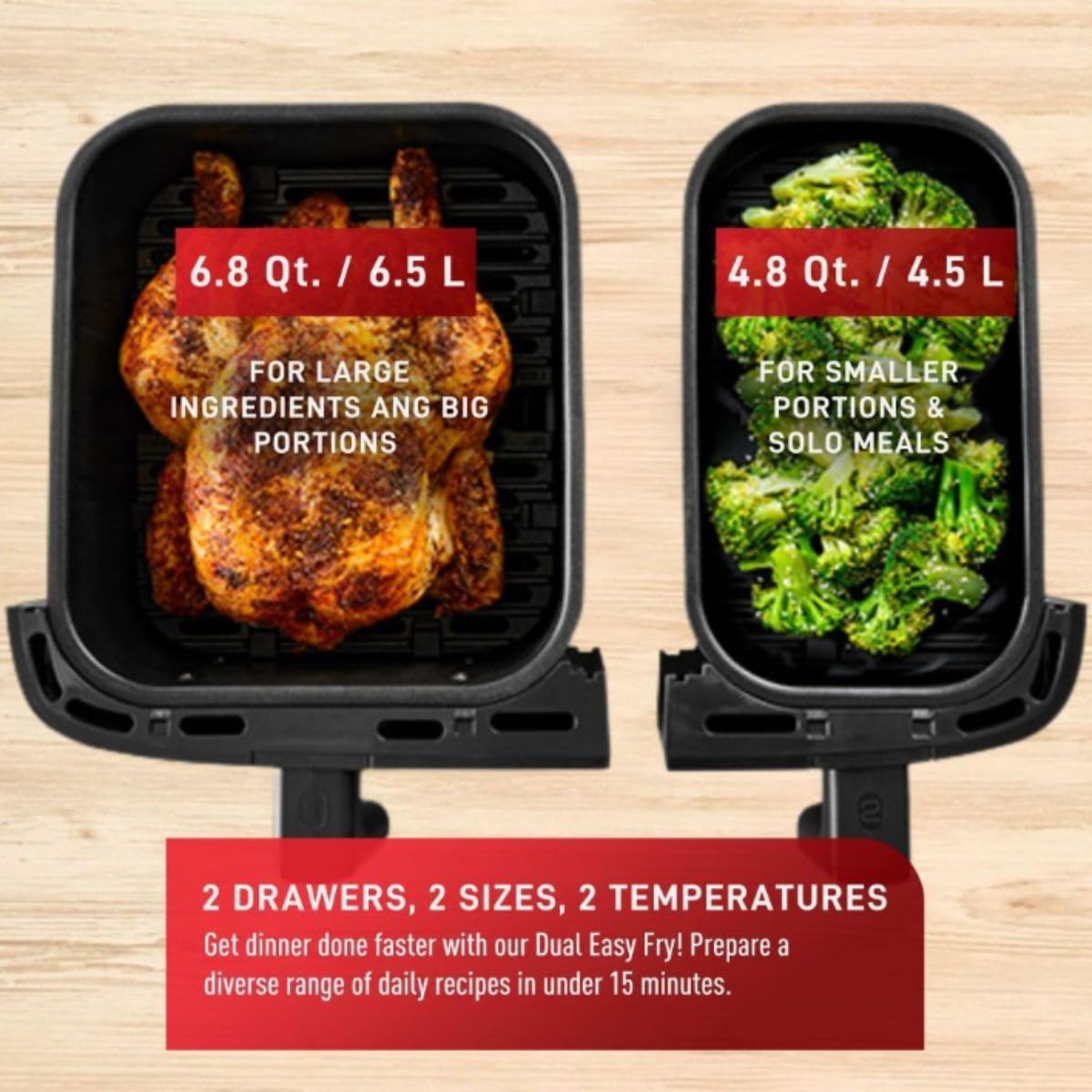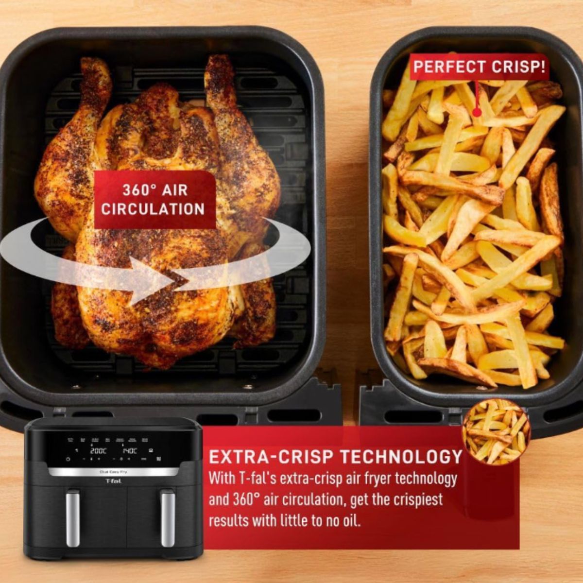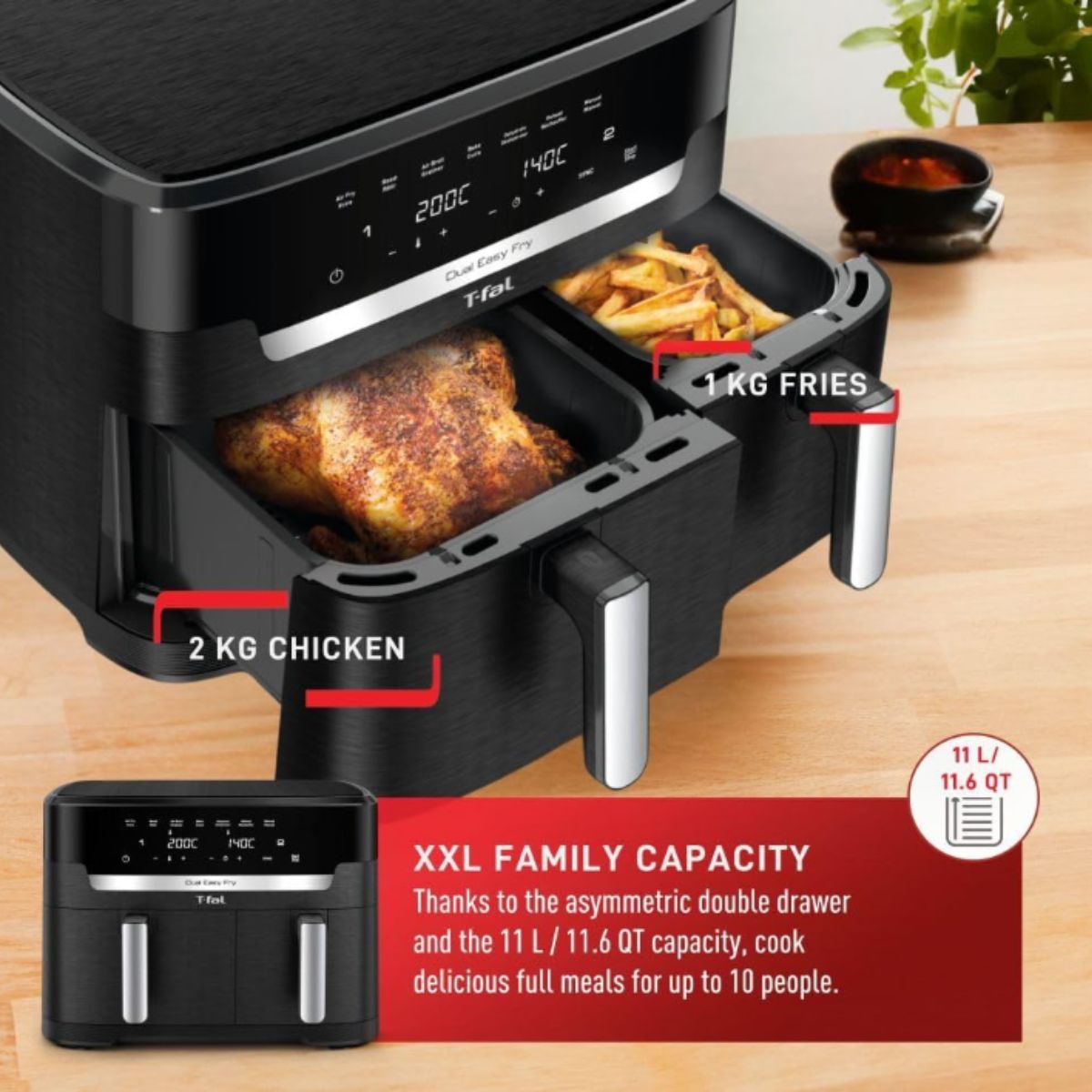 The dual air fryer from T-fal offers 11.6 quart capacity and 7 cooking programs for versatile and quick meals. Ideal for cooking multiple dishes simultaneously.