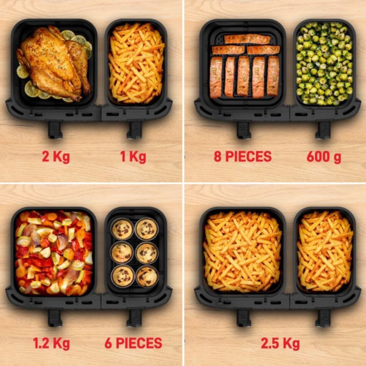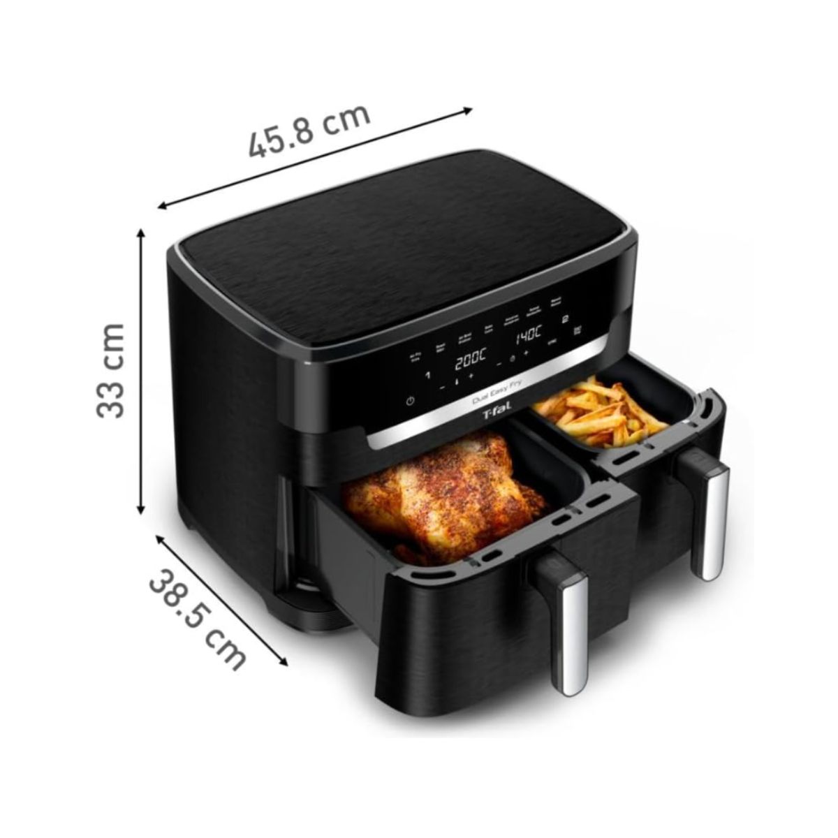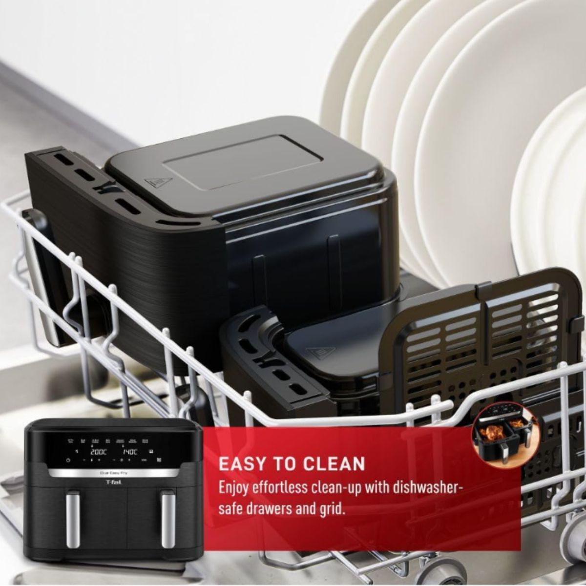 The dual air fryer from T-fal offers 11.6 quart capacity and 7 cooking programs for versatile and quick meals. Ideal for cooking multiple dishes simultaneously.