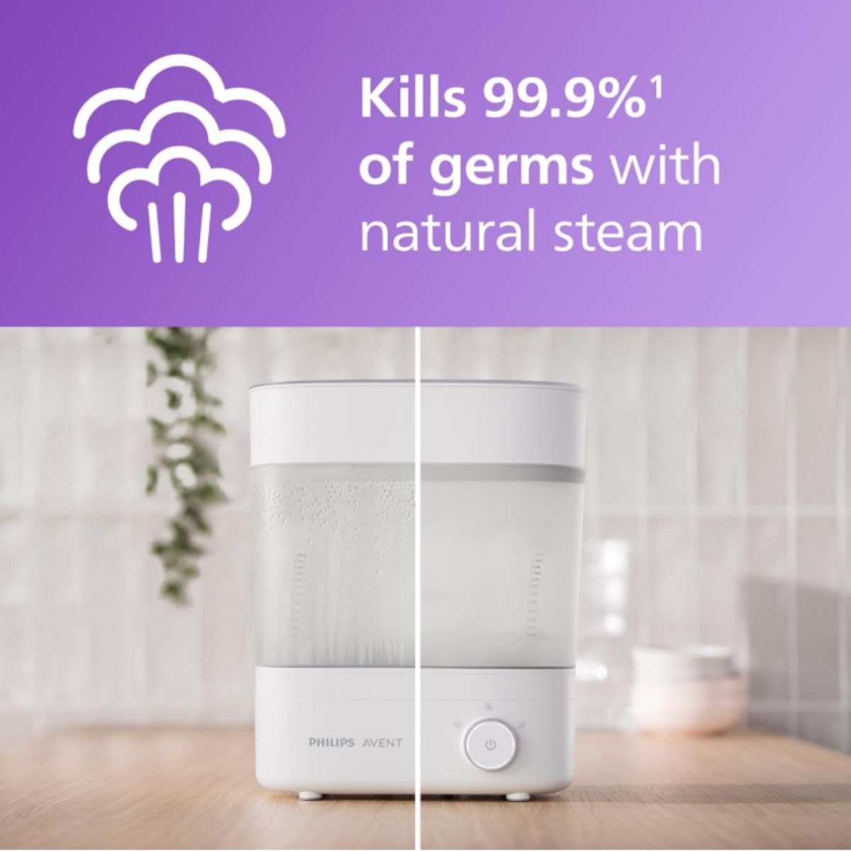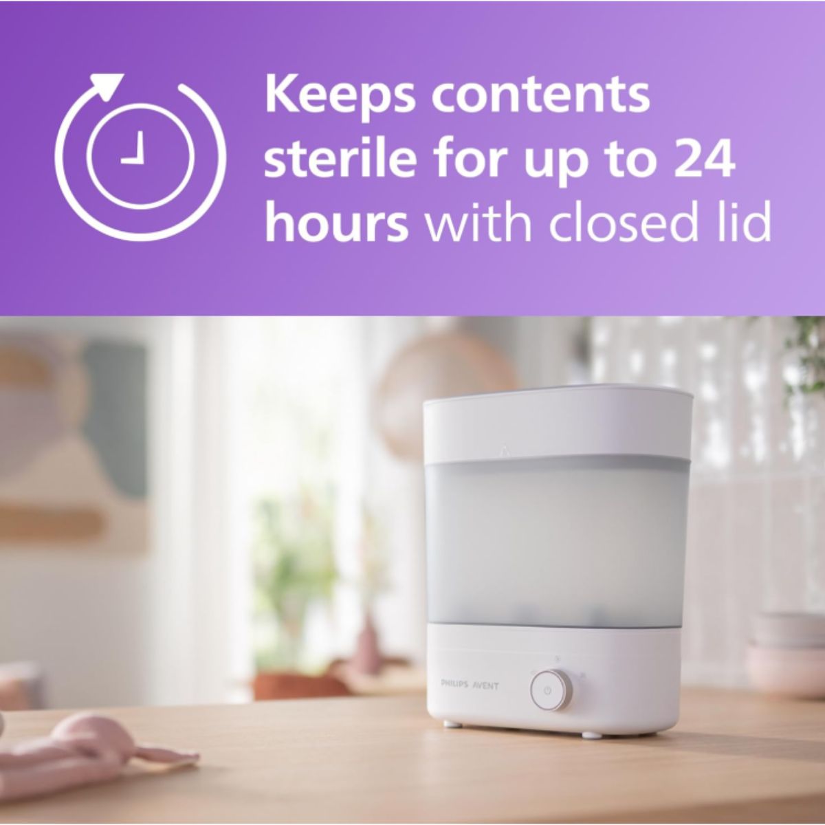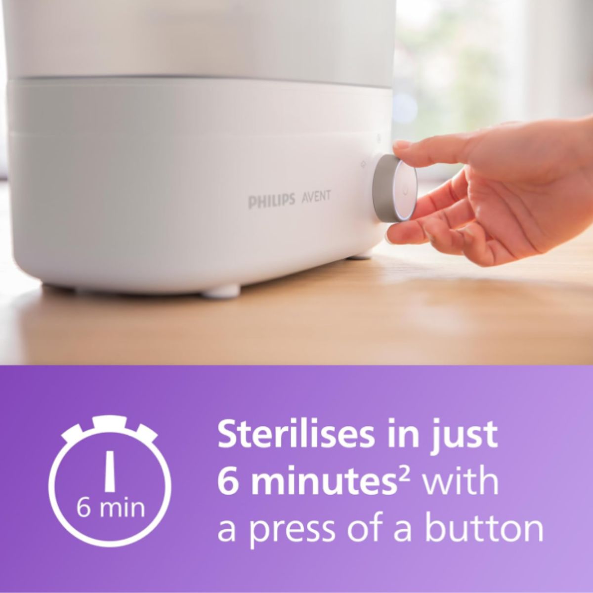 Electric steam sterilizer by Philips offers a quick and chemical-free way to protect your baby’s feeding items. Efficient sterilizing and drying in one device.