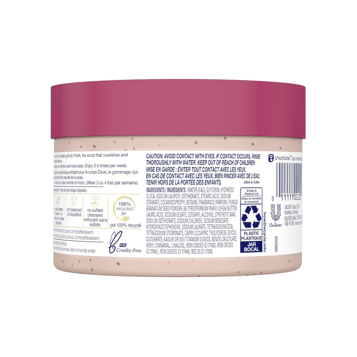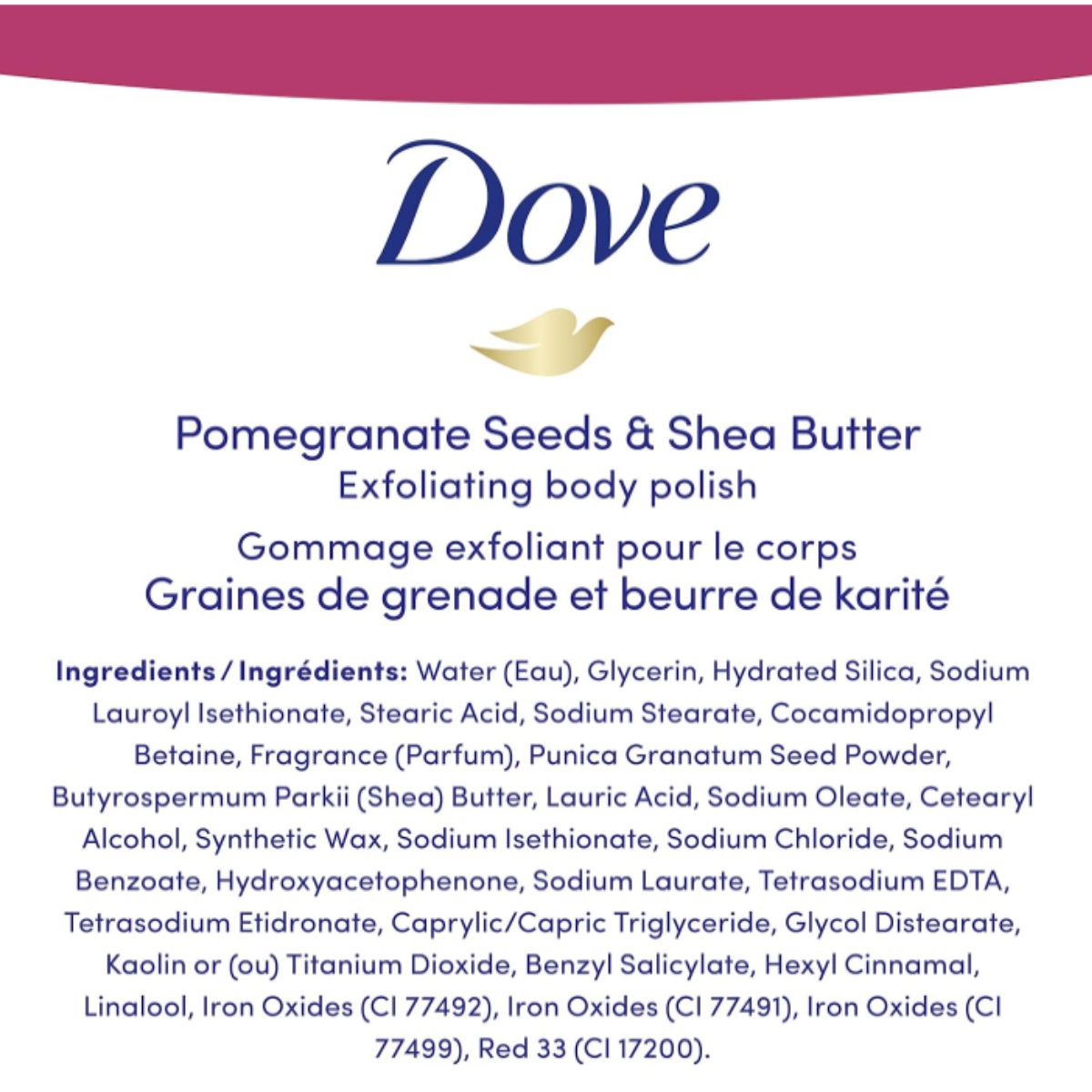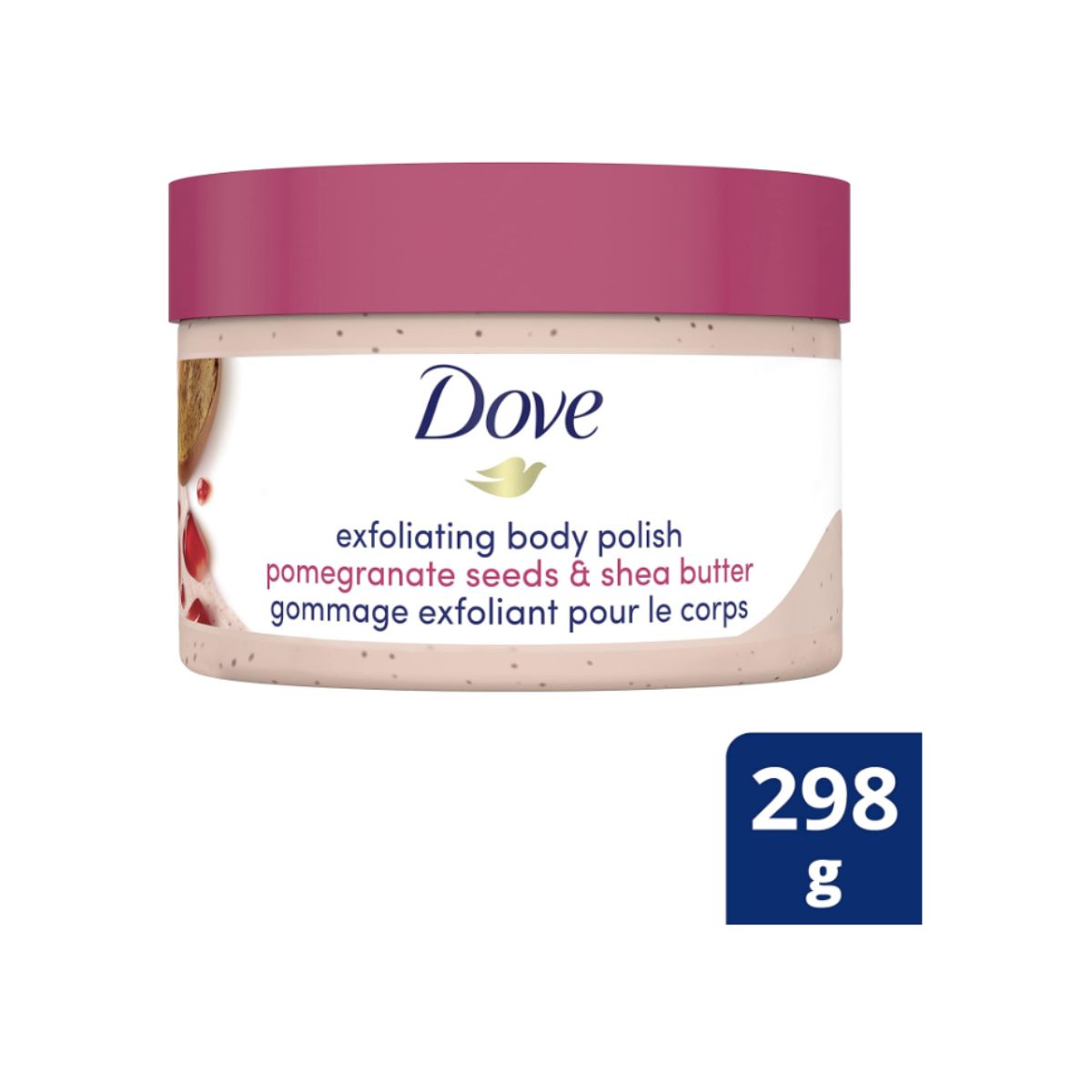 Exfoliating body polish scrub by Dove gently removes dead skin while nourishing for silky smooth skin. Infused with pomegranate and shea butter for lasting moisture.