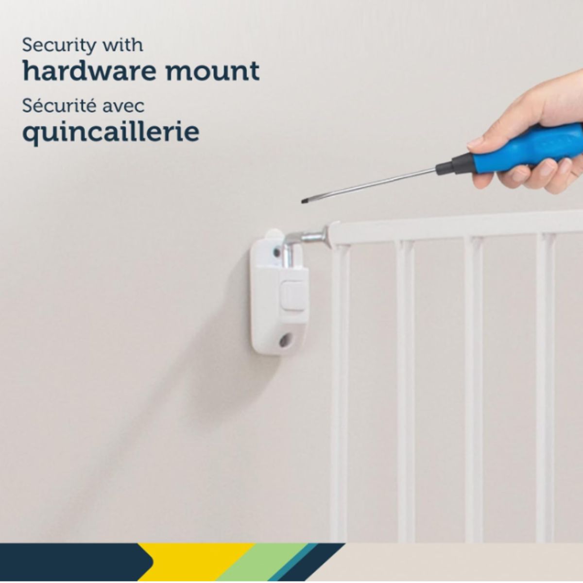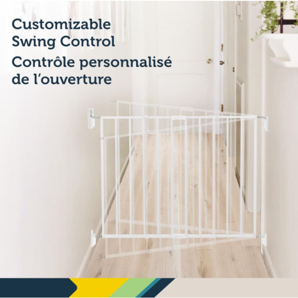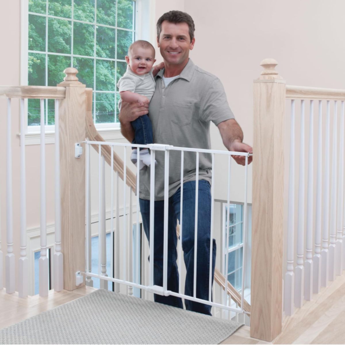 Expanding metal gate by Safety 1st offers adjustable width for top of stairs safety. It features a secure hardware mount design for Canadian homes.
