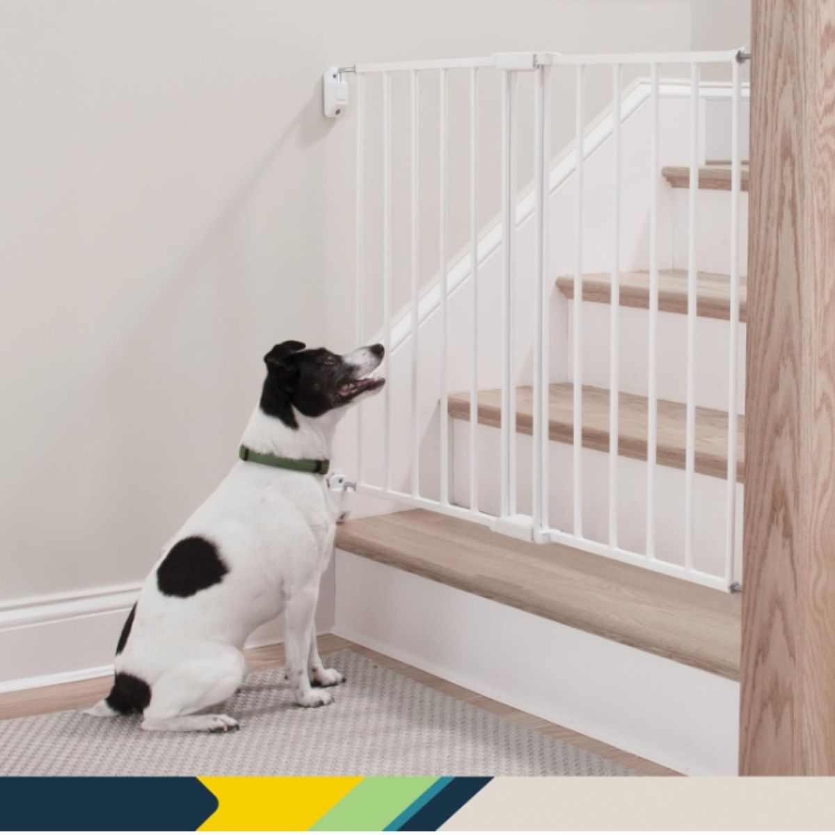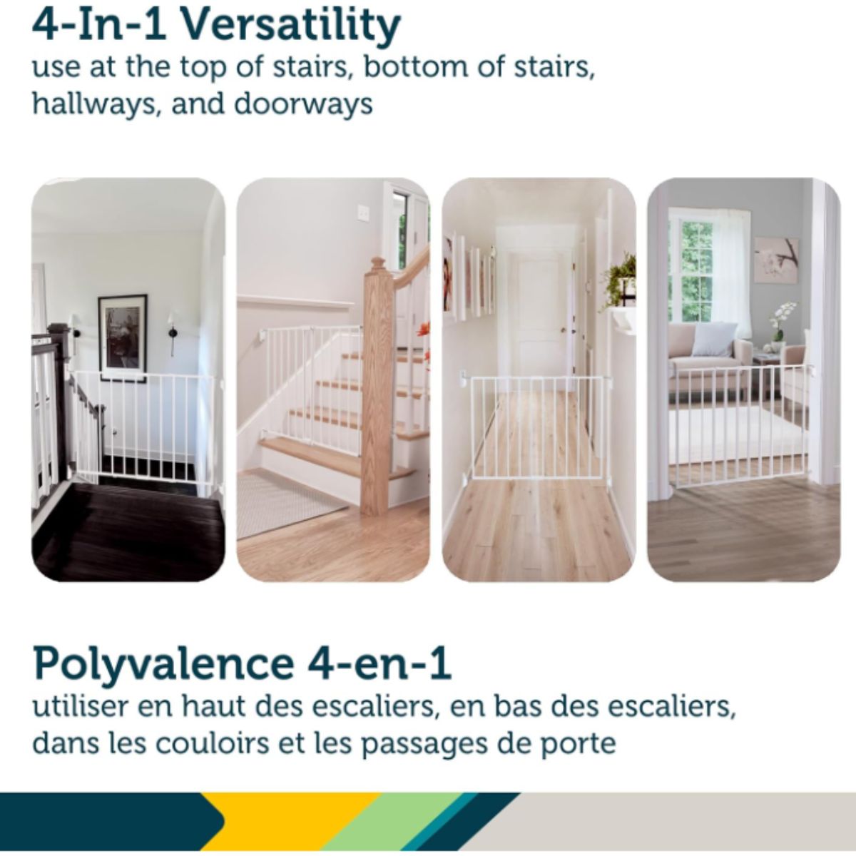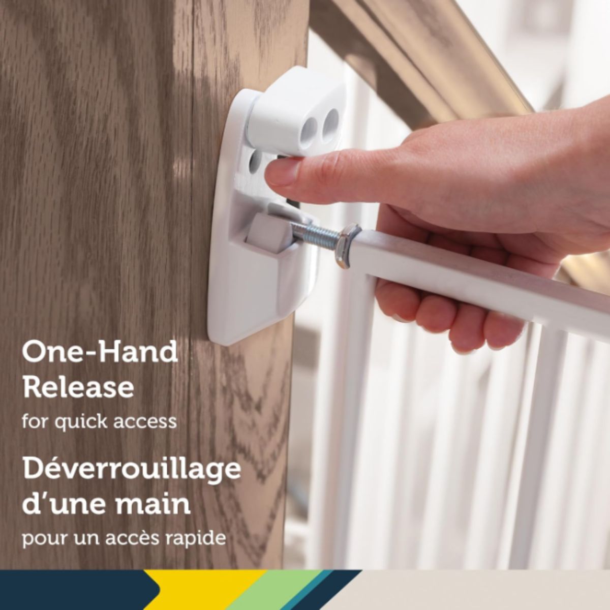 Expanding metal gate by Safety 1st offers adjustable width for top of stairs safety. It features a secure hardware mount design for Canadian homes.
