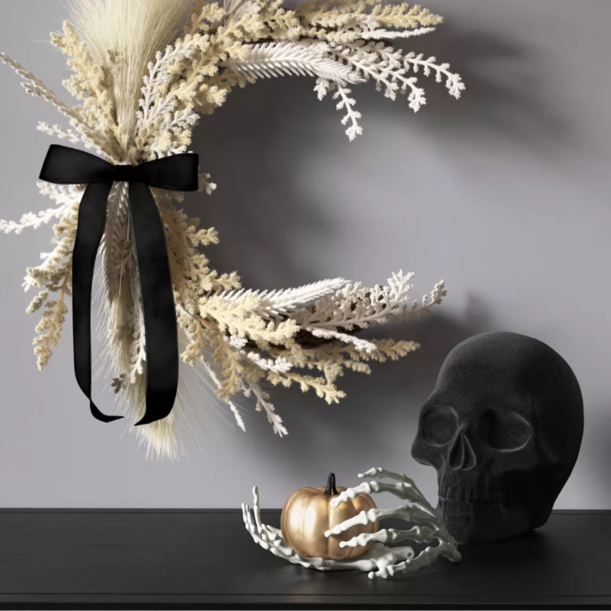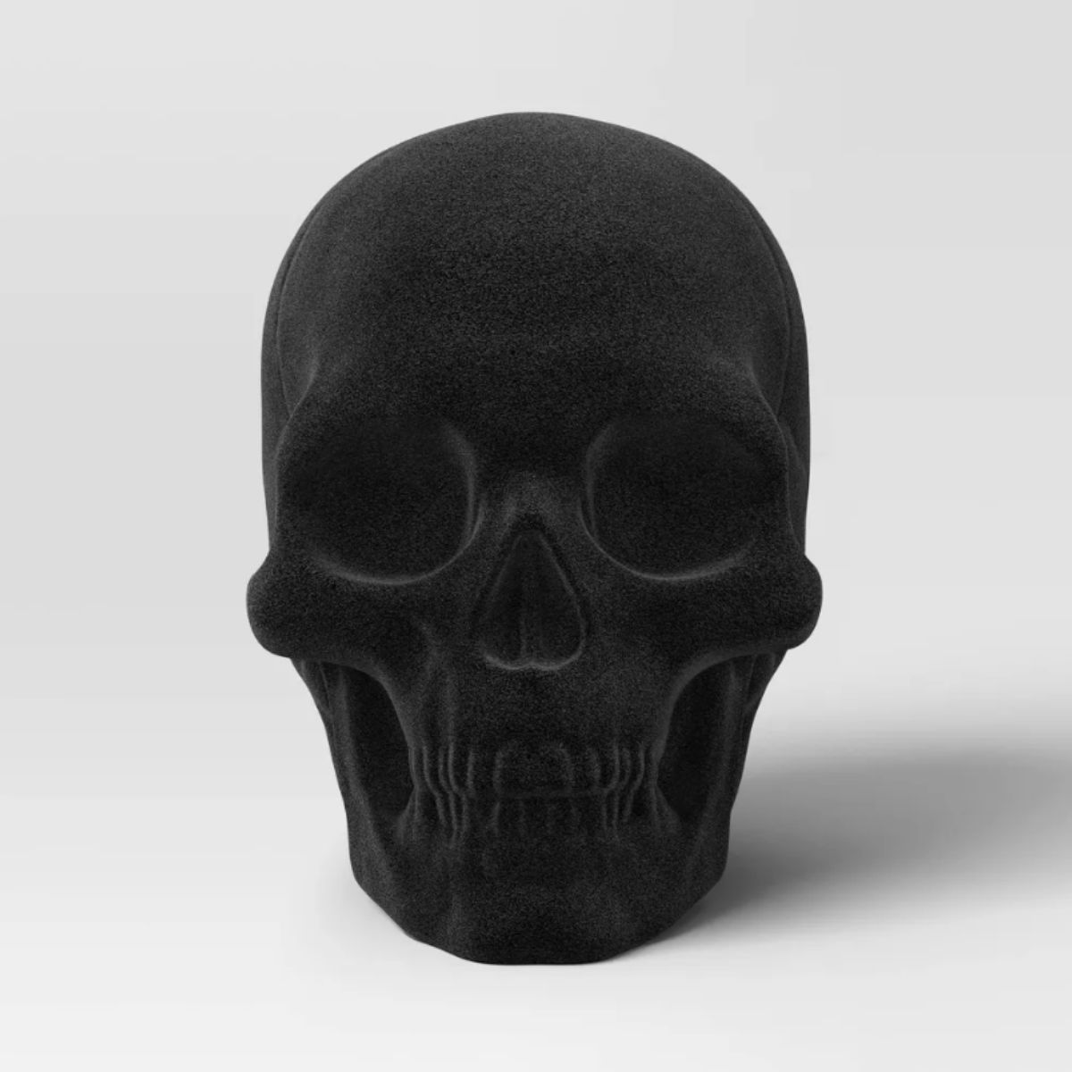 The flocking skull figurine by Plastic adds spooky charm to any space. Ideal for Halloween décor and festive flair.