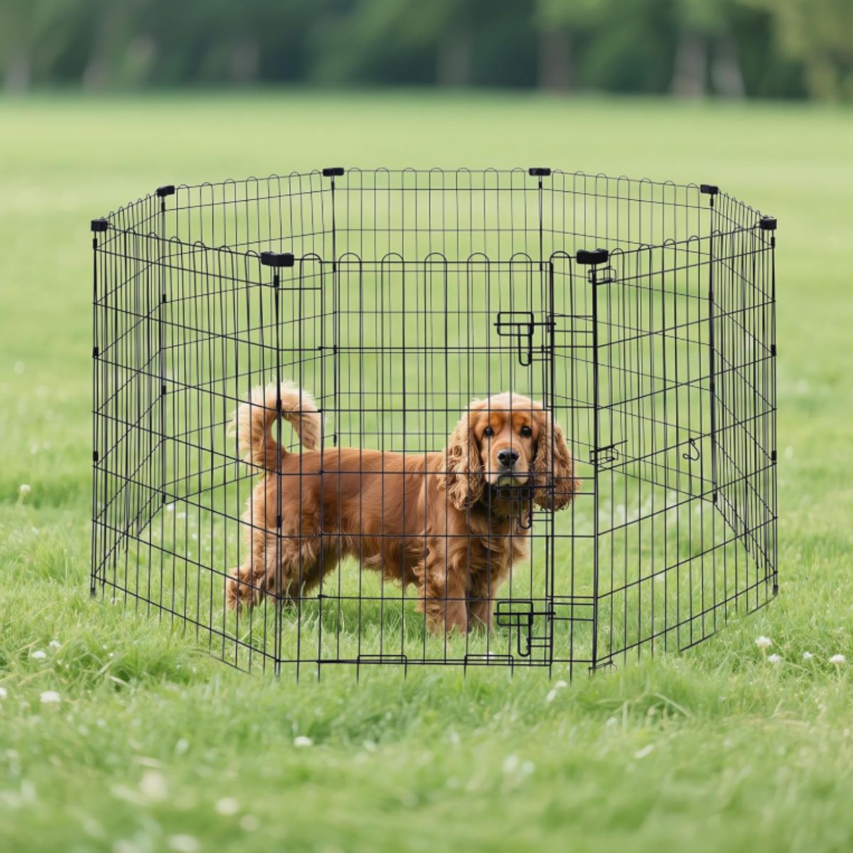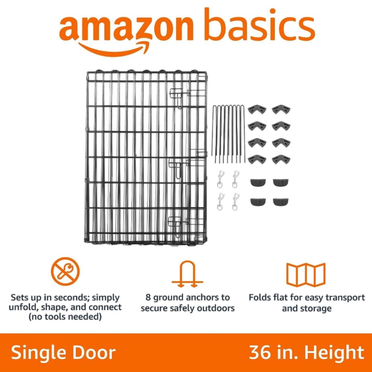 The foldable metal dog playpen by Amazon Basics is perfect for indoor and outdoor use. Easy to set up and fold, it provides a secure space for your medium-sized dog.