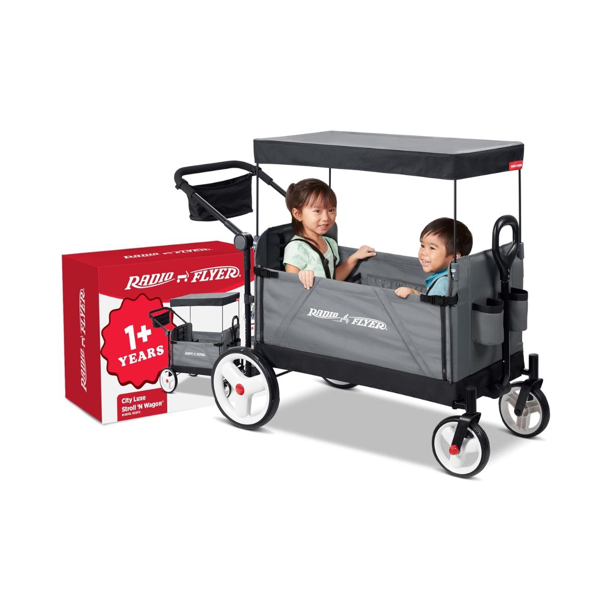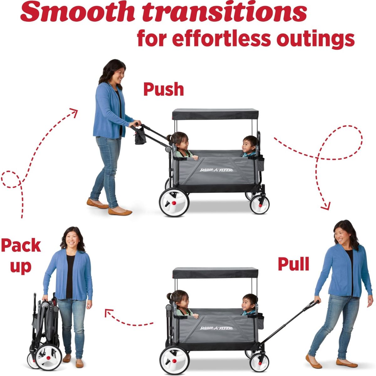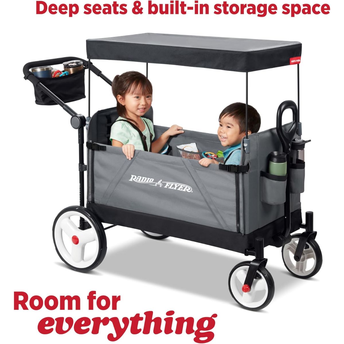 The folding push wagon offers convenience with internal storage pockets and a parent caddy. Perfect for easy transport and strolls.