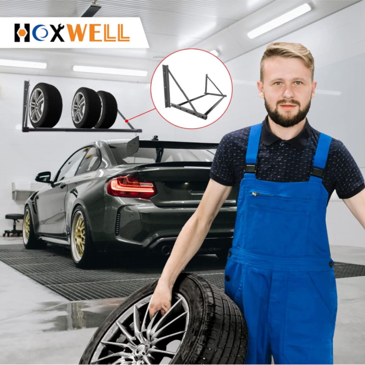 Folding wall mount tire rack by HOXWELL offers adjustable, heavy-duty storage for various tire sizes. Ideal for garages or workshops with space-saving design.