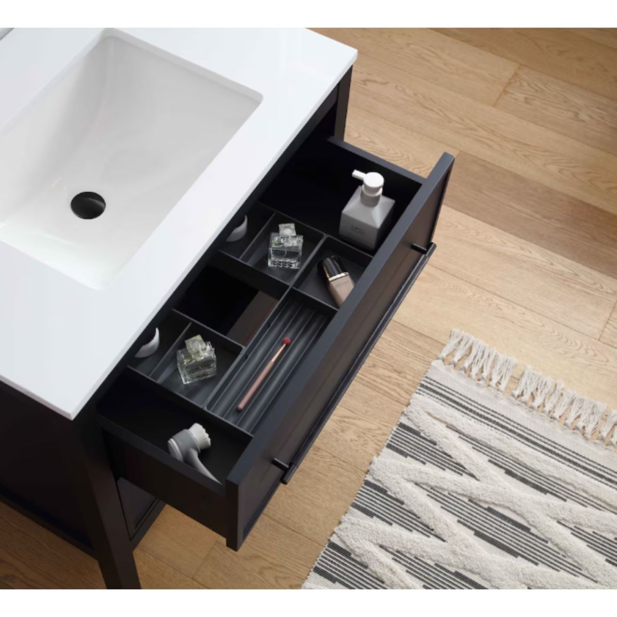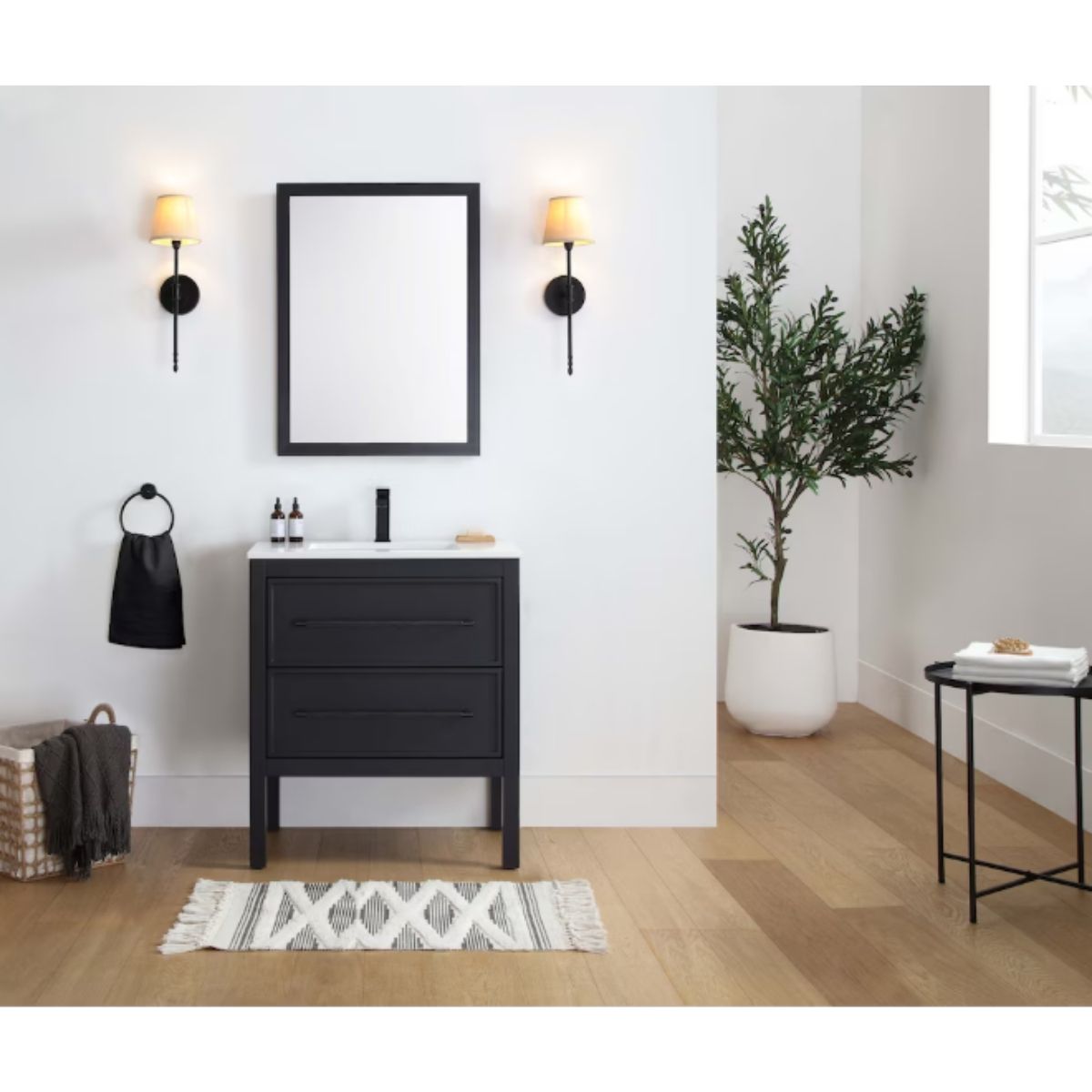 Freestanding bath vanity by Home Decorators offers a stylish black finish with a white engineered marble top. Perfect for organizing your bathroom essentials.