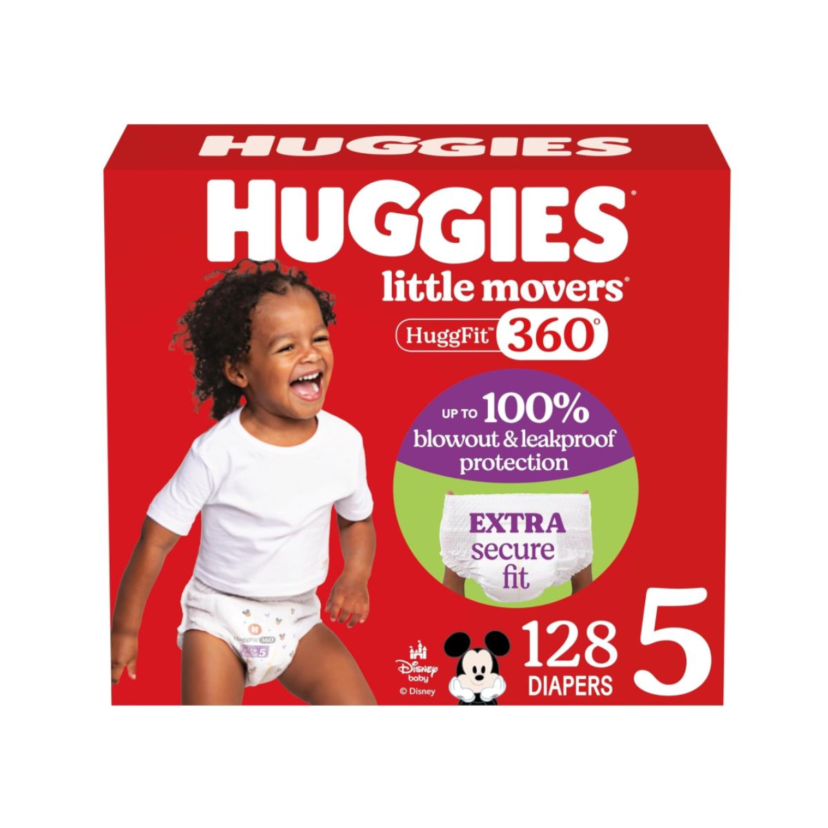 Huggies Size 5 Baby Diapers, Little Movers HuggFit 360degree Baby Diapers with 360degree Waistband, Size 5 (27+ lbs), 128 Count, Packaging May Vary