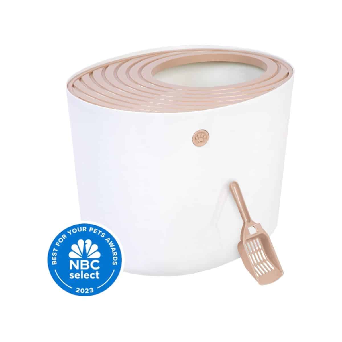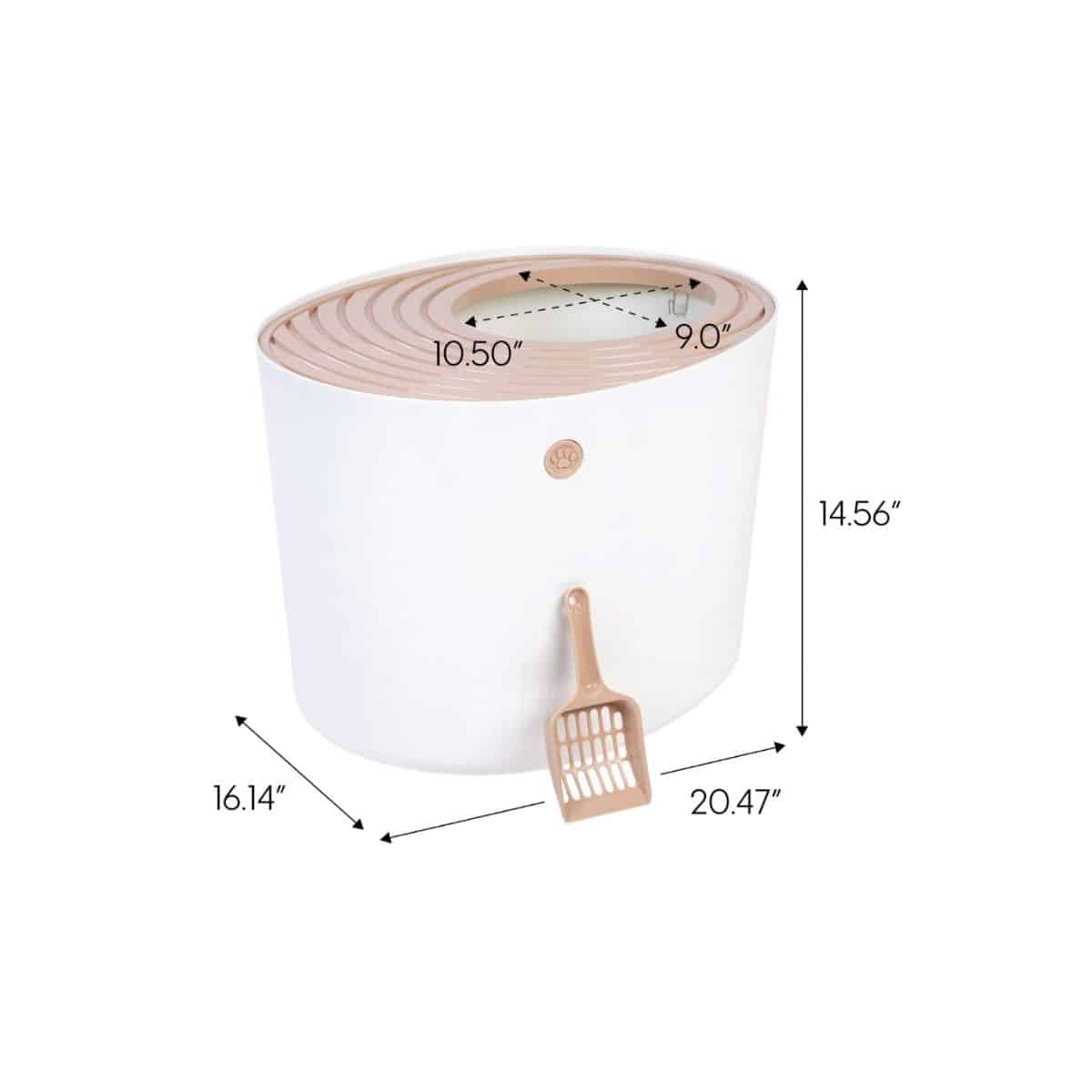 IRIS USA Top Entry Cat Litter Box with Scoop – Large – Stylish Enclosed Round Oval Kitty Dog Proof Box, Litiere Pour Chat Bac – White/Beige
