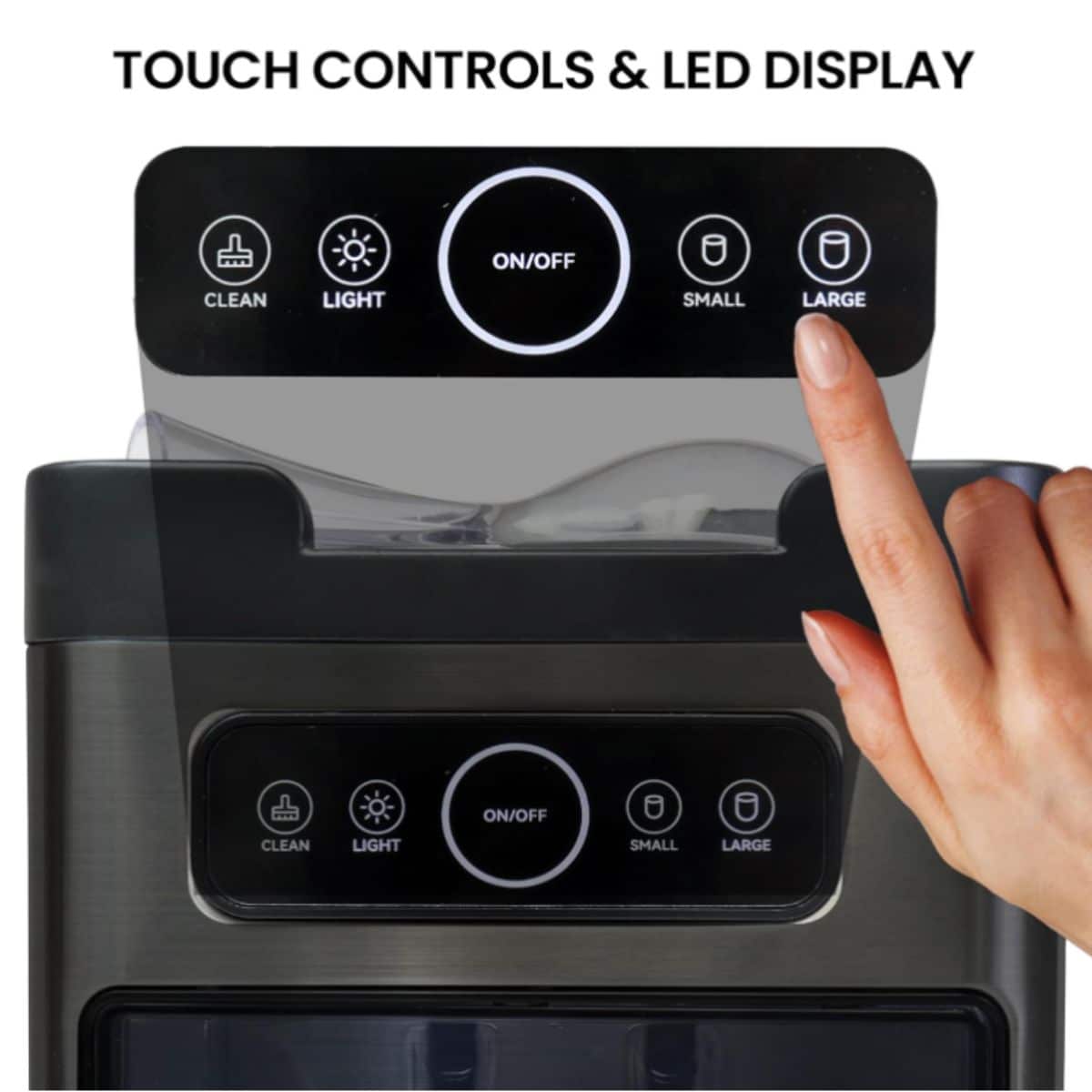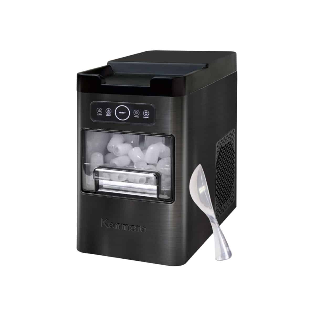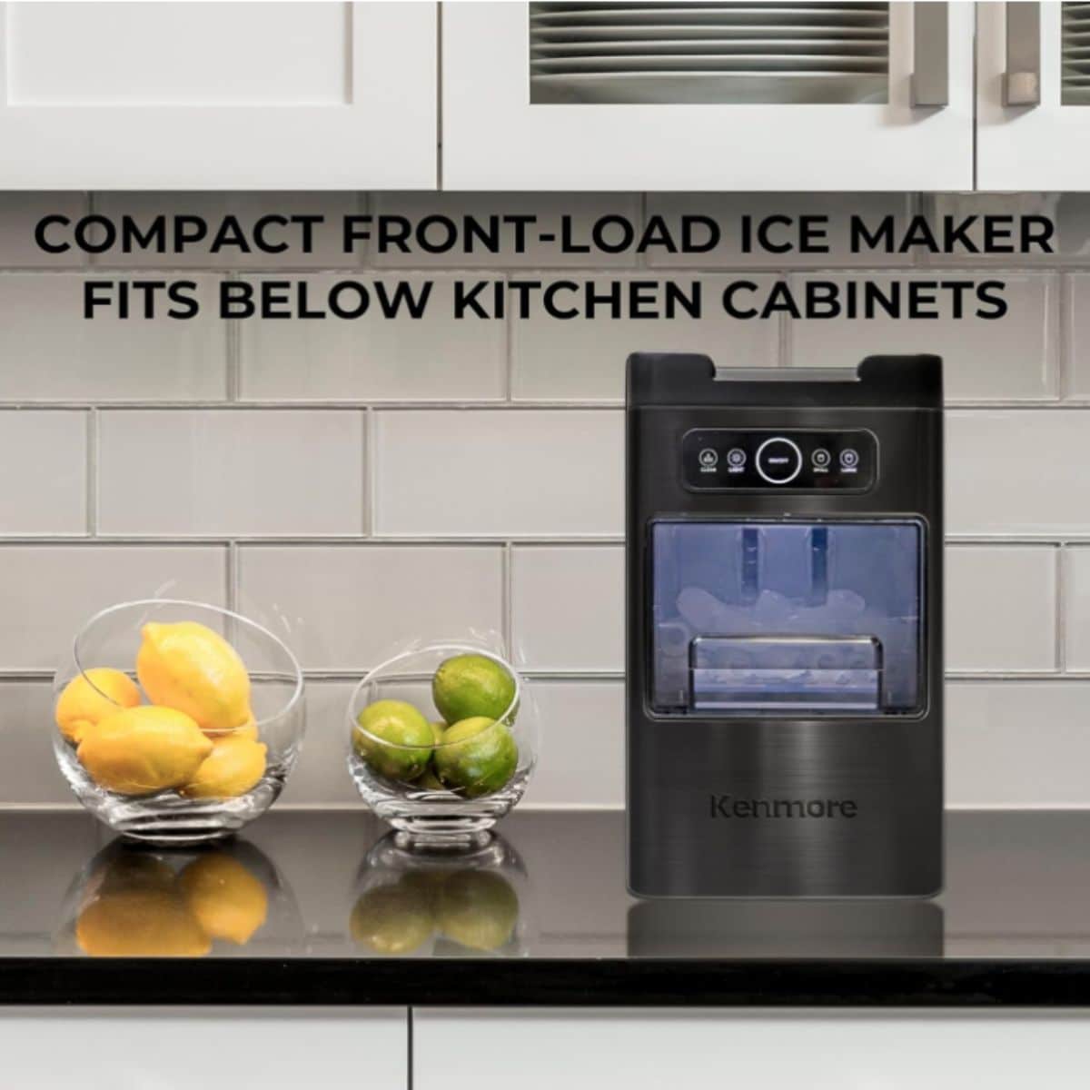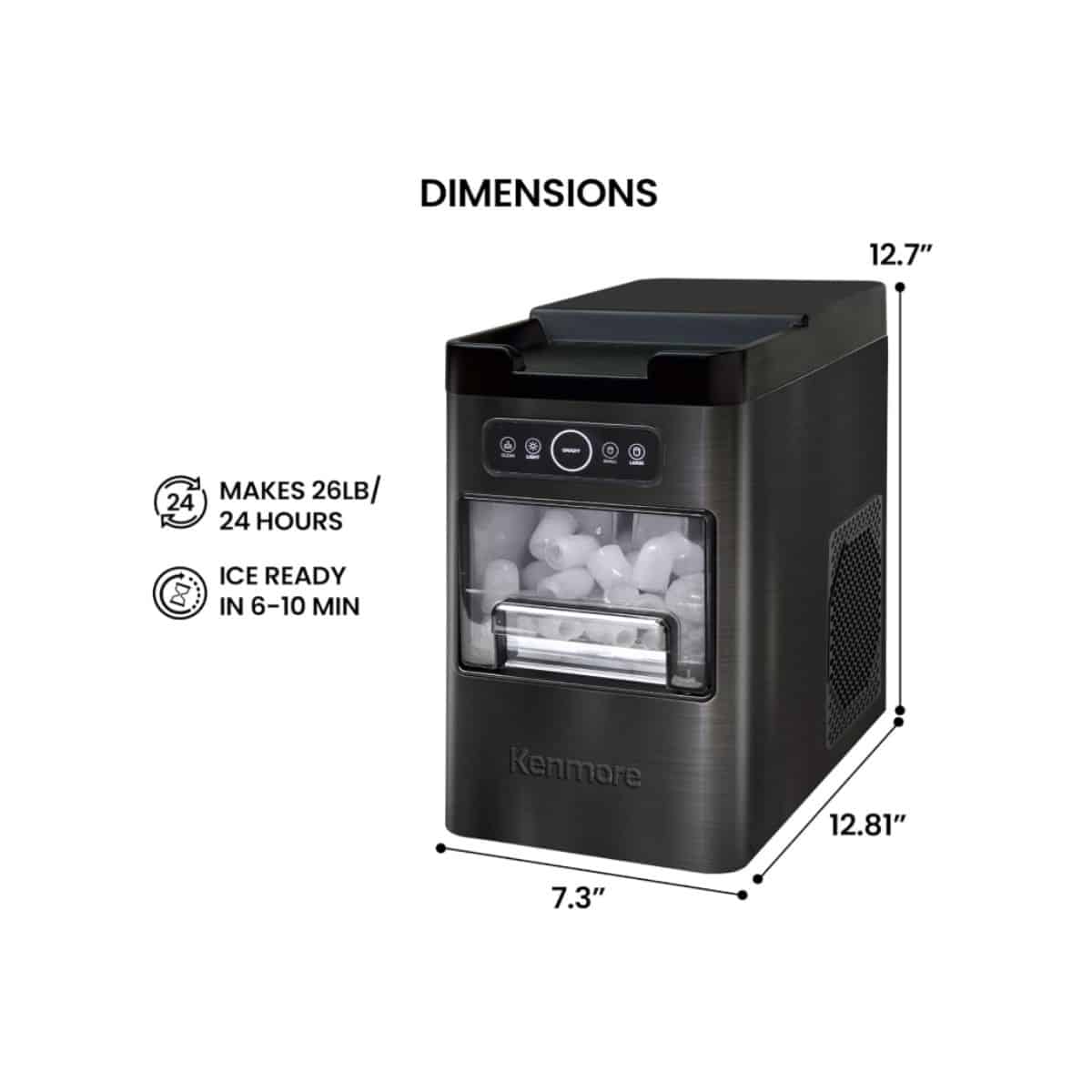 Kenmore Front Load Ice Maker – Pellet Machine à Glace, Serves 9 Pebble Ice Cubes in 6 mins, Crunchy Ice Nugget for Drinks, Self Cleaning Portable 26 Lbs/24Hrs Capacity, Stainless Steel Black