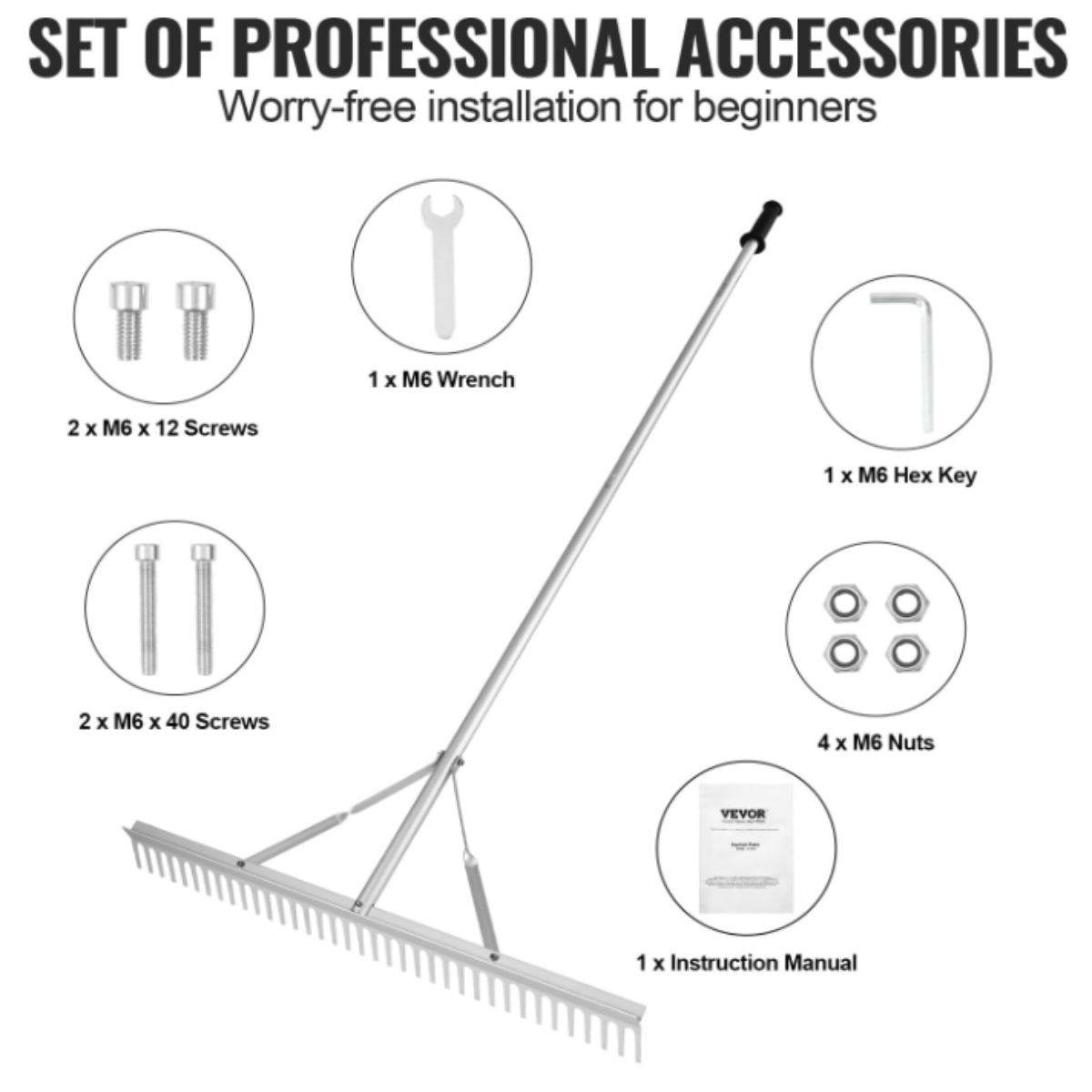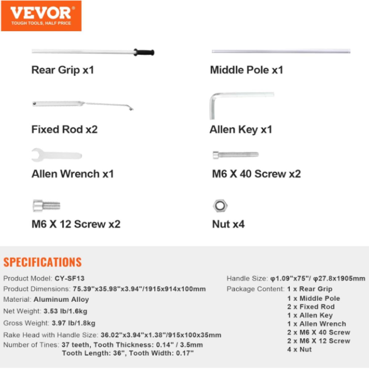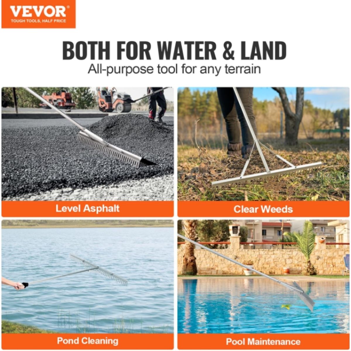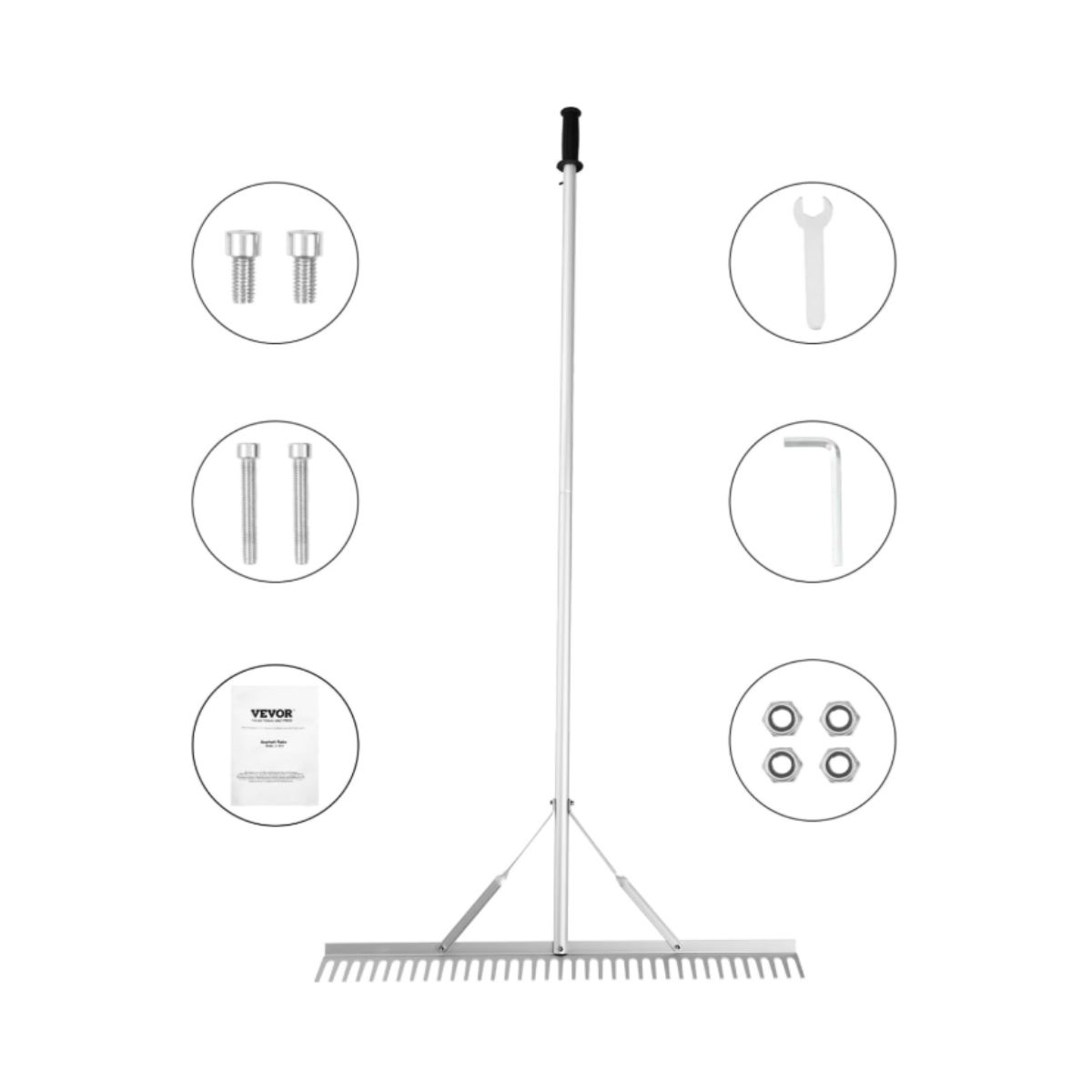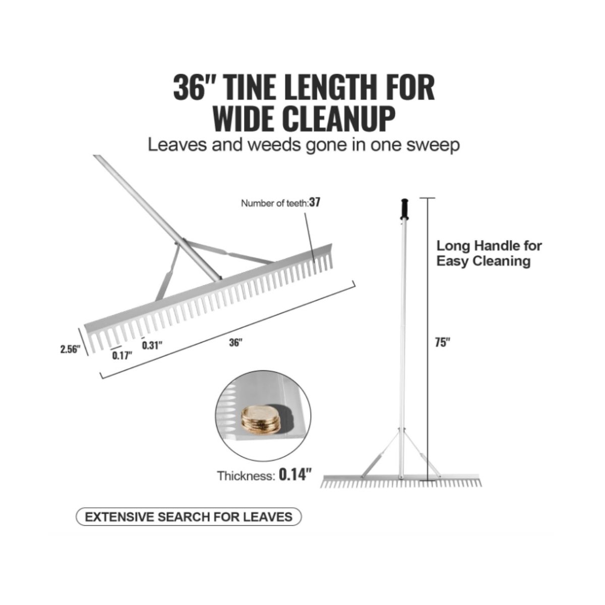 The landscape rake by Vevor features a 36 inch head and 75 inch handle, perfect for lawn care, loosening soil and garden weeding. Durable and versatile for all tasks.