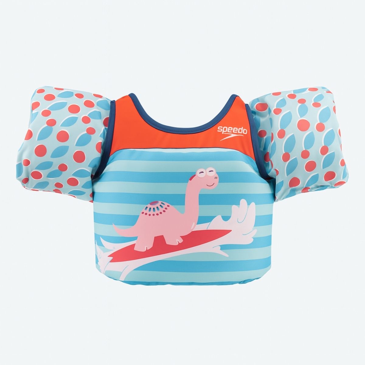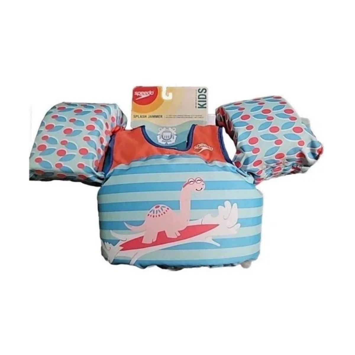 Life jacket swim vest from Speedo designed for kids weighing 33-55 lbs. Features a fun dinosaur design for safe and enjoyable water fun.