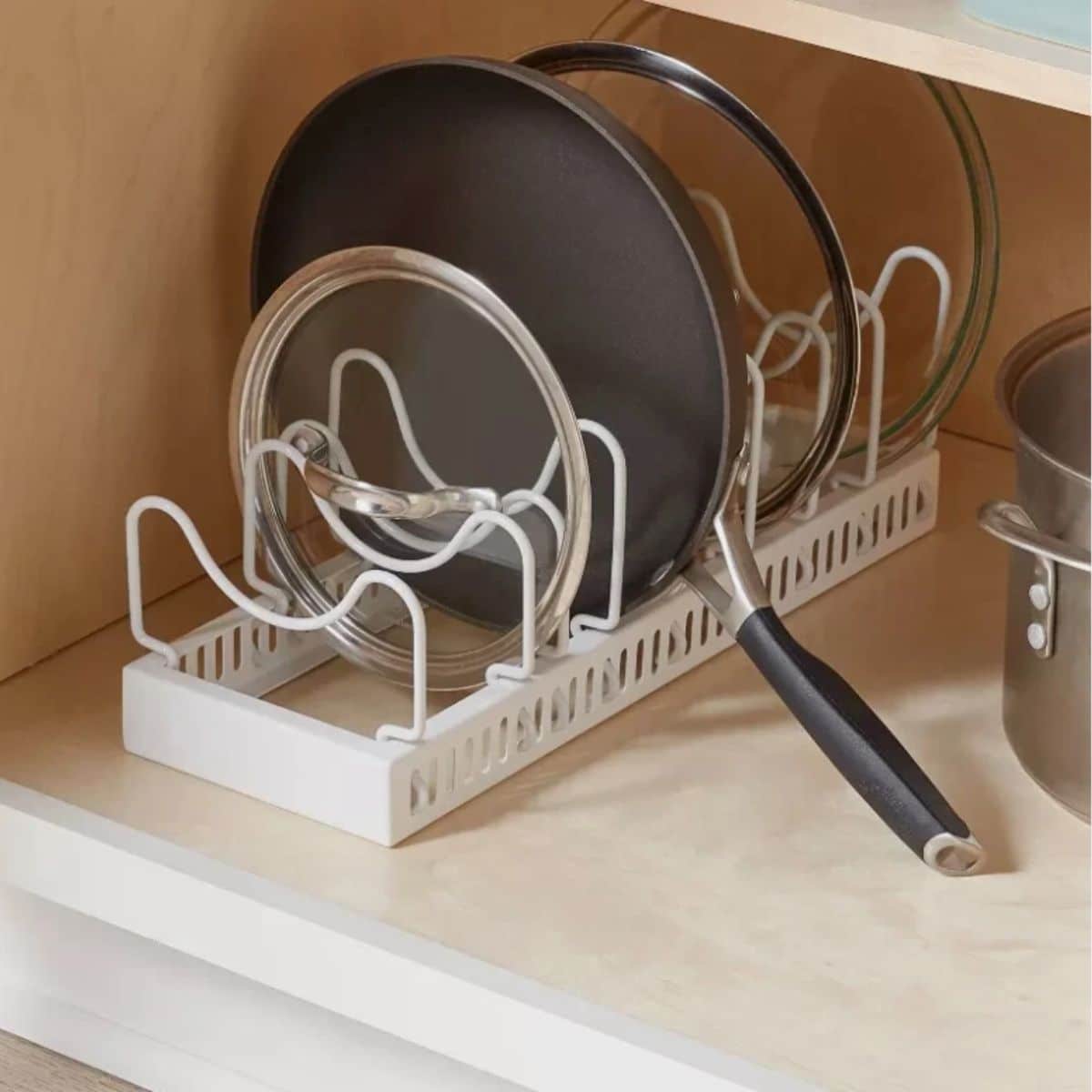 The metal lid and pan organizer by Brightroom helps maximize your kitchen space with adjustable slots for lids and pans in a sleek white finish.