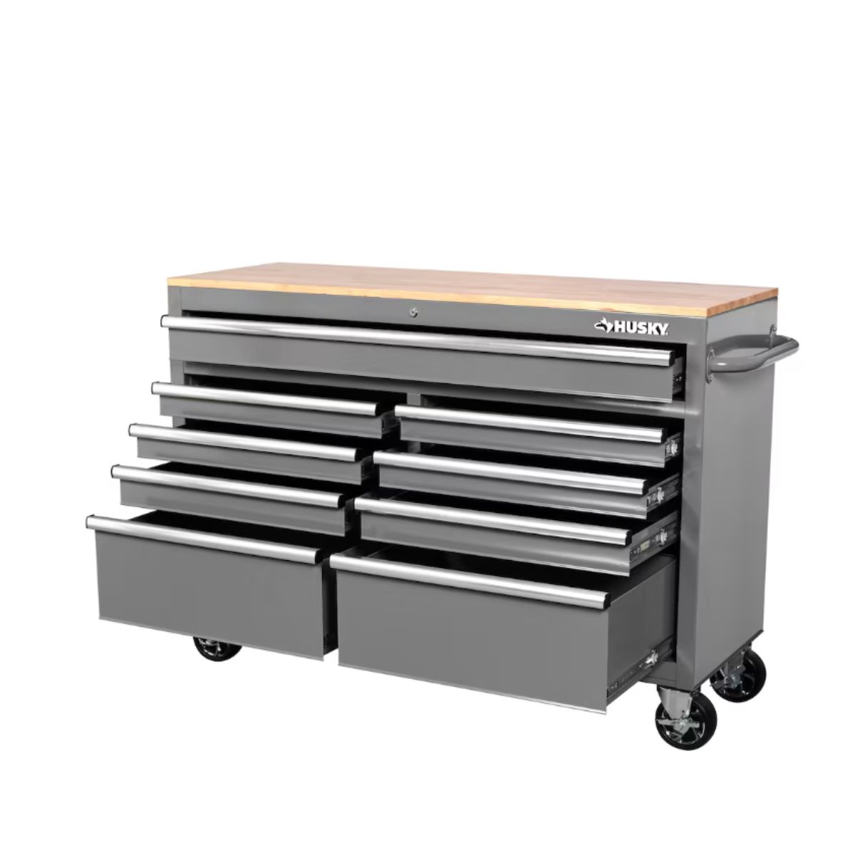 The mobile workbench by Husky offers a durable and spacious 9-drawer design with a solid wood top. Ideal for efficient workshop organization.