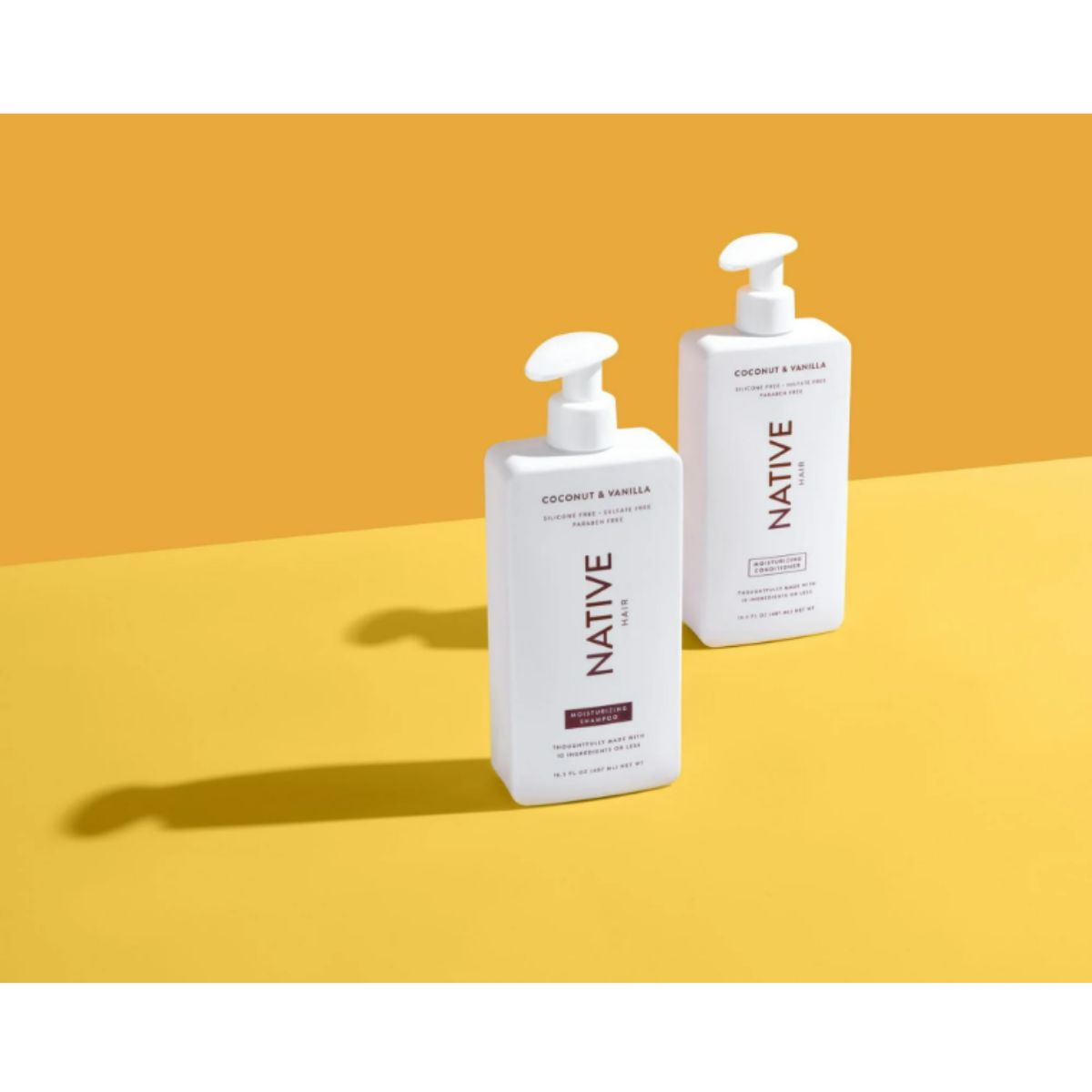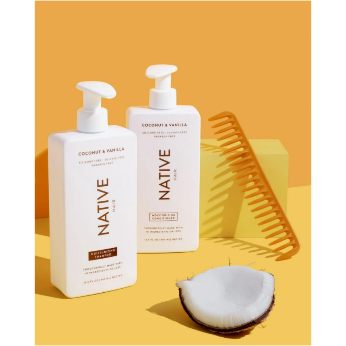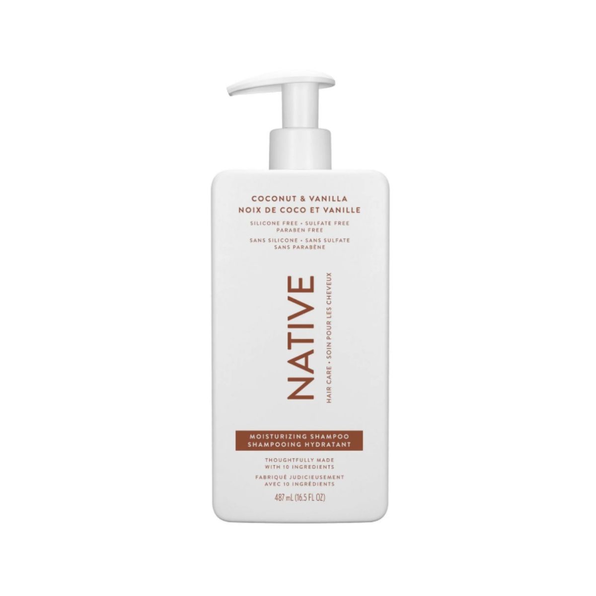Moisturizing shampoo by Native gently cleanses and replenishes moisture with a coconut and vanilla scent for healthy, soft hair.