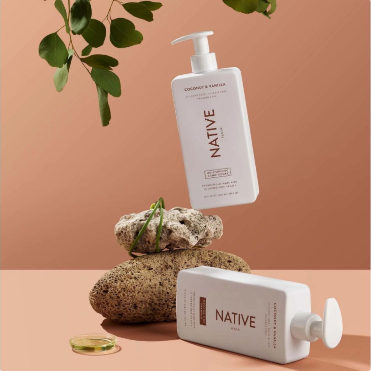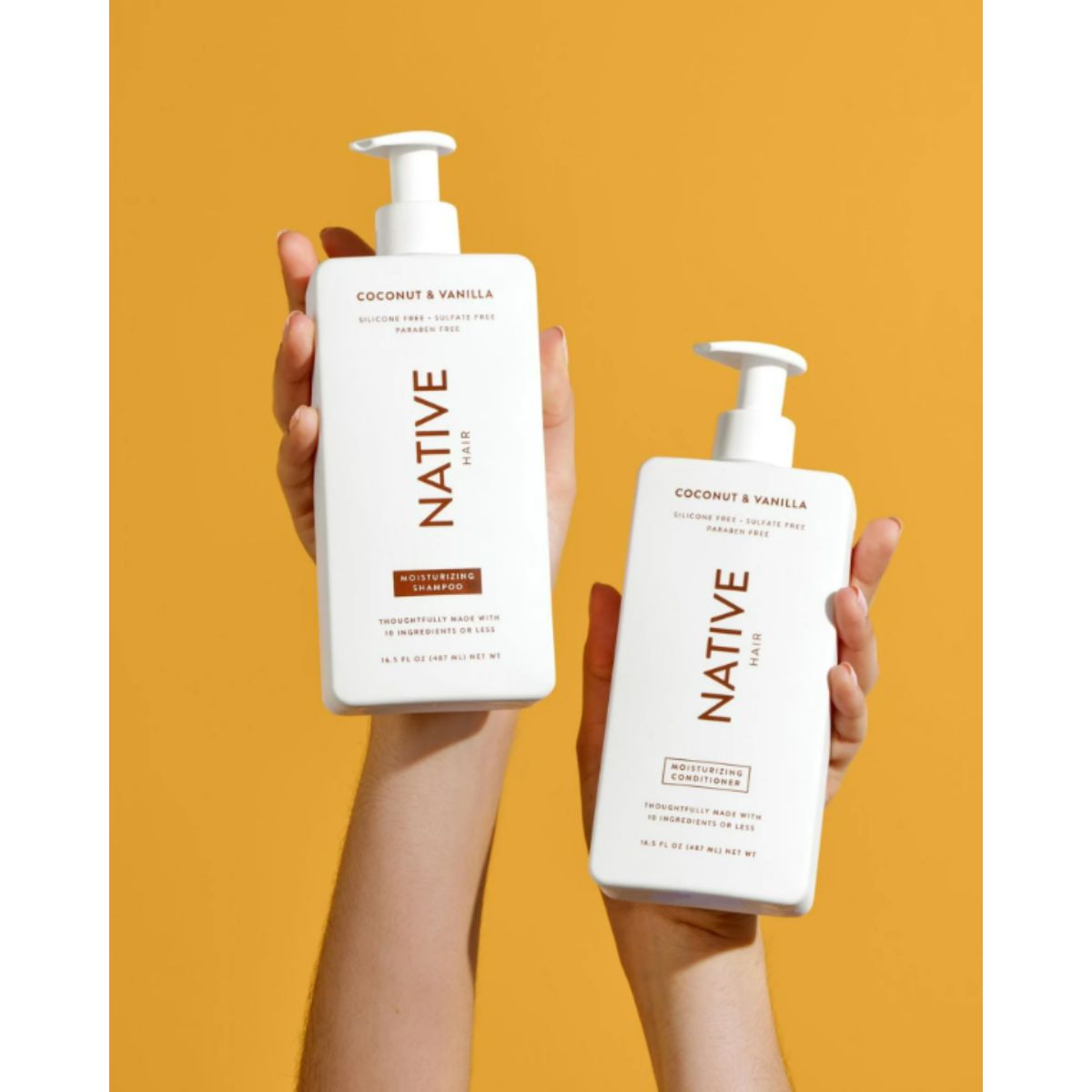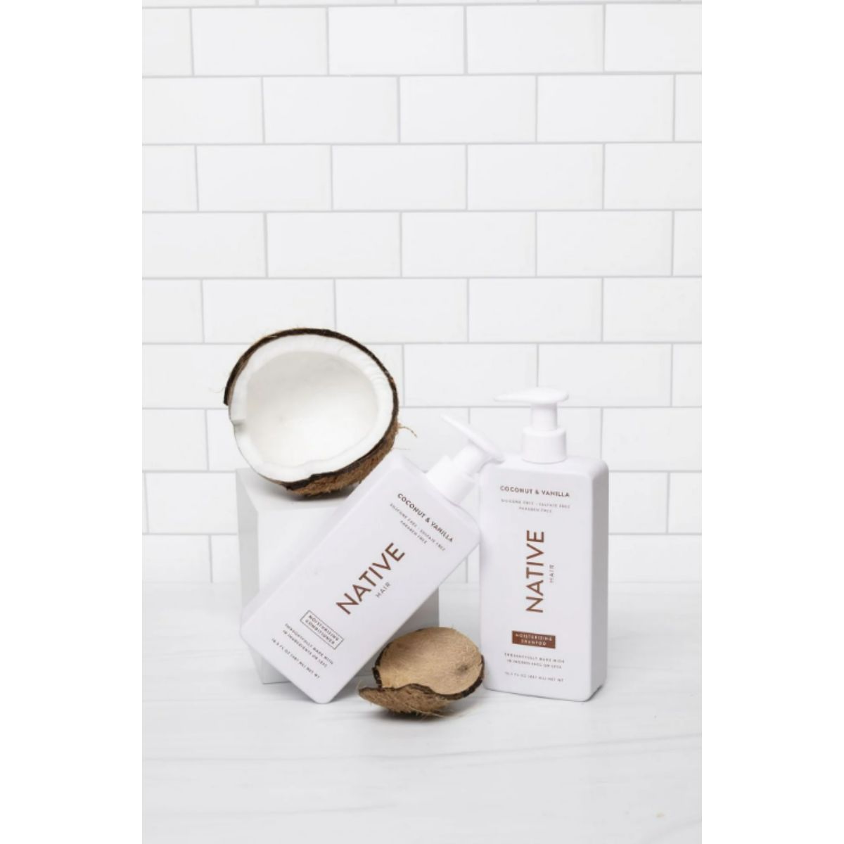 Moisturizing shampoo by Native gently cleanses and replenishes moisture with a coconut and vanilla scent for healthy, soft hair.