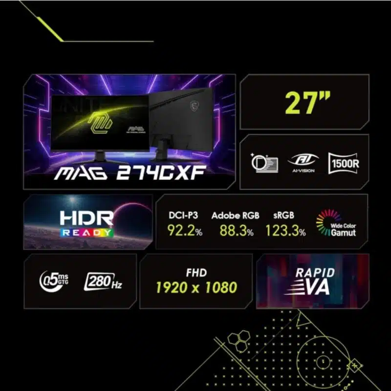 Discover exceptional quality with MSI MAG 274CXF, 27″ Curve Gaming Monitor. Msi designed this sleek product to elevates your everyday experience. customer favorite for exceptional results for its outstanding performance and value. enhances your productivity with every use.