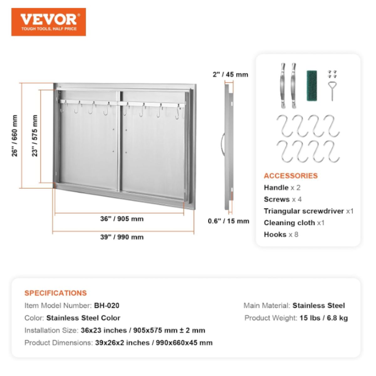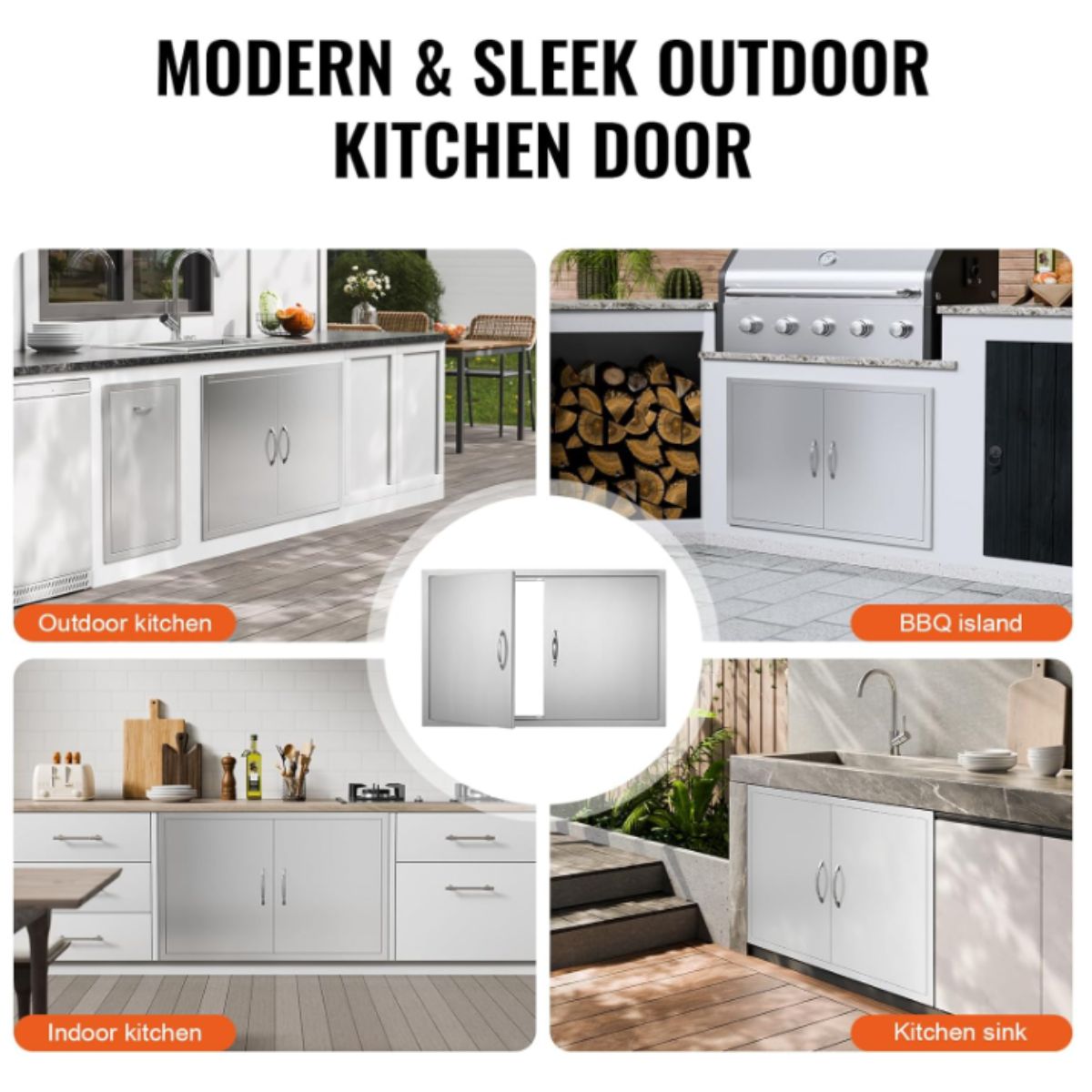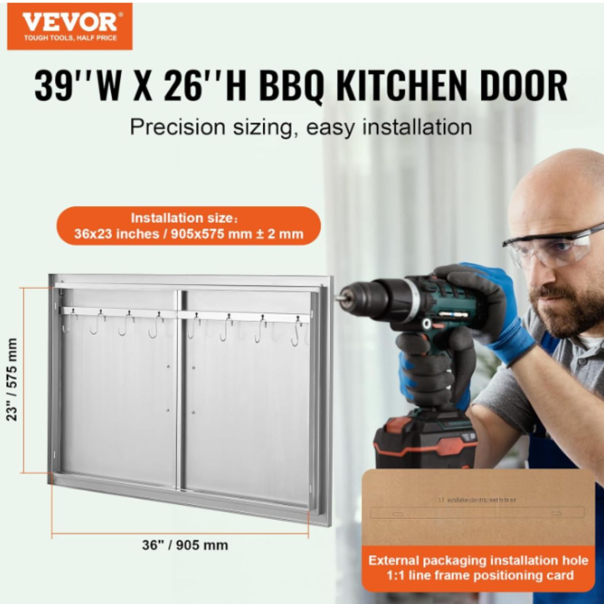 The outdoor stainless steel door by VEVOR is designed for BBQ islands. Durable and rust-proof, it offers an elegant and practical solution for your outdoor cooking area.