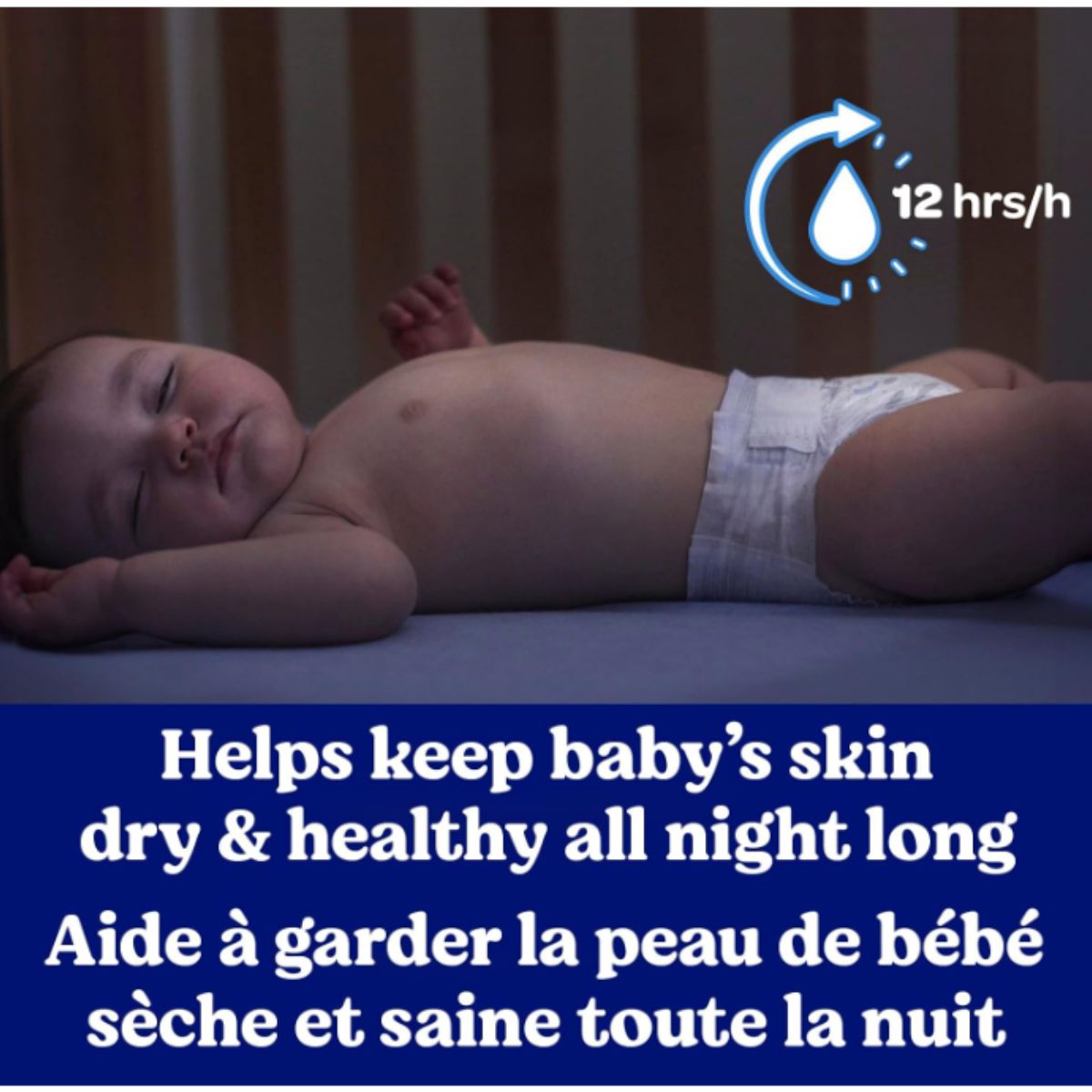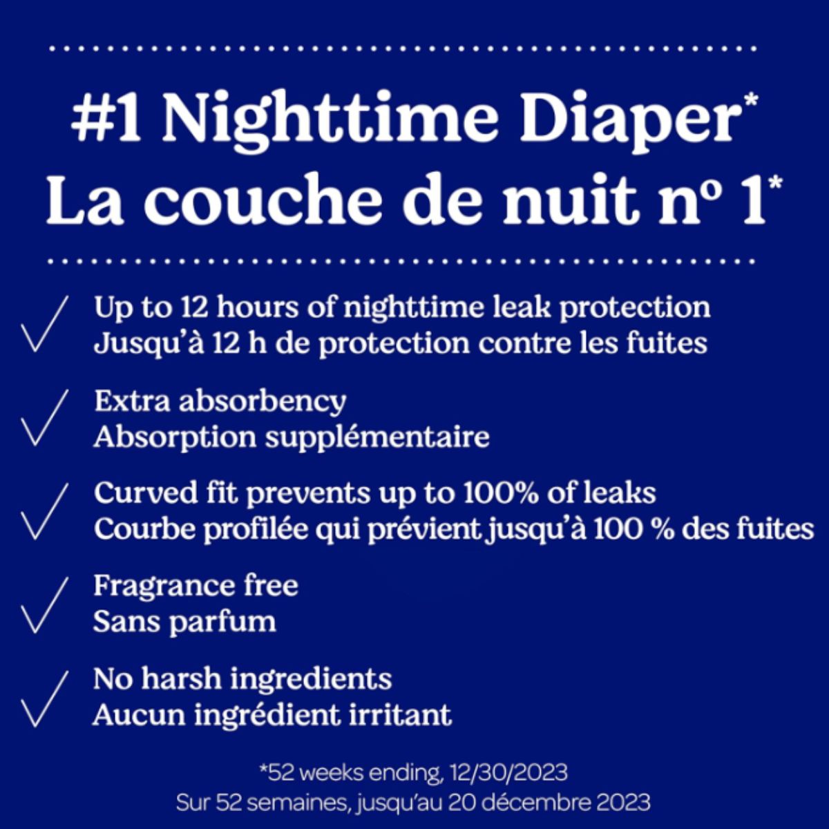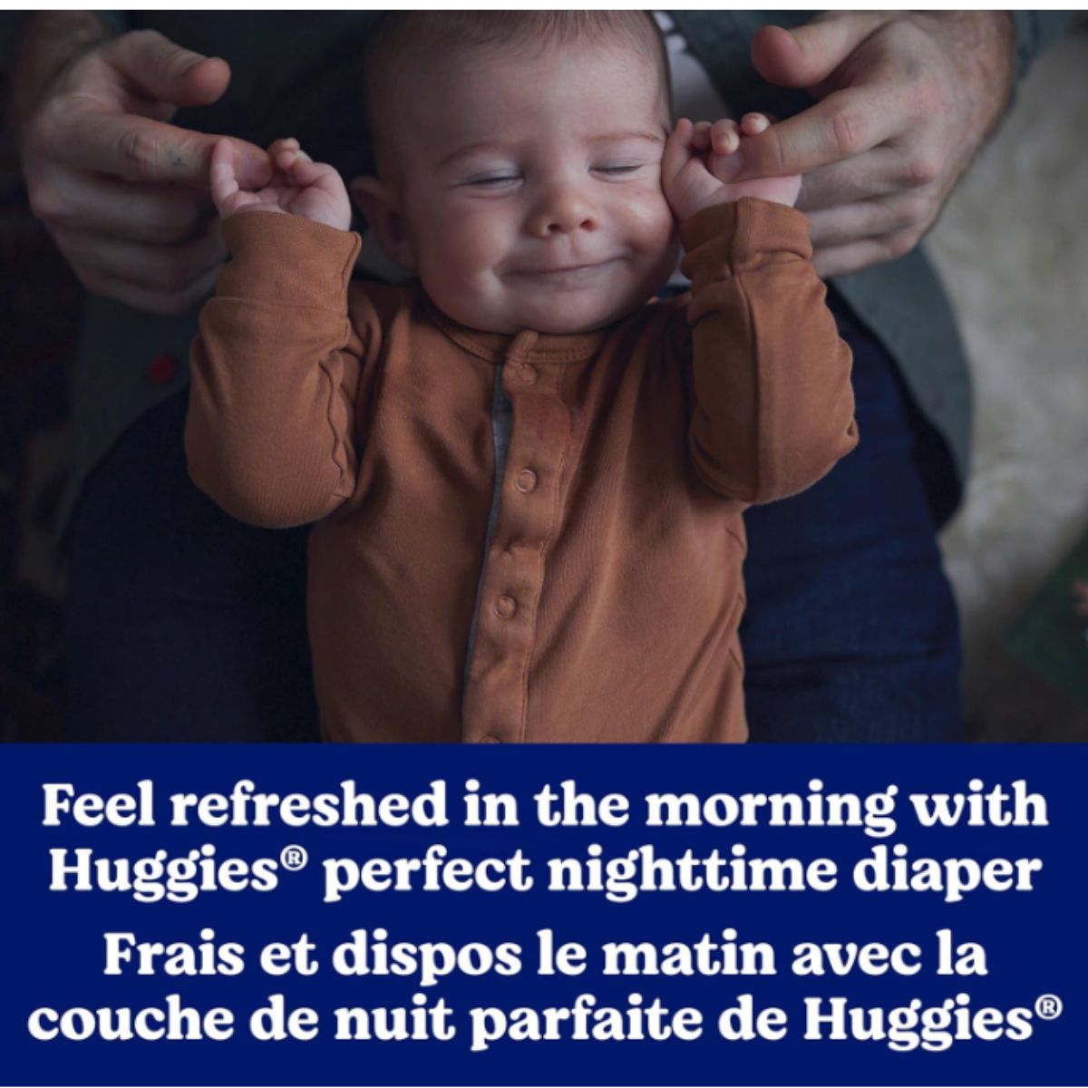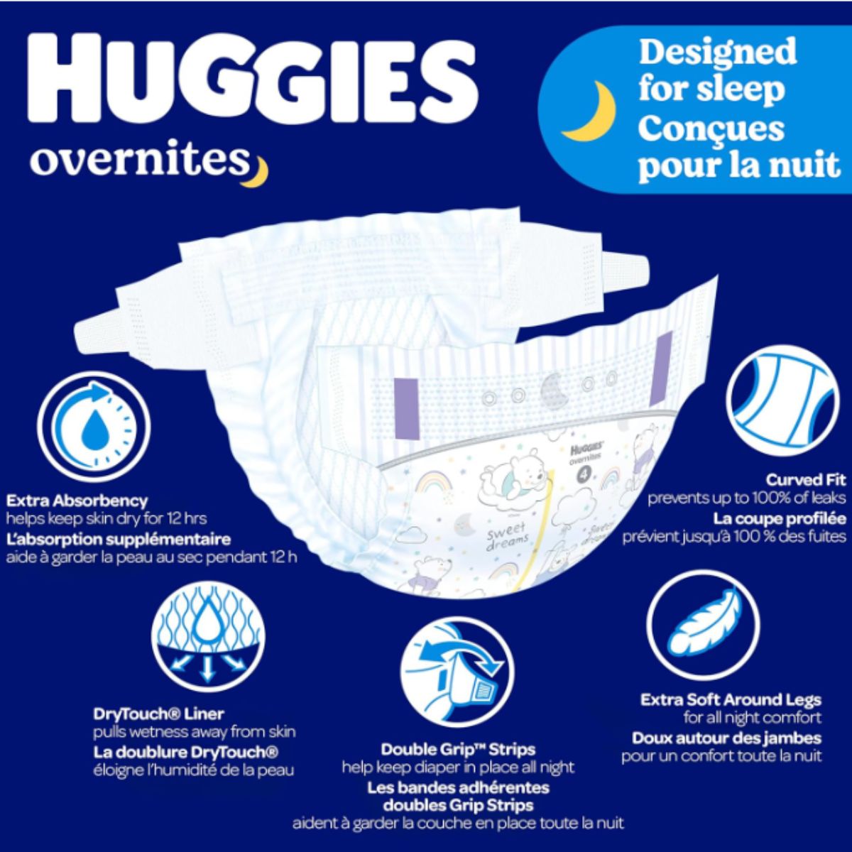 Overnight diapers by Huggies provide up to 12 hours of leak protection and comfort. These size 4 diapers are perfect for babies 22-37 lbs.