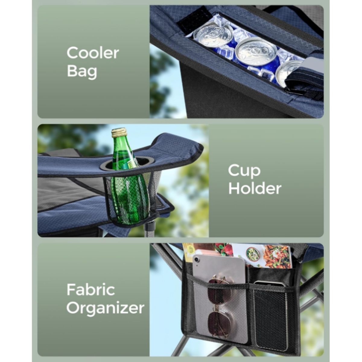 The oversized lumbar support camping chair by Songmics offers comfort and durability with a padded seat, adjustable armrests, and built-in cooler bag for outdoor adventures.