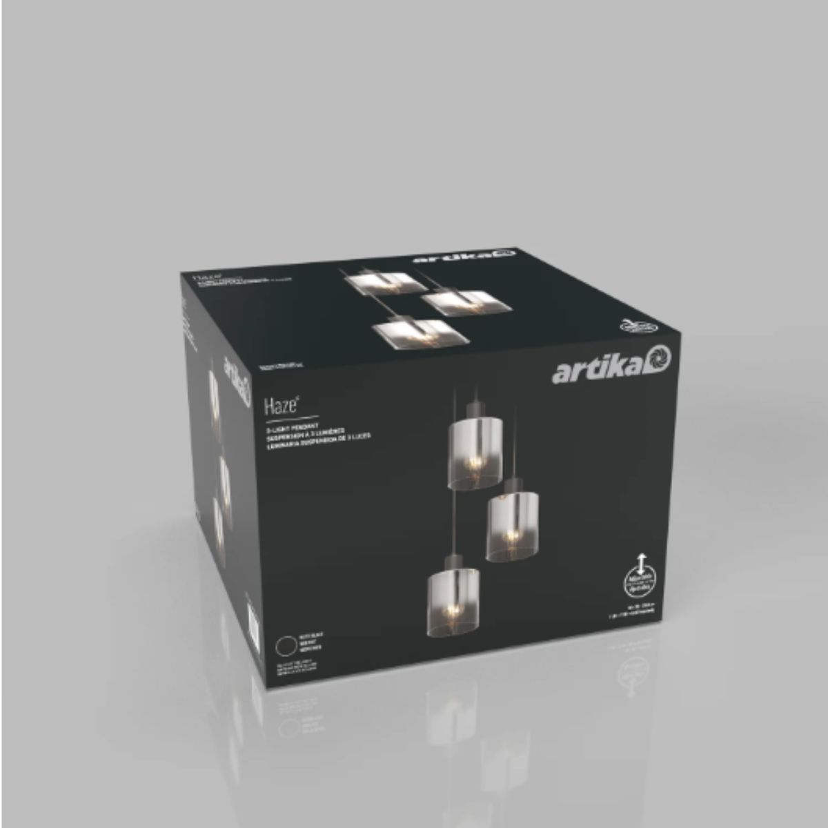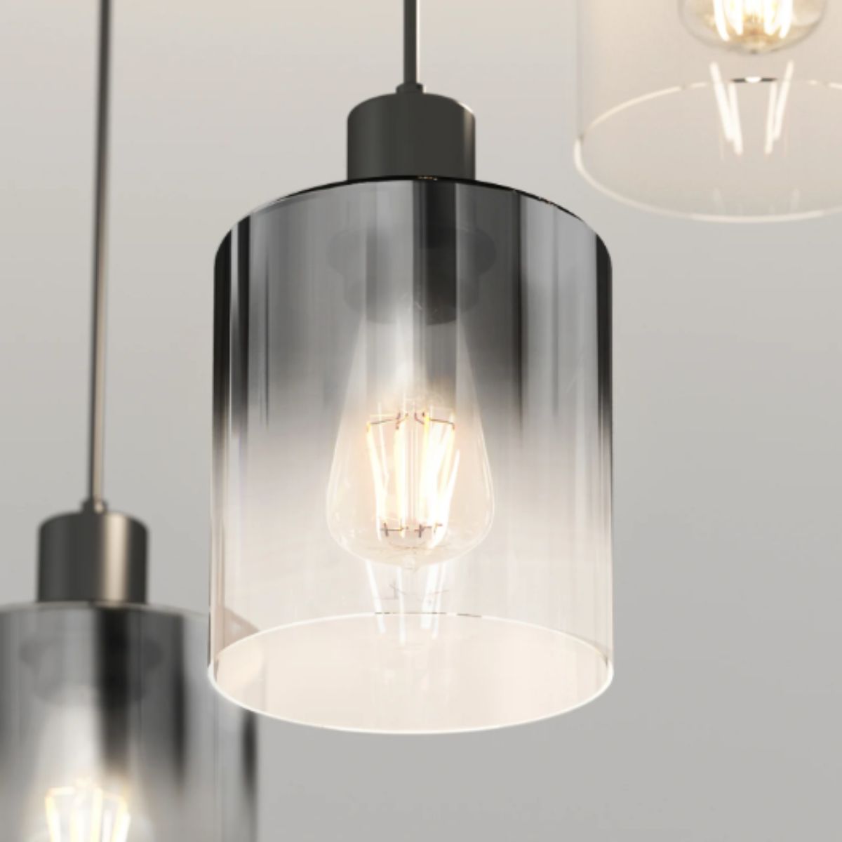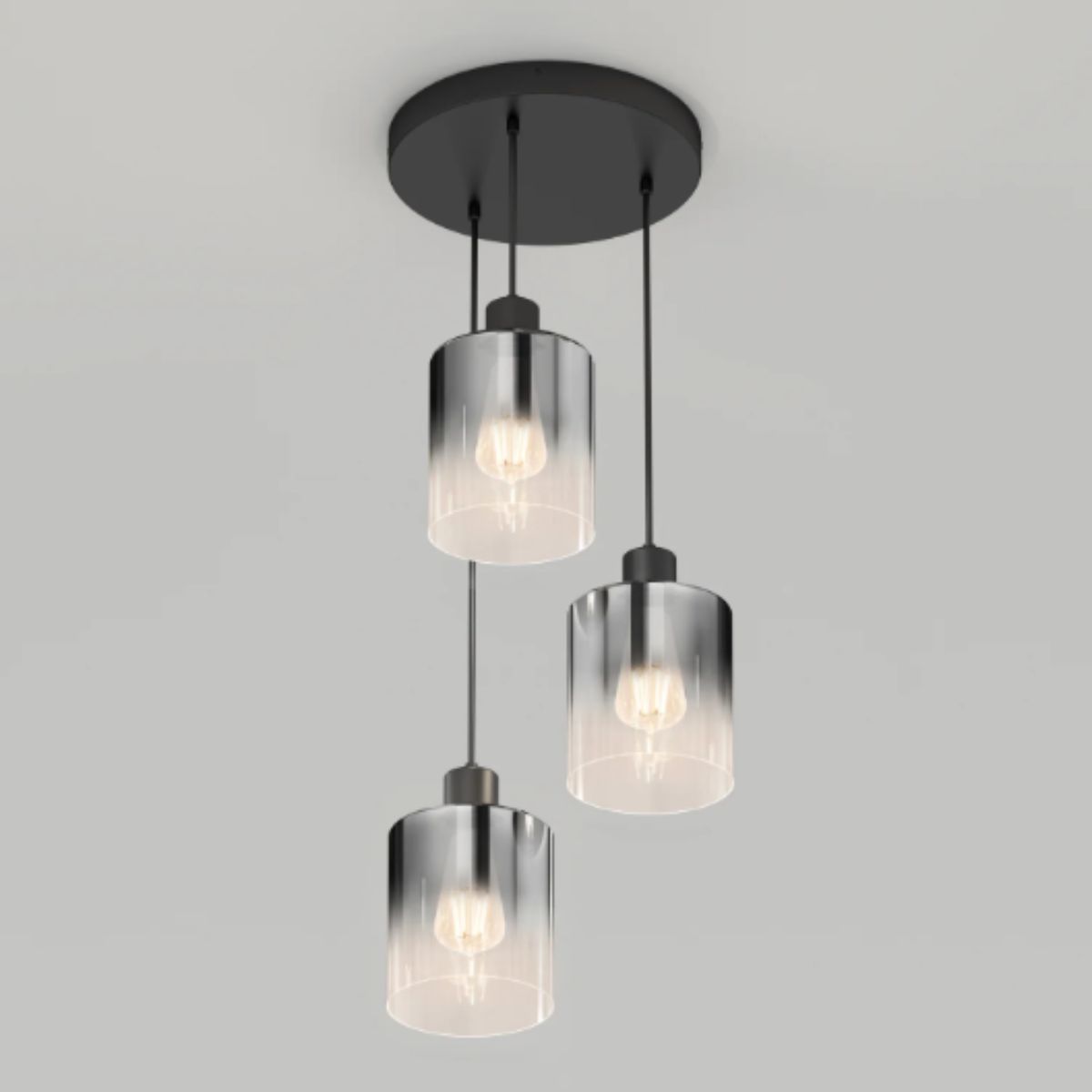 Pendant light by Artika offers a modern design with sleek black glass shades. Perfect for creating ambient lighting in any room.