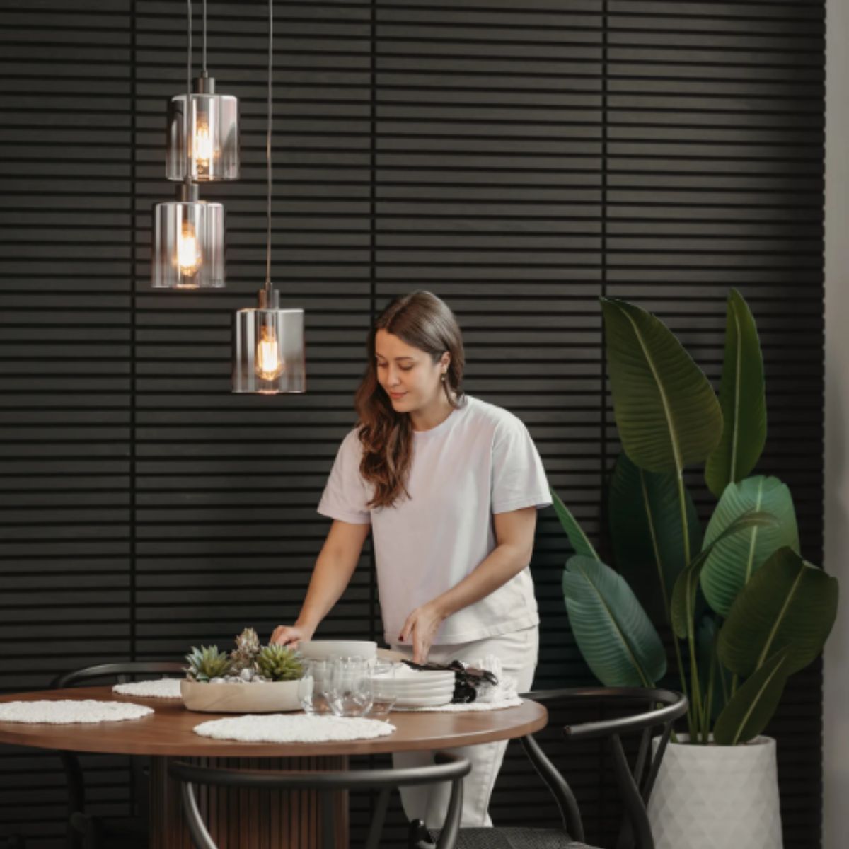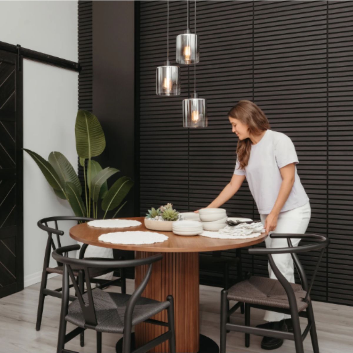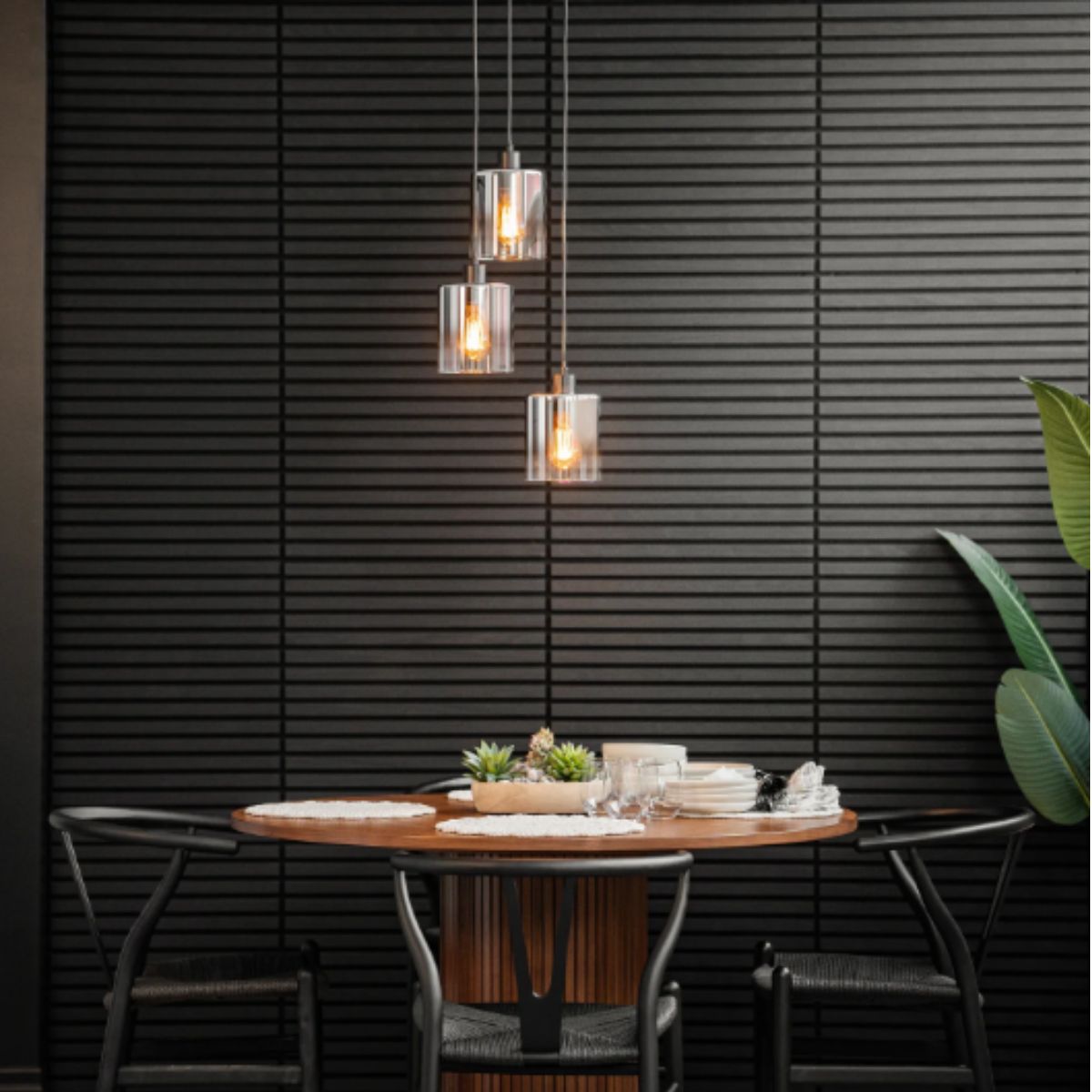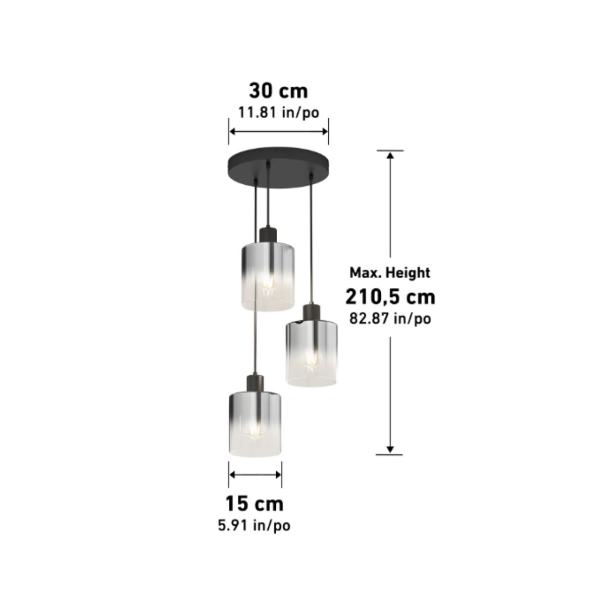 Pendant light by Artika offers a modern design with sleek black glass shades. Perfect for creating ambient lighting in any room.