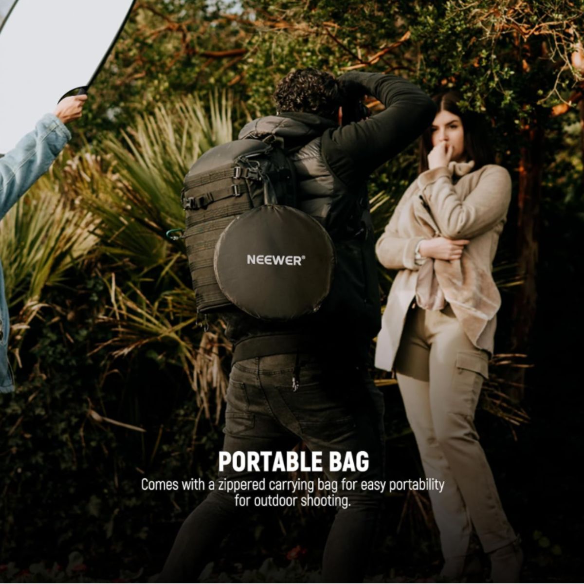 Photography reflector diffuser by NEEWER offers 5-in-1 lighting options for studio and outdoor use. Perfect for capturing the best lighting in photos.