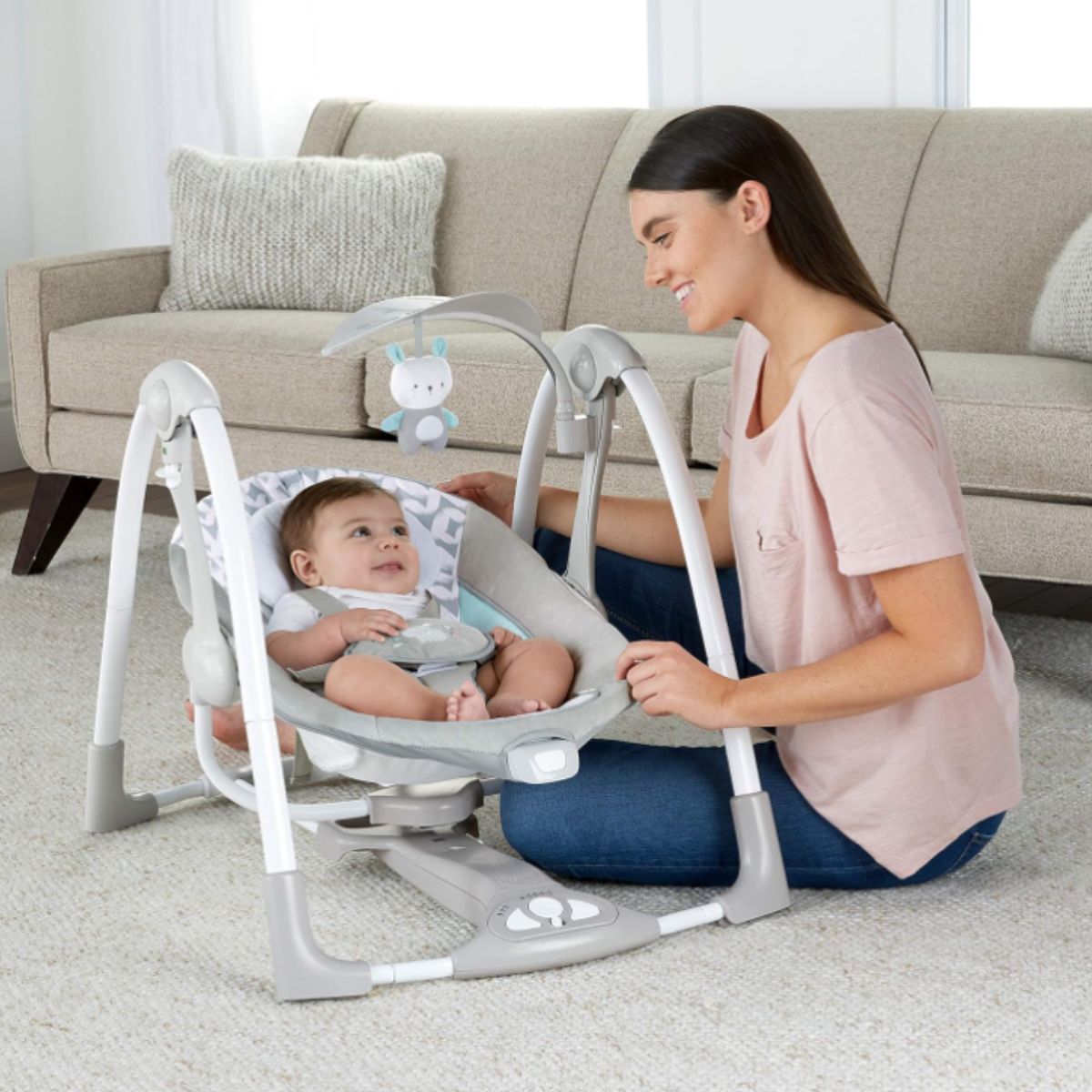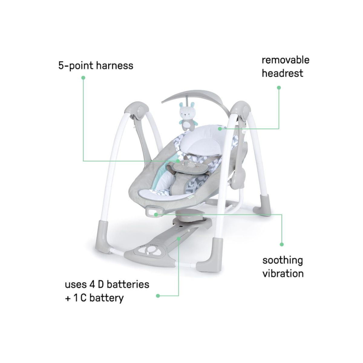 Portable baby swing by Ingenuity offers a compact, foldable 2-in-1 design ideal for babies up to 9 months. Enjoy soothing vibrations and calming nature sounds.