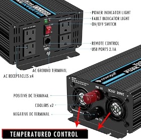 Power inverter by Novopal delivers 1000 Watts pure sine wave power with 4 AC outlets and a USB port. Perfect for reliable power conversion in vehicles.